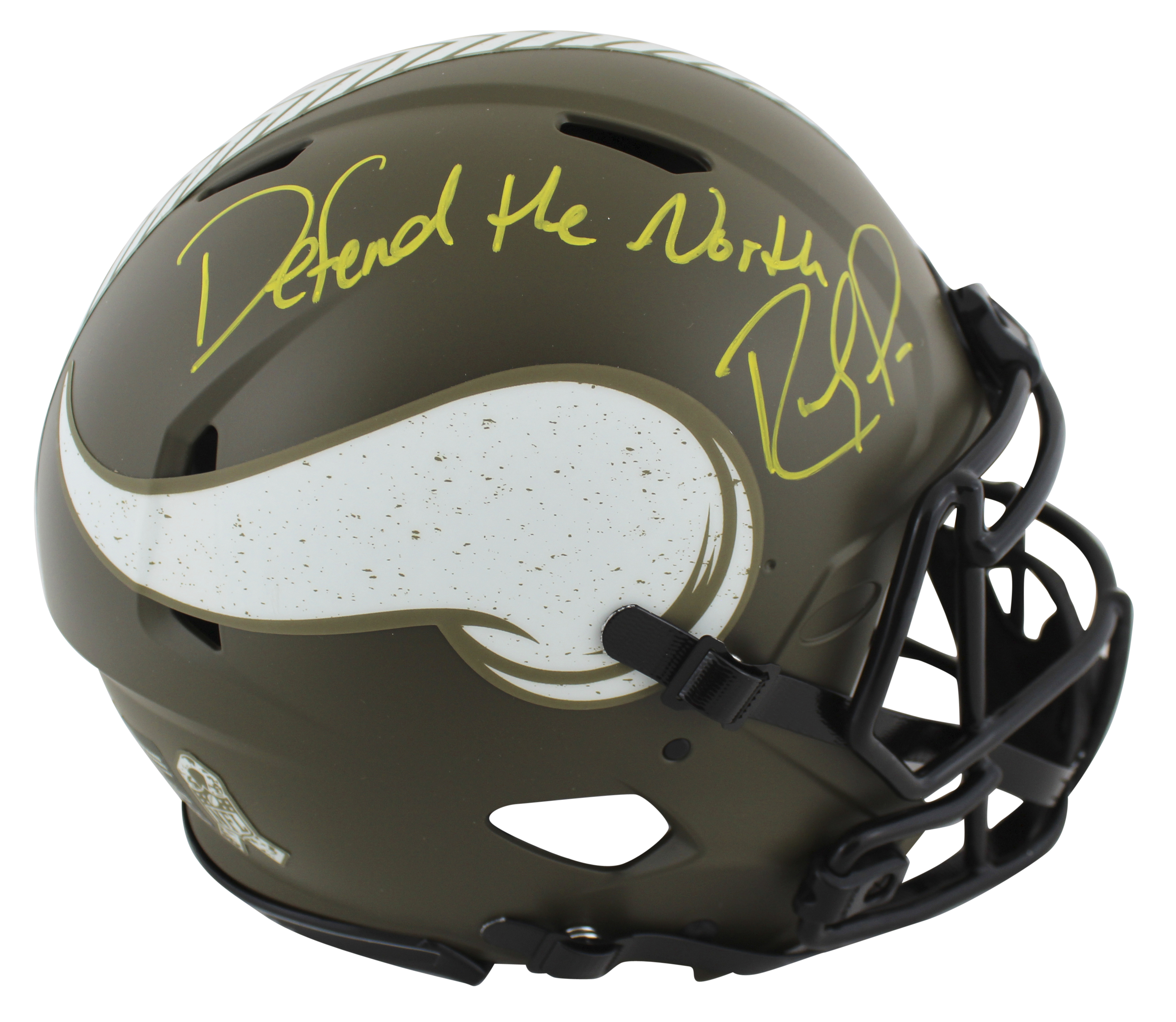 This Autographed Alternate Salute To Service Riddell Full Size Speed Proline Helmet W/ Uv Mirrored Back Acrylic Display Case with the inscription of "Defend The North" has been Personally Signed by Randy Moss of the Minnesota Vikings. This item is 100% Authentic to include a hologram by Beckett Authentication Services. This item may come with the new Beckett Authentication hologram that has a scannable QR code rather than the traditional COA. If you would like to have a COA, you are welcome to reach out to Beckett for a printed certification once you receive your item. This is a BAS Witnessed Protection Program item which means a Beckett Authentication Service representative was present when this item was being signed. We conducted an autograph signing with Randy Moss where multiples of the same item were signed. While the photographs are representative of this item, the size, placement and strength of the signature may vary. Each item is hand signed, therefore, each autograph is unique. This item can be verified through BAS Witnessed.