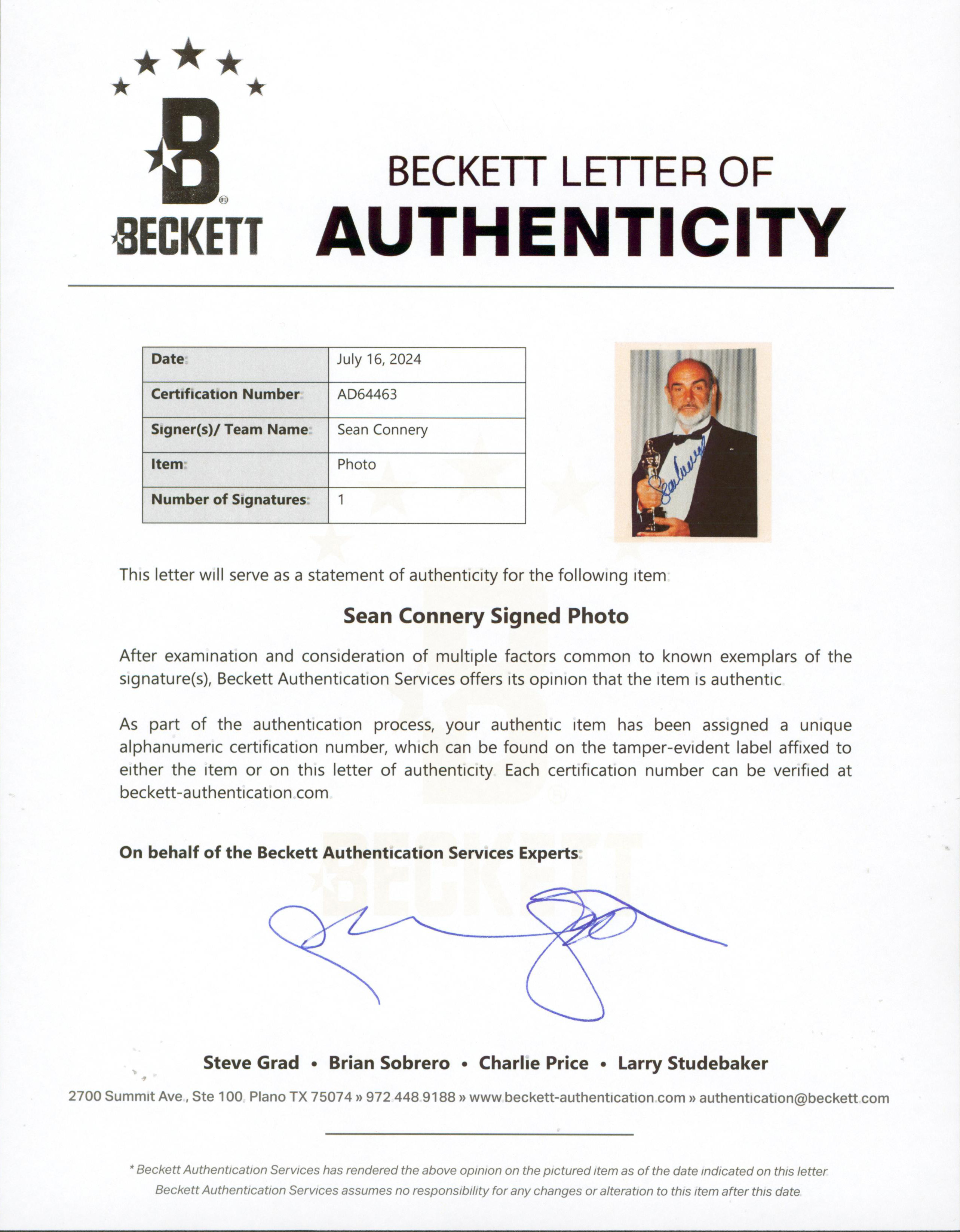 This Autographed 8x10 Photo has been Personally Signed by Sean Connery of The Untouchables. This item is 100% Authentic to include a Certificate of Authenticity (COA) / hologram by Beckett Authentication Services. The authenticity can be verified on Beckett Authentication Services website.