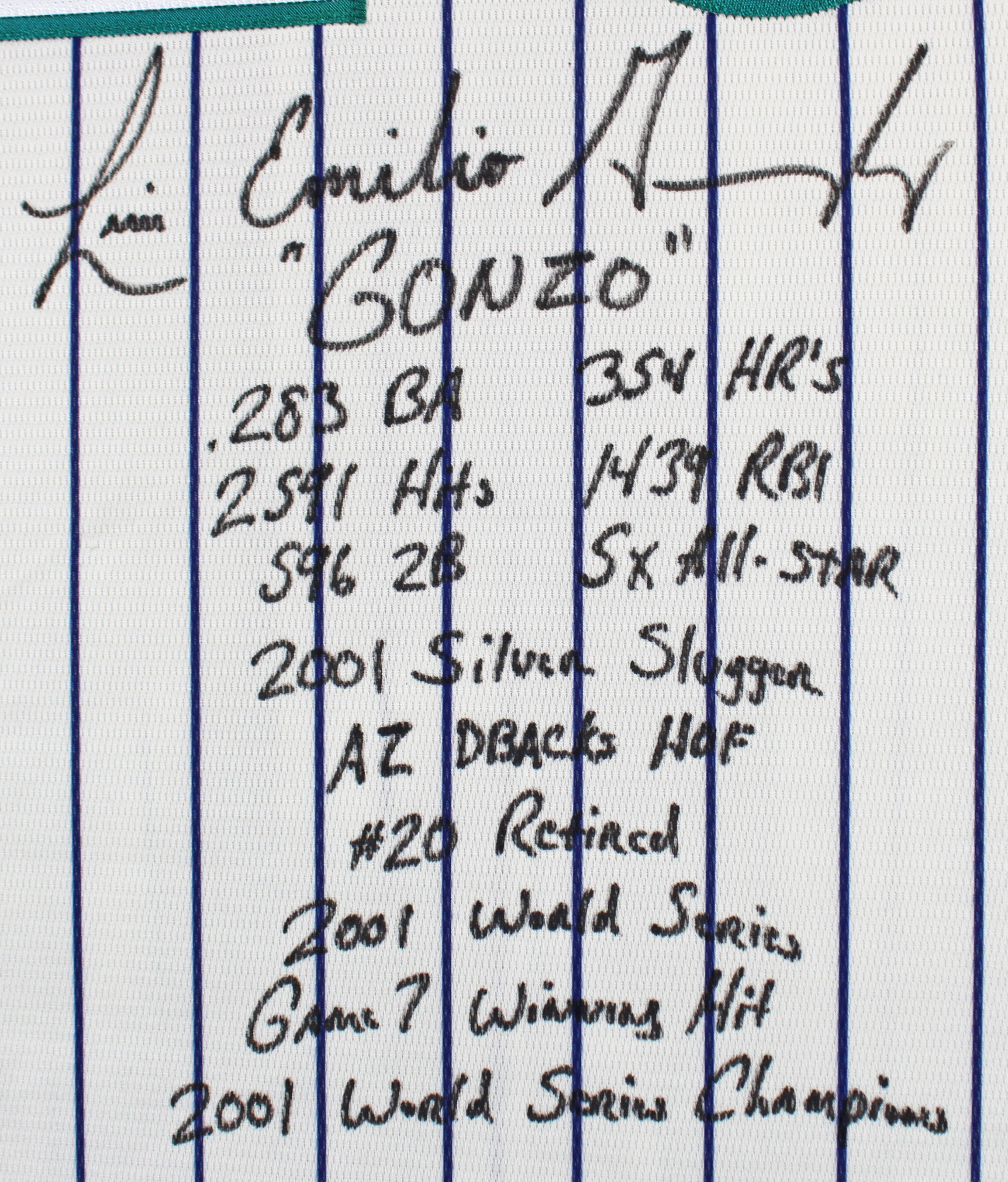 This Autographed White Pinstripe Majestic Cool Base Jersey with the inscription of ""Gonzo",.283 BA, 354 HRs, 2591 Hits, 1439 RBI, 596 2B, 5x All-Star, 2001 Silver Slugger, AZ Dbacks HOF, #20 Retired, 2001 World Series Game 7 Winning Hit, 2001 World Series Champions" has been Personally Signed by Luis Gonzalez of the Arizona Diamondbacks. This item is 100% Authentic to include a hologram by Beckett Authentication Services. This item will come with an affixed Beckett Authentication Services (BAS) authentication sticker, which includes a scannable QR code to verify authenticity. Please note that Beckett no longer provides serial-numbered COA cards, and the attached BAS sticker will serve as the complete authentication for this item. This is a BAS Witnessed Protection Program item which means a Beckett Authentication Service representative was present when this item was being signed. We conducted an autograph signing with Luis Gonzalez where multiples of the same item were signed. While the photographs are representative of this item, the size, placement and strength of the signature may vary. Each item is hand signed, therefore, each autograph is unique. This item can be verified through BAS Witnessed. This is a X-Large sized, non-branded, custom-stitched Jersey.