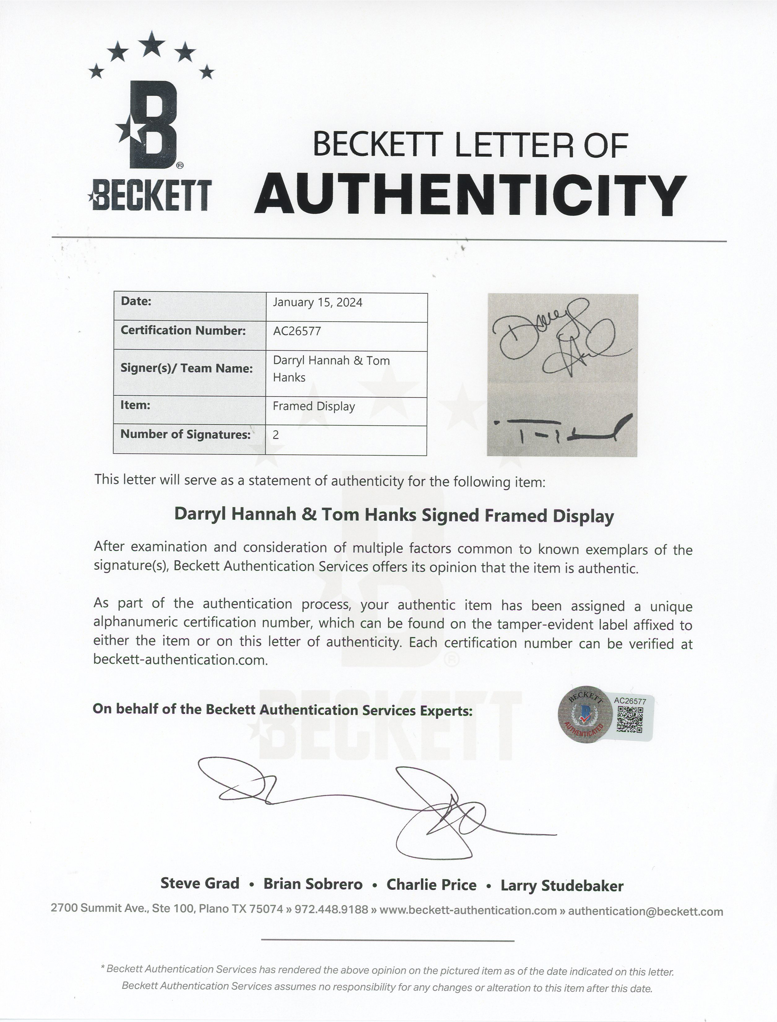 This Autographed 3x5 Index Card Framed Display has been Personally Signed by Daryl Hannah & Tom Hanks of Splash. This item is 100% Authentic to include a Certificate of Authenticity (COA) / hologram by Beckett Authentication Services. The authenticity can be verified on Beckett Authentication Services website. This has been professionally framed to overall dimensions of approximately 16.25x20.5 inches.