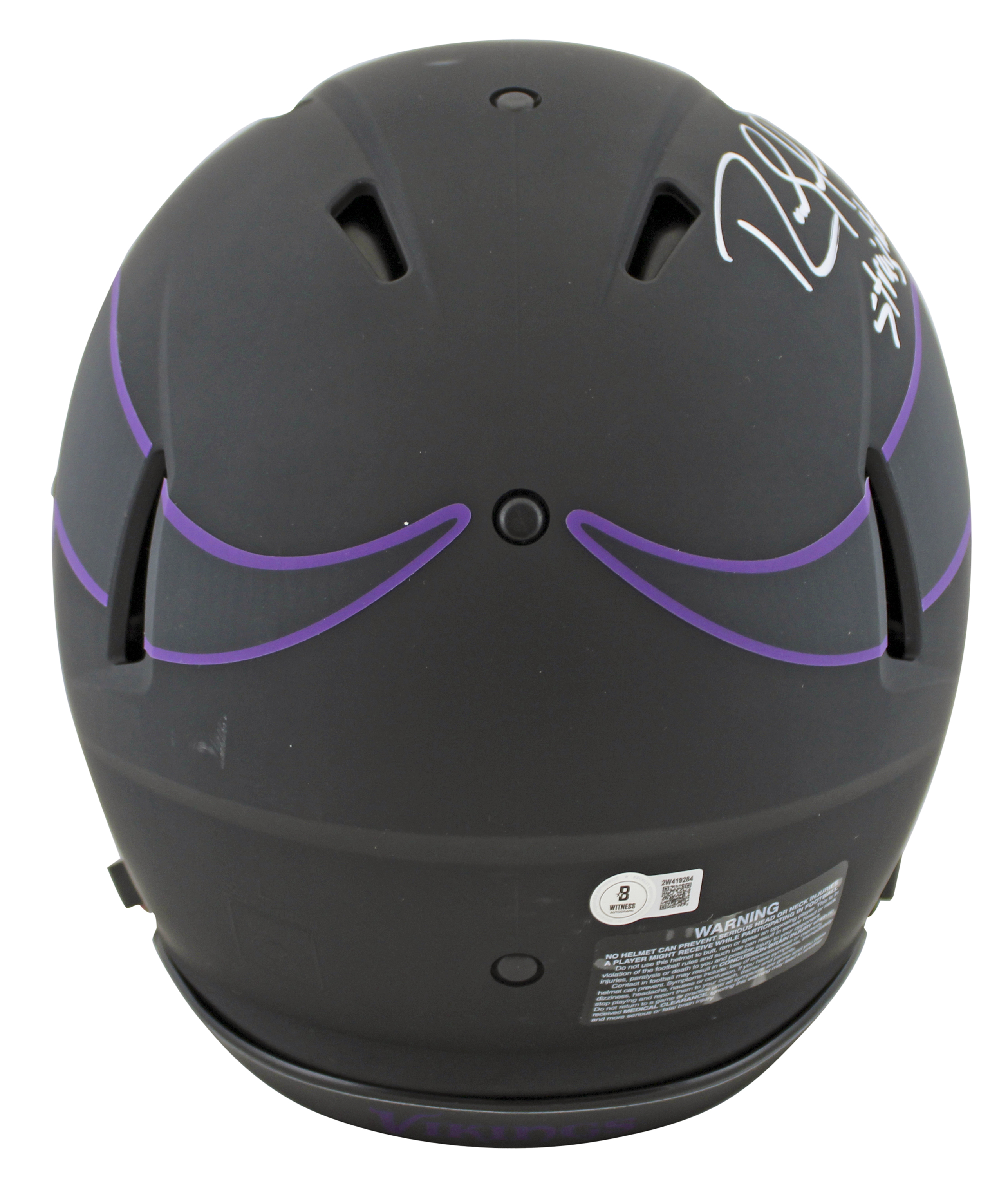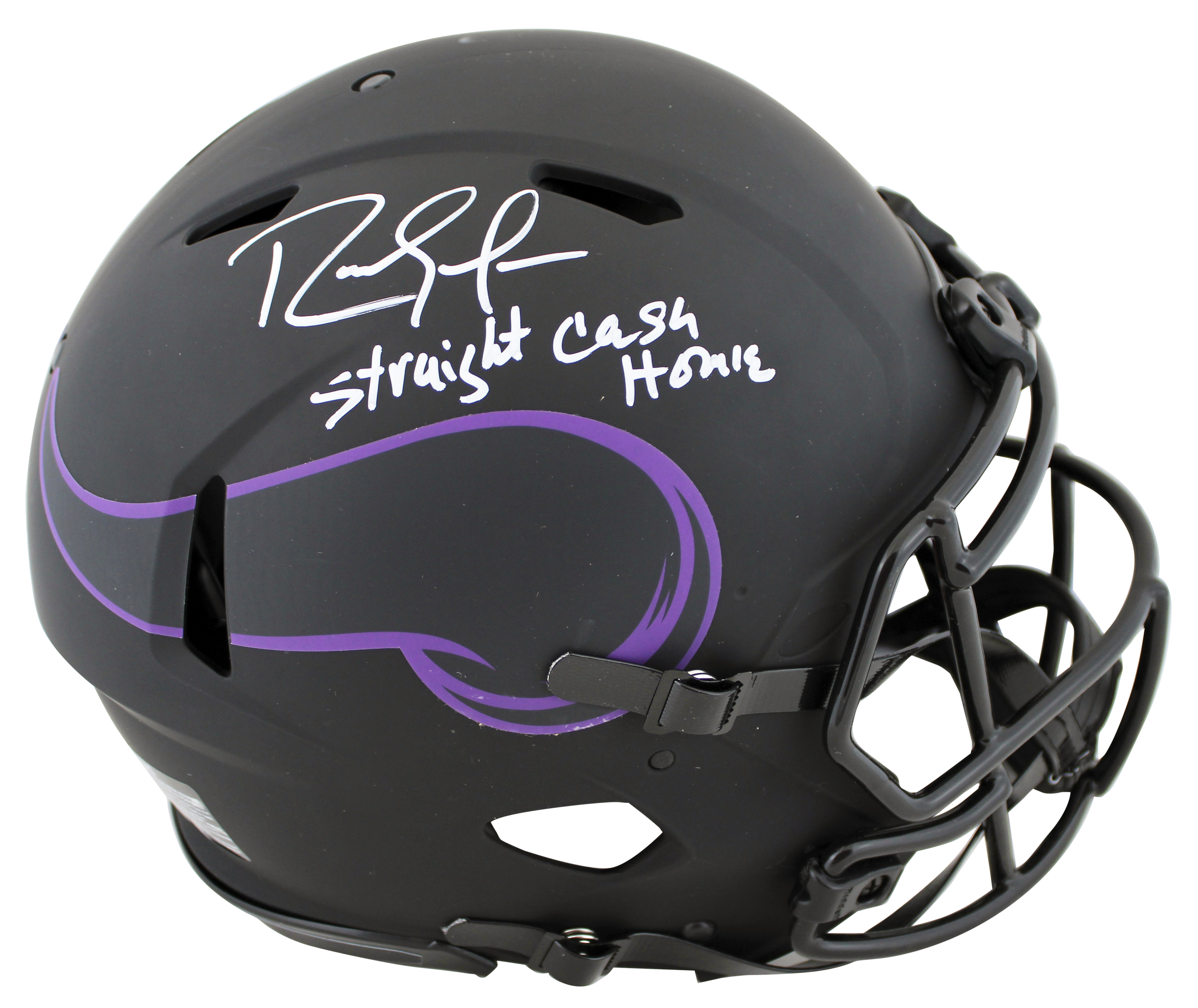 This Autographed w/ White Signature Alternate Eclipse Riddell Full Size Speed Proline Helmet W/ Uv Mirrored Back Acrylic Display Case with the inscription of "Straight Cash Homie" has been Personally Signed by Randy Moss of the Minnesota Vikings. This item is 100% Authentic to include a hologram by Beckett Authentication Services. This item will come with an affixed Beckett Authentication Services (BAS) authentication sticker, which includes a scannable QR code to verify authenticity. Please note that Beckett no longer provides serial-numbered COA cards, and the attached BAS sticker will serve as the complete authentication for this item. This is a BAS Witnessed Protection Program item which means a Beckett Authentication Service representative was present when this item was being signed. We conducted an autograph signing with Randy Moss where multiples of the same item were signed. While the photographs are representative of this item, the size, placement and strength of the signature may vary. Each item is hand signed, therefore, each autograph is unique. This item can be verified through BAS Witnessed.