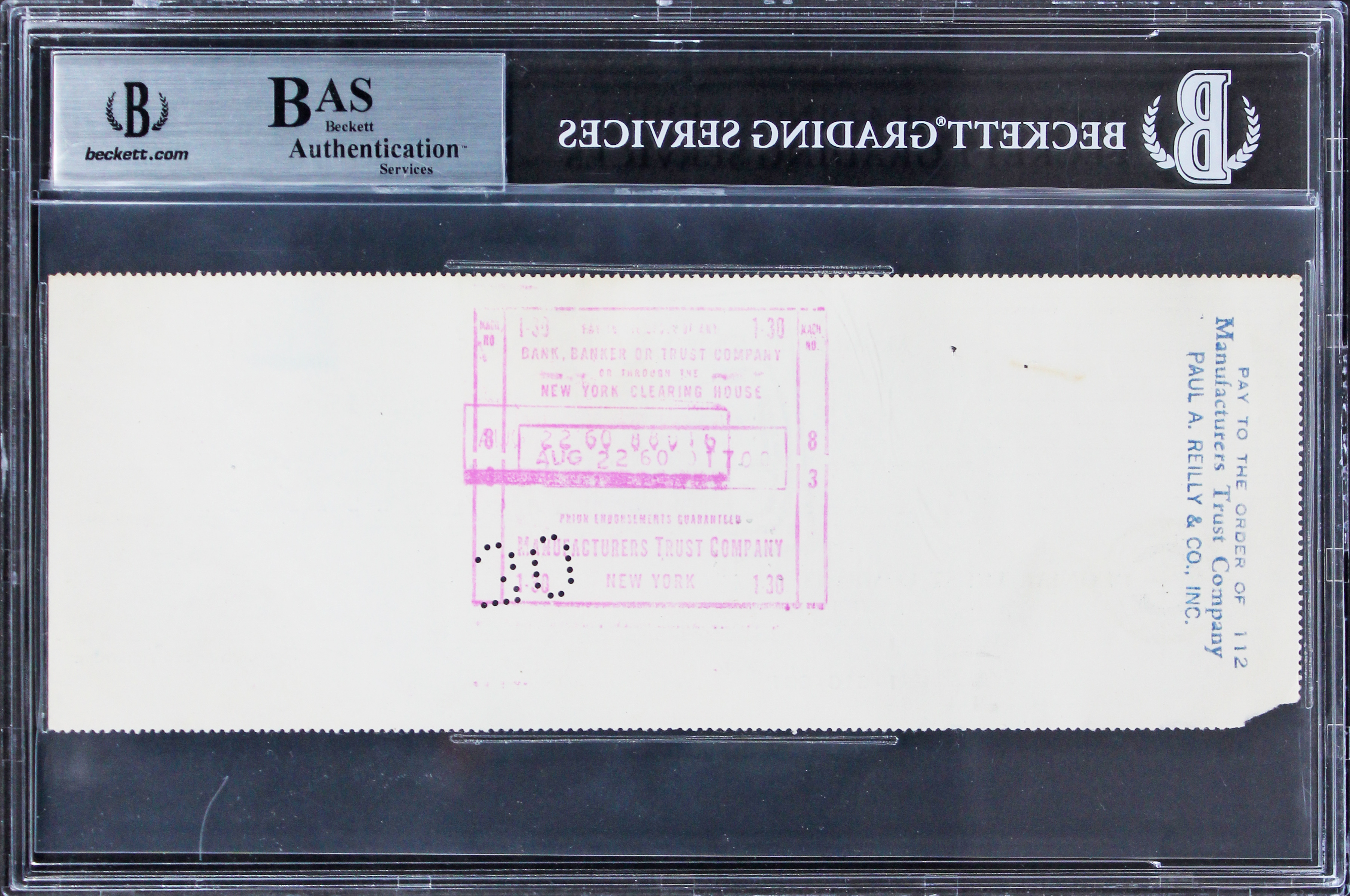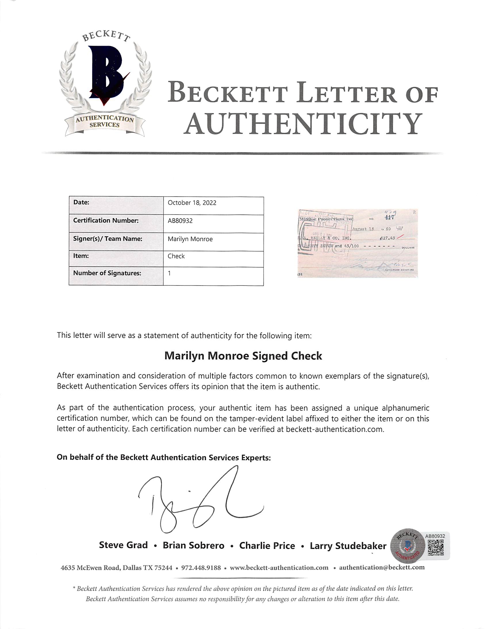 This Autographed Dated August 15, 1960 Marilyn Monroe Productions 3x8.5 Check has been Personally Signed by Marilyn Monroe. This item is 100% Authentic, it comes slabbed and authenticated by Beckett Authentication Services. The authenticity can be verified on Beckett Authentication Services website.