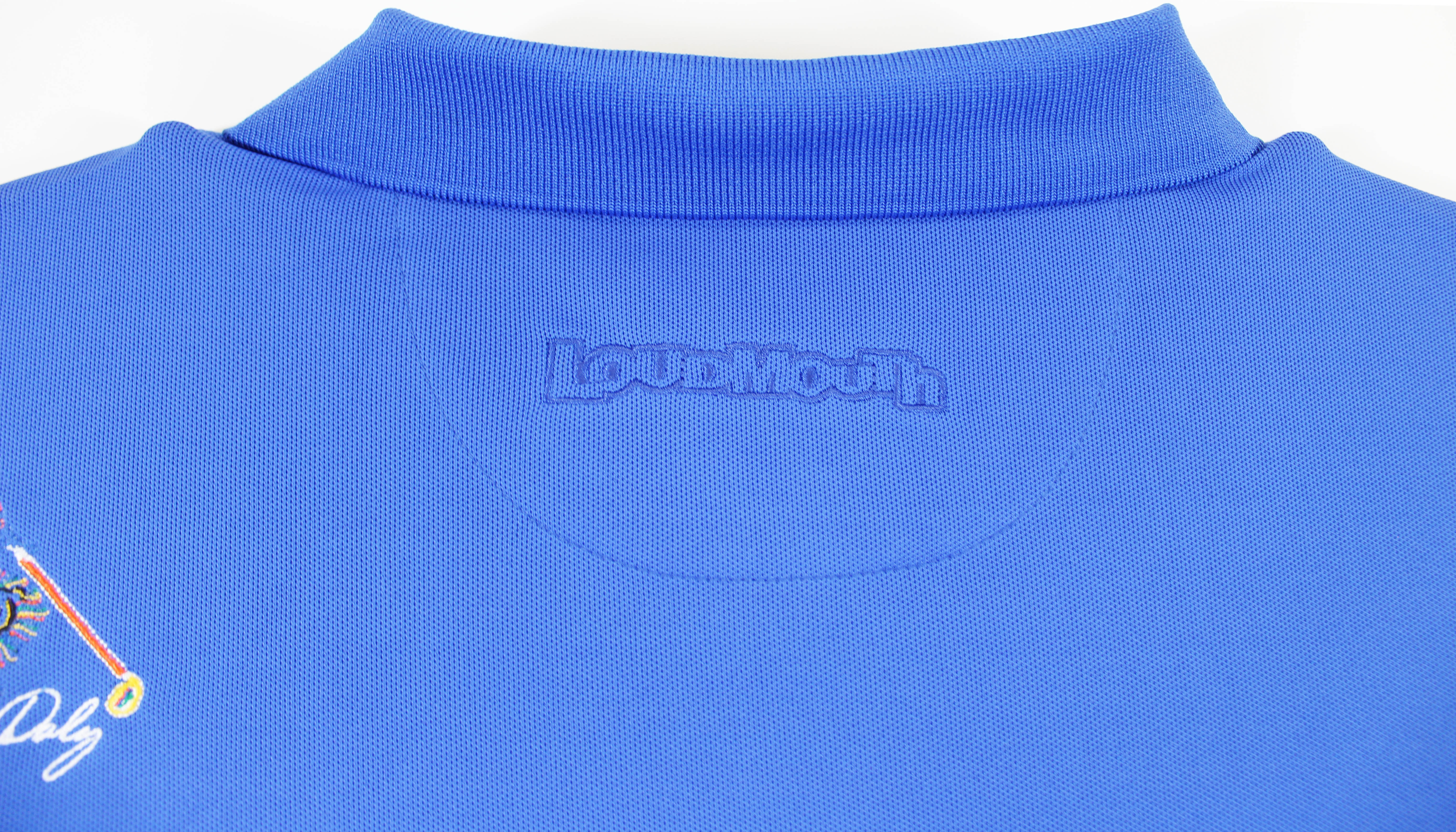 This Autographed Match Worn Blue Loudmouth Mark Christopher Pitch & Play ETS Trump Rock Bottom Golf Polo Shirt has been Personally Signed by John Daly. This item is 100% Authentic to include a hologram by Beckett Authentication Services. This item will come with an affixed Beckett Authentication Services (BAS) authentication sticker, which includes a scannable QR code to verify authenticity. Please note that Beckett no longer provides serial-numbered COA cards, and the attached BAS sticker will serve as the complete authentication for this item. The authenticity can be verified on Beckett Authentication Services website. This is a XX-Large sized Shirt. This Match Worn Blue Loudmouth Mark Christopher Pitch & Play ETS Trump Rock Bottom Golf Polo shirt has been worn by John Daly, and comes with a letter of Authenticity from John Daly certifying this is match worn & provenance of the item coming from his personal collection.