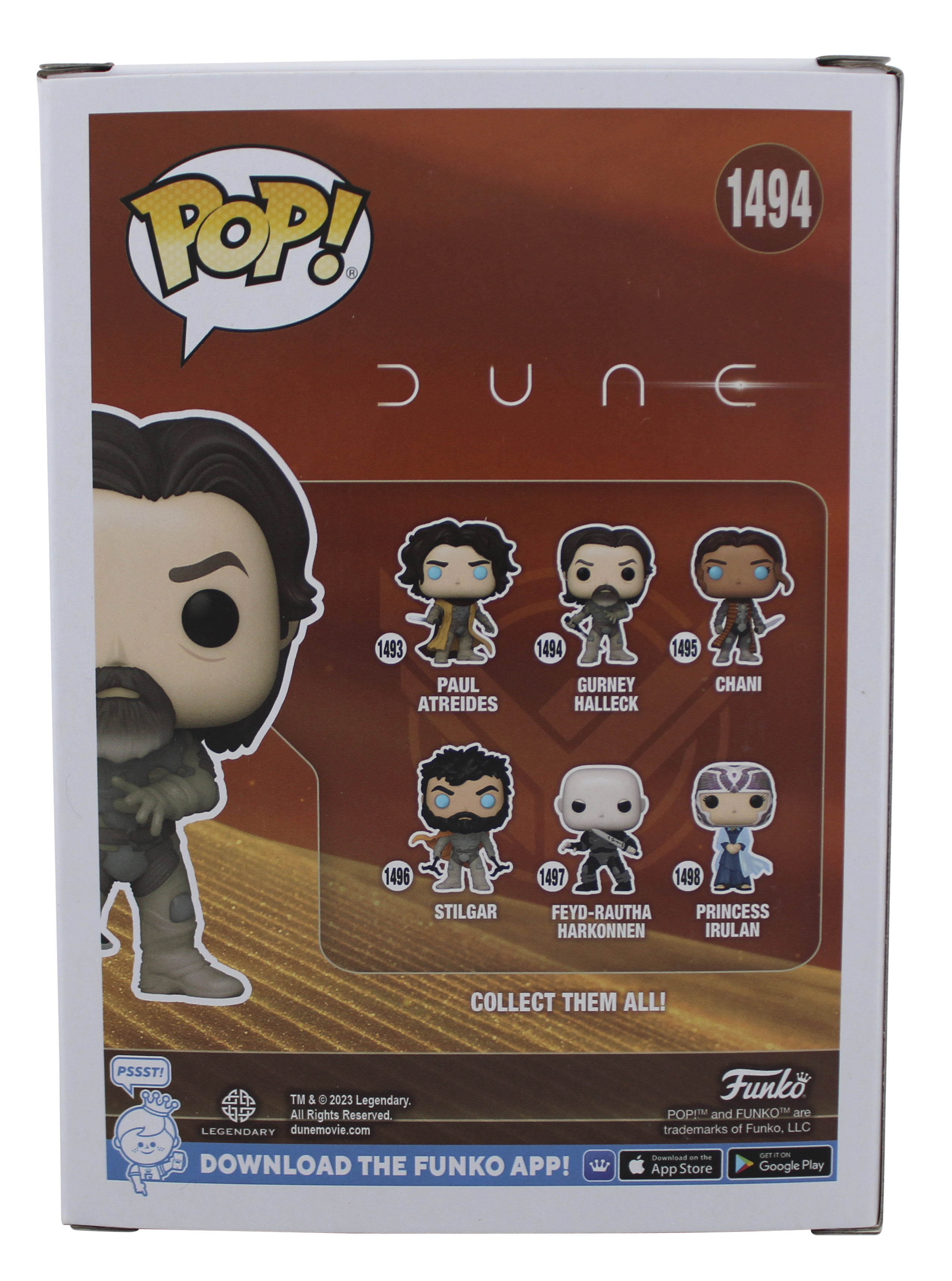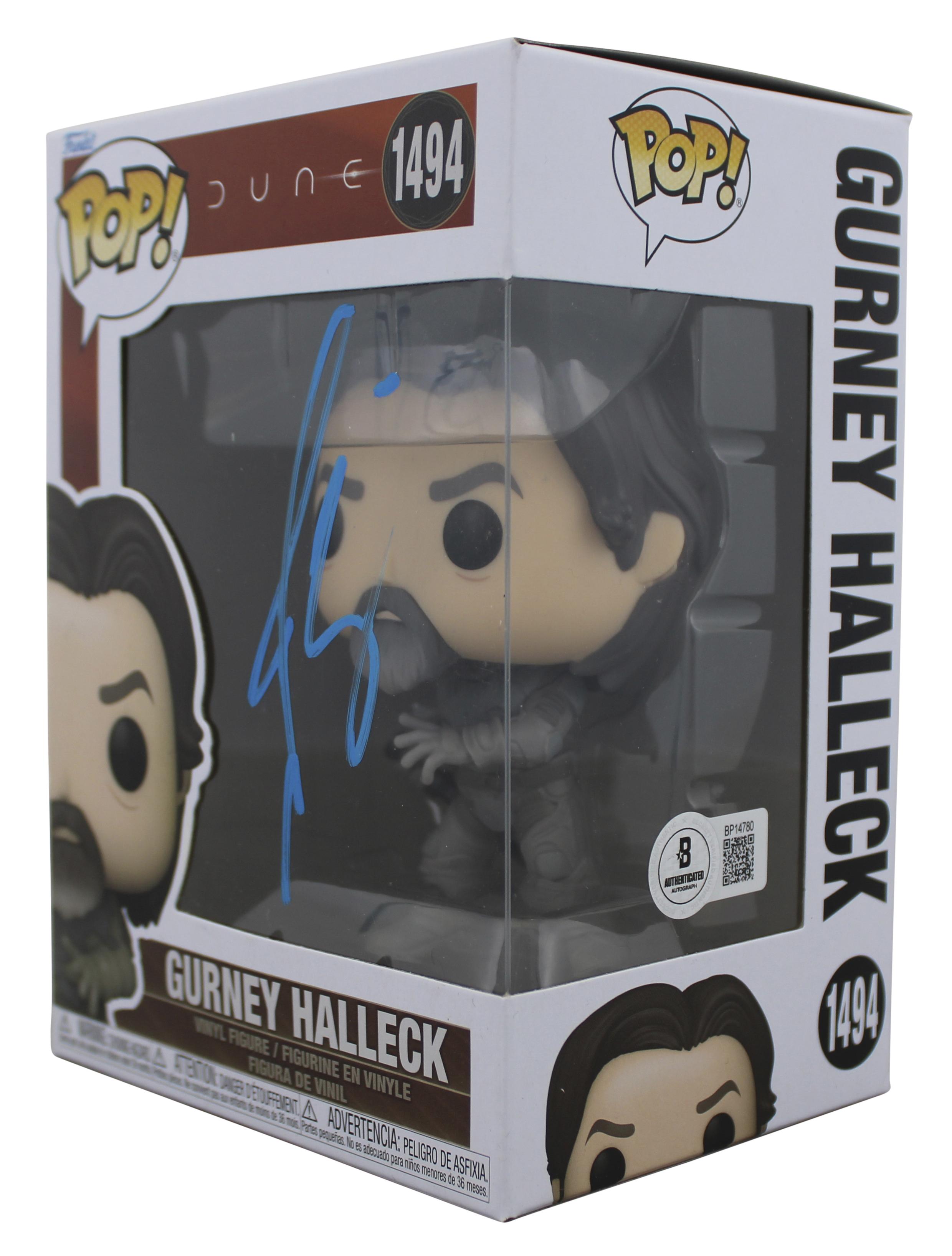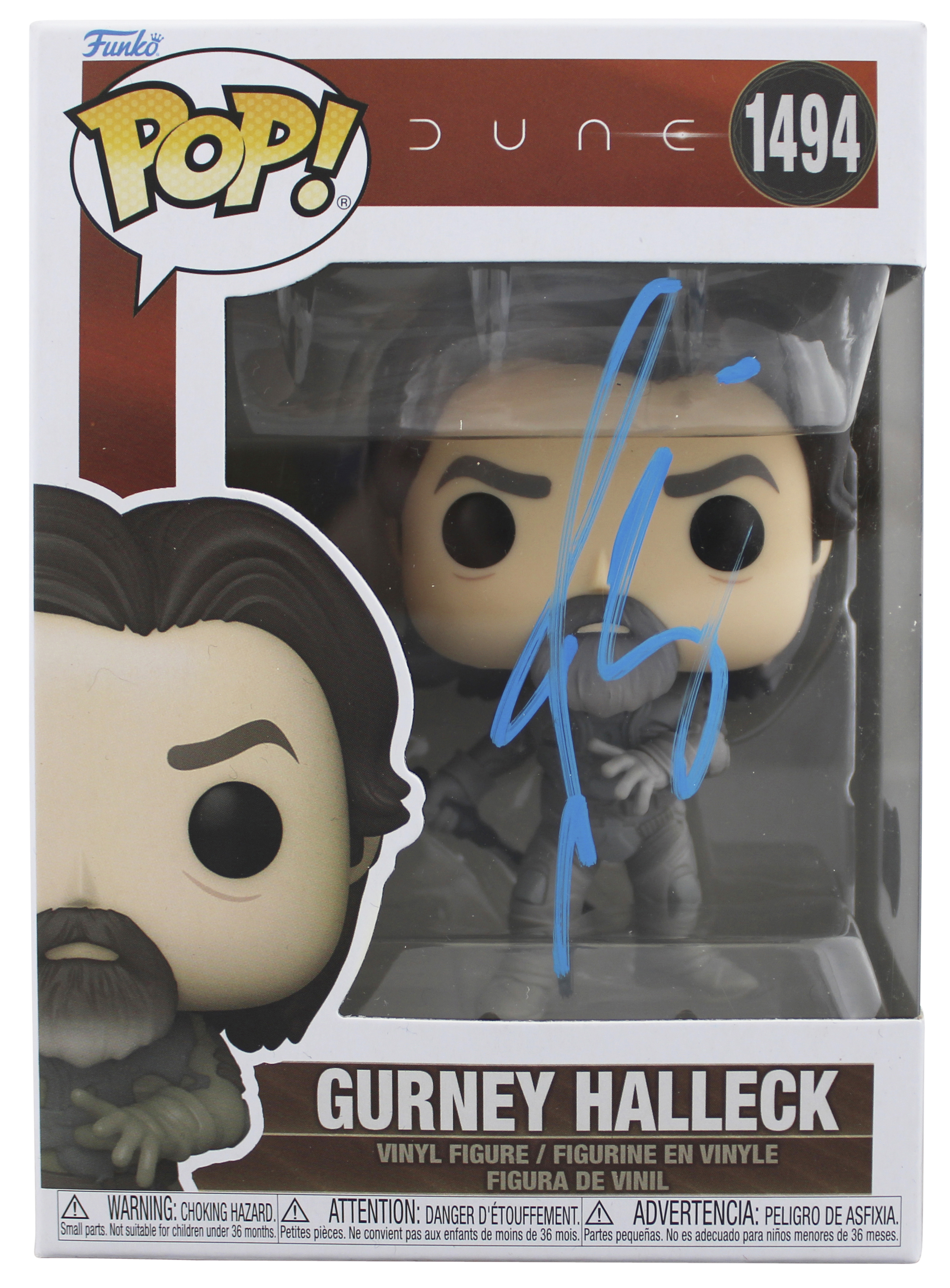 This Autographed w/ Blue Signature Gurney Halleck #1494 Funko Pop Vinyl Figure has been Personally Signed by Josh Brolin of Dune. This item is 100% Authentic to include a hologram by Beckett Authentication Services. This item will come with an affixed Beckett Authentication Services (BAS) authentication sticker, which includes a scannable QR code to verify authenticity. Please note that Beckett no longer provides serial-numbered COA cards, and the attached BAS sticker will serve as the complete authentication for this item. We have multiples of this same item. While the photographs are representative of this item, the size, placement and strength of the signature may vary. Each item is hand signed, therefore, each autograph is unique. This item will ship in a Pop! Protector, please refer to the photos for condition of the item prior to purchase, these are in good condition but would not be considered mint.