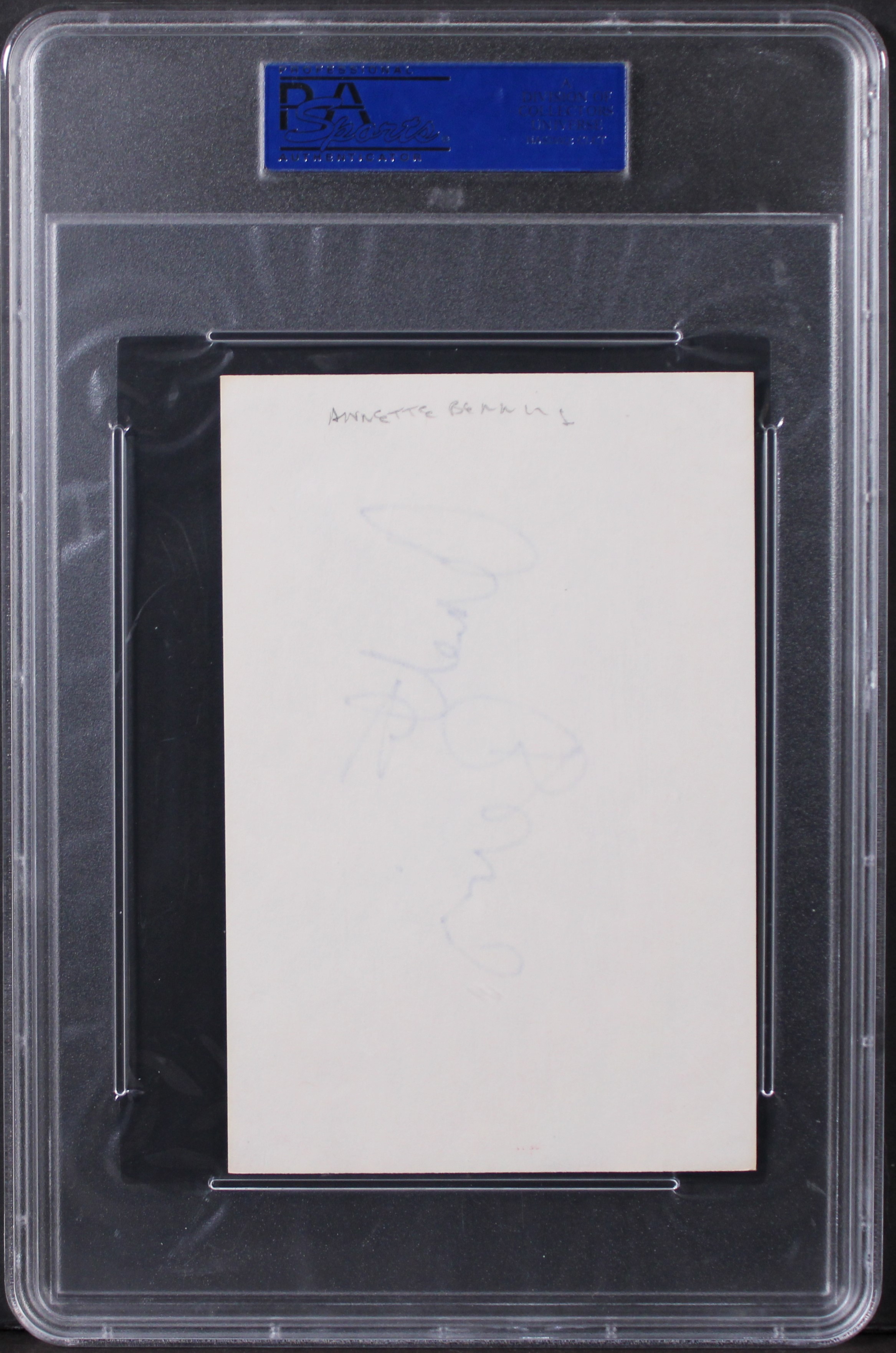 This Autographed 4x6 Index Card has been Personally Signed by Annette Bening of American Beauty. This item is 100% Authentic, it comes slabbed and authenticated by PSA/DNA. The authenticity can be verified on Professional Sports Authenticator website.
