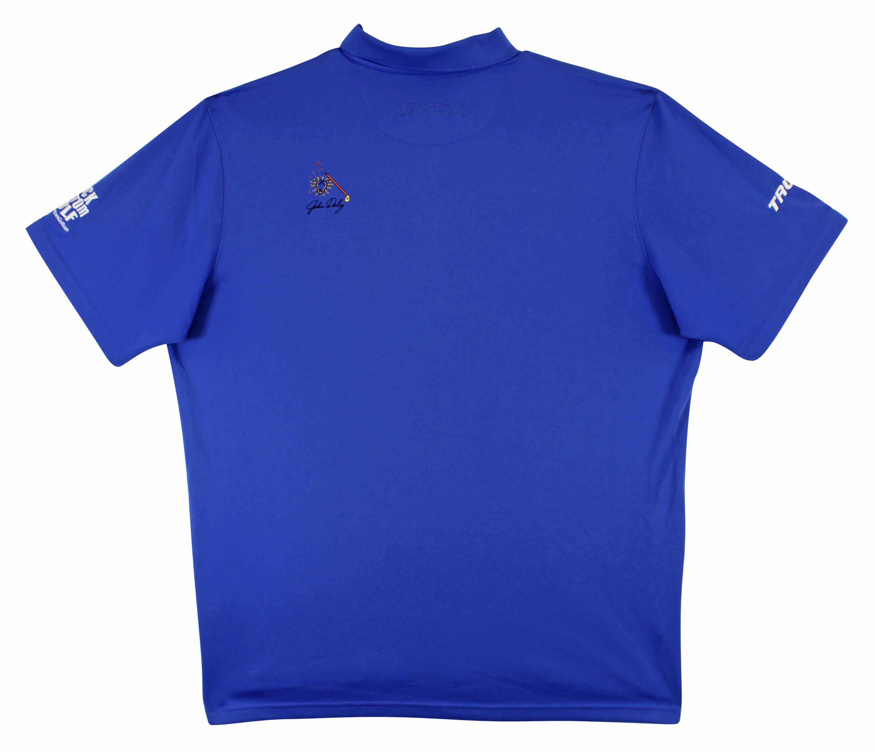 This Autographed Match Worn Blue Loudmouth Mark Christopher Pitch & Play ETS Trump Rock Bottom Golf Polo Shirt has been Personally Signed by John Daly. This item is 100% Authentic to include a hologram by Beckett Authentication Services. This item will come with an affixed Beckett Authentication Services (BAS) authentication sticker, which includes a scannable QR code to verify authenticity. Please note that Beckett no longer provides serial-numbered COA cards, and the attached BAS sticker will serve as the complete authentication for this item. The authenticity can be verified on Beckett Authentication Services website. This is a XX-Large sized Shirt. This Match Worn Blue Loudmouth Mark Christopher Pitch & Play ETS Trump Rock Bottom Golf Polo shirt has been worn by John Daly, and comes with a letter of Authenticity from John Daly certifying this is match worn & provenance of the item coming from his personal collection.