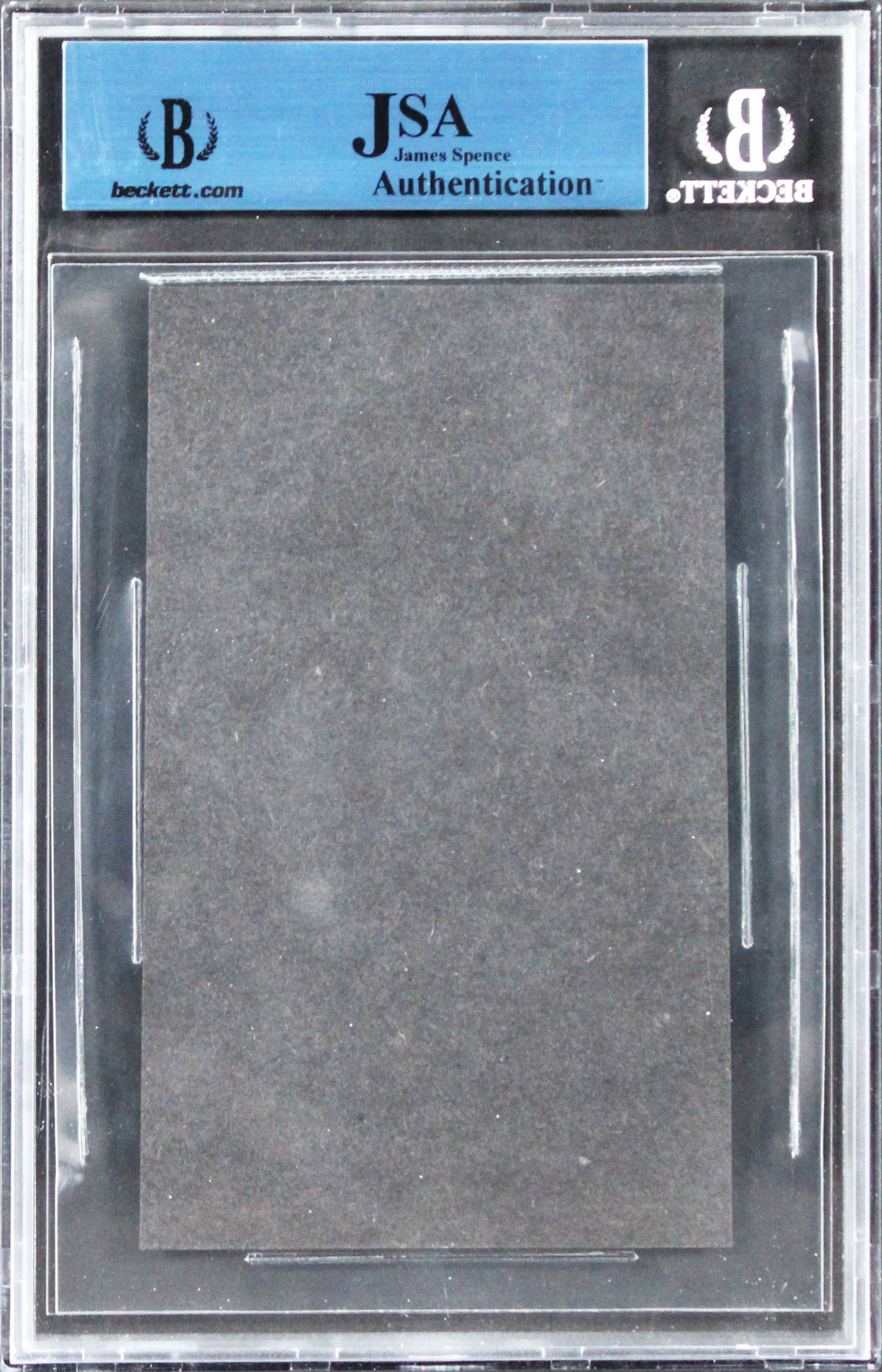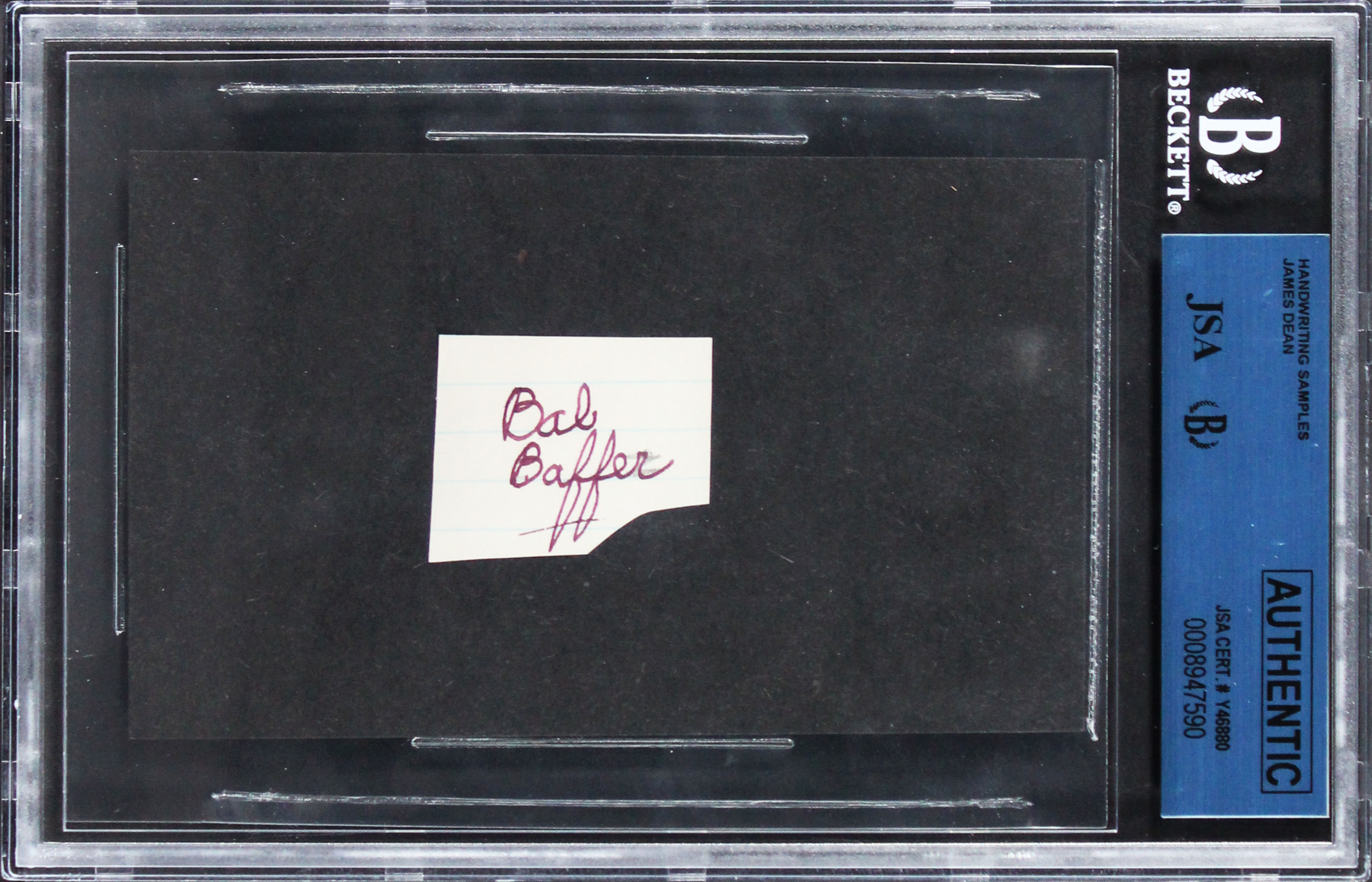 This 1x1.5 Handwriting Sample From 5th Grade Notebook with the inscription of "Bal Baffer" has been drawn by James Dean of Rebel Without a Cause. Offered here is an exceptional, one-of-a-kind relic from Hollywood legend James Dean���a handwritten page extracted from his 5th-grade notebook. This remarkable item is 100% authentic, penned by Dean himself during his school years, offering a rare glimpse into his early life before achieving superstardom. The page features a hand drawn sketch, showcasing the youthful creativity of the iconic actor.The item has been expertly authenticated by JSA (James Spence Authentication), with a copy of the original certified Letter of Authenticity included. Additionally, provenance is further supported by a statement from autograph expert John Reznikoff of University Archives, further assuring its legitimacy.