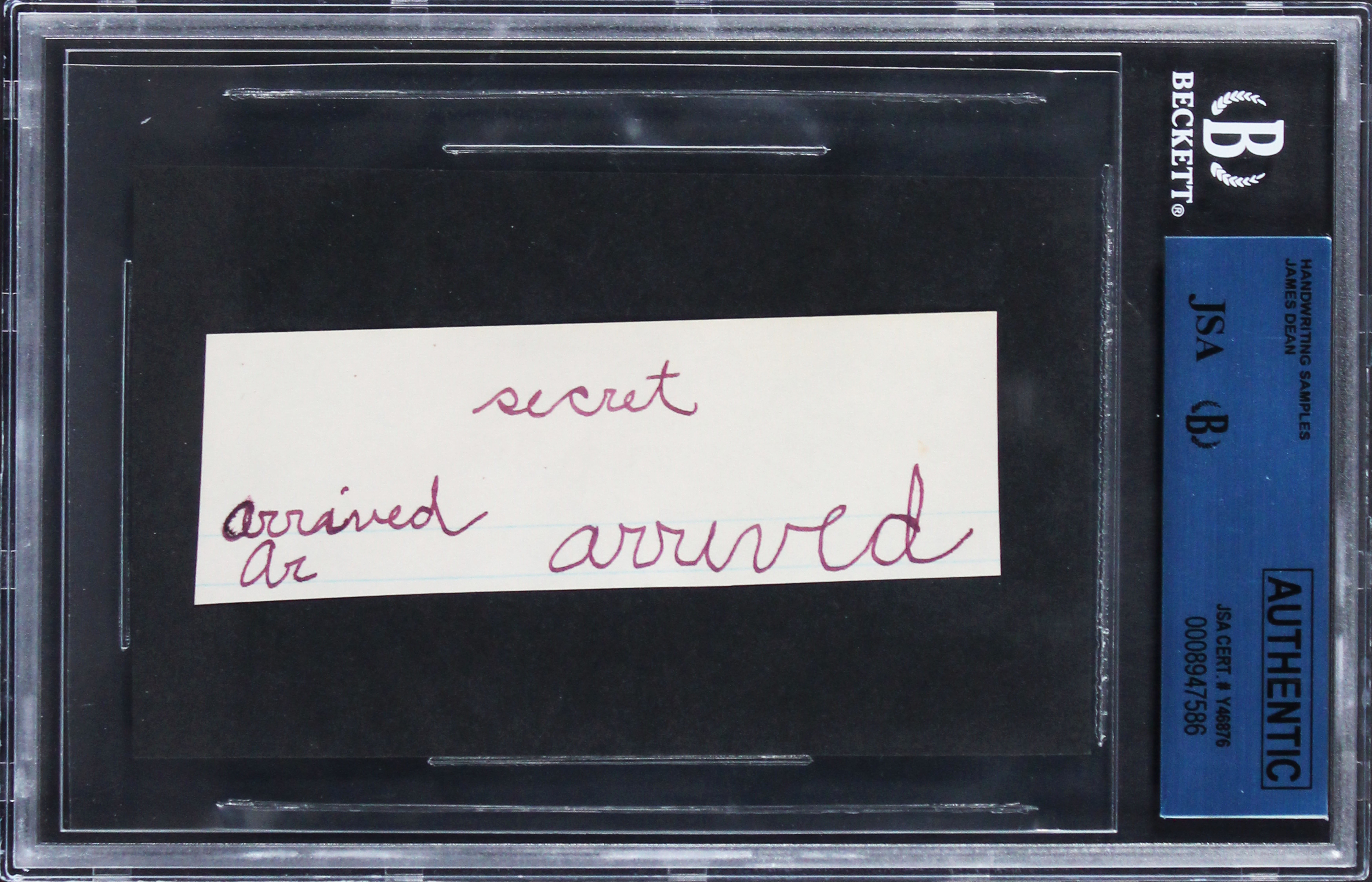 This 1.5x4 Handwriting Sample From 5th Grade Notebook with the inscription of "Secret Arrived Ar Arrived" has been drawn by James Dean of Rebel Without a Cause. Offered here is an exceptional, one-of-a-kind relic from Hollywood legend James Dean���a handwritten page extracted from his 5th-grade notebook. This remarkable item is 100% authentic, penned by Dean himself during his school years, offering a rare glimpse into his early life before achieving superstardom. The page features a hand drawn sketch, showcasing the youthful creativity of the iconic actor.The item has been expertly authenticated by JSA (James Spence Authentication), with a copy of the original certified Letter of Authenticity included. Additionally, provenance is further supported by a statement from autograph expert John Reznikoff of University Archives, further assuring its legitimacy.