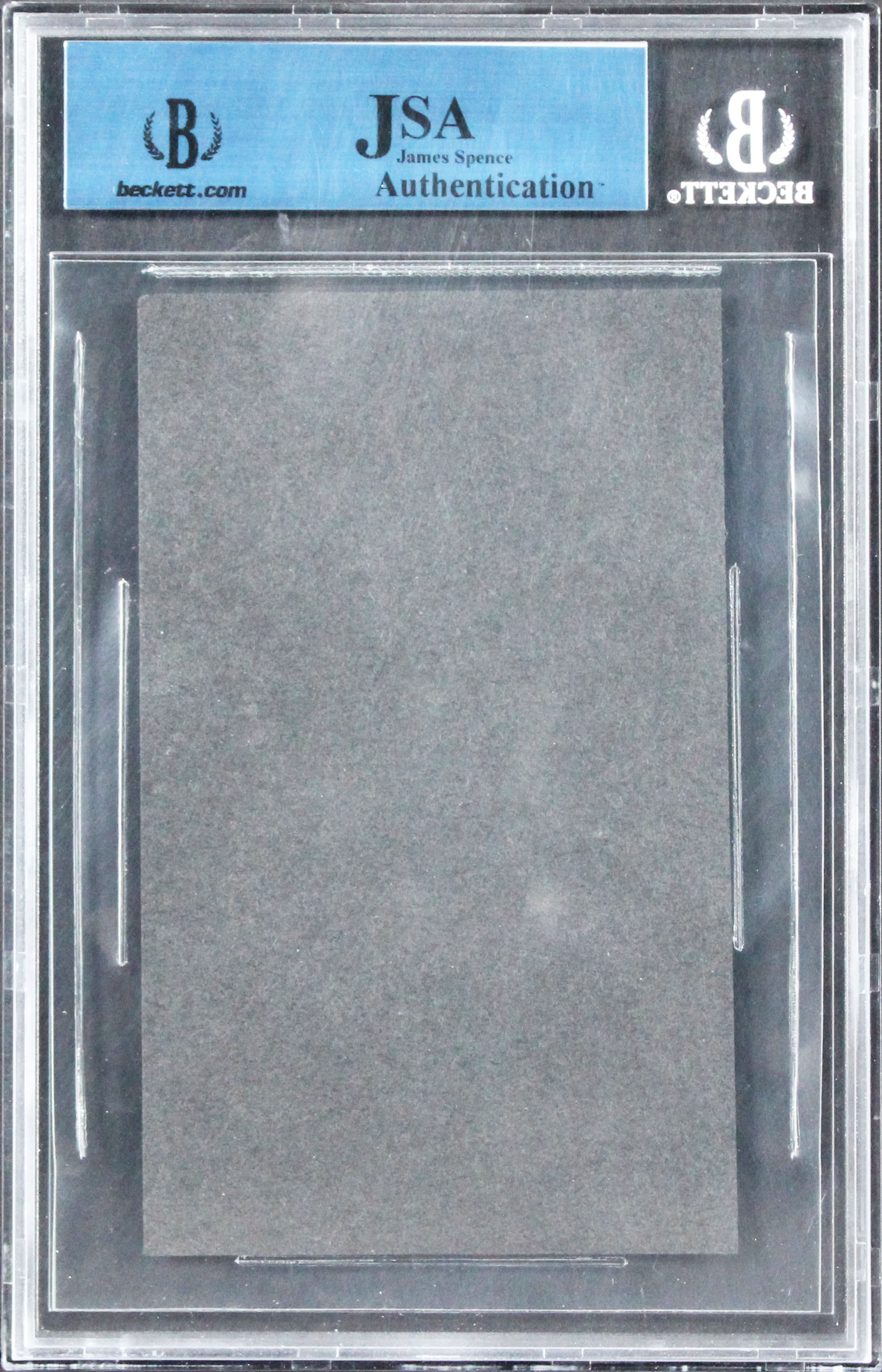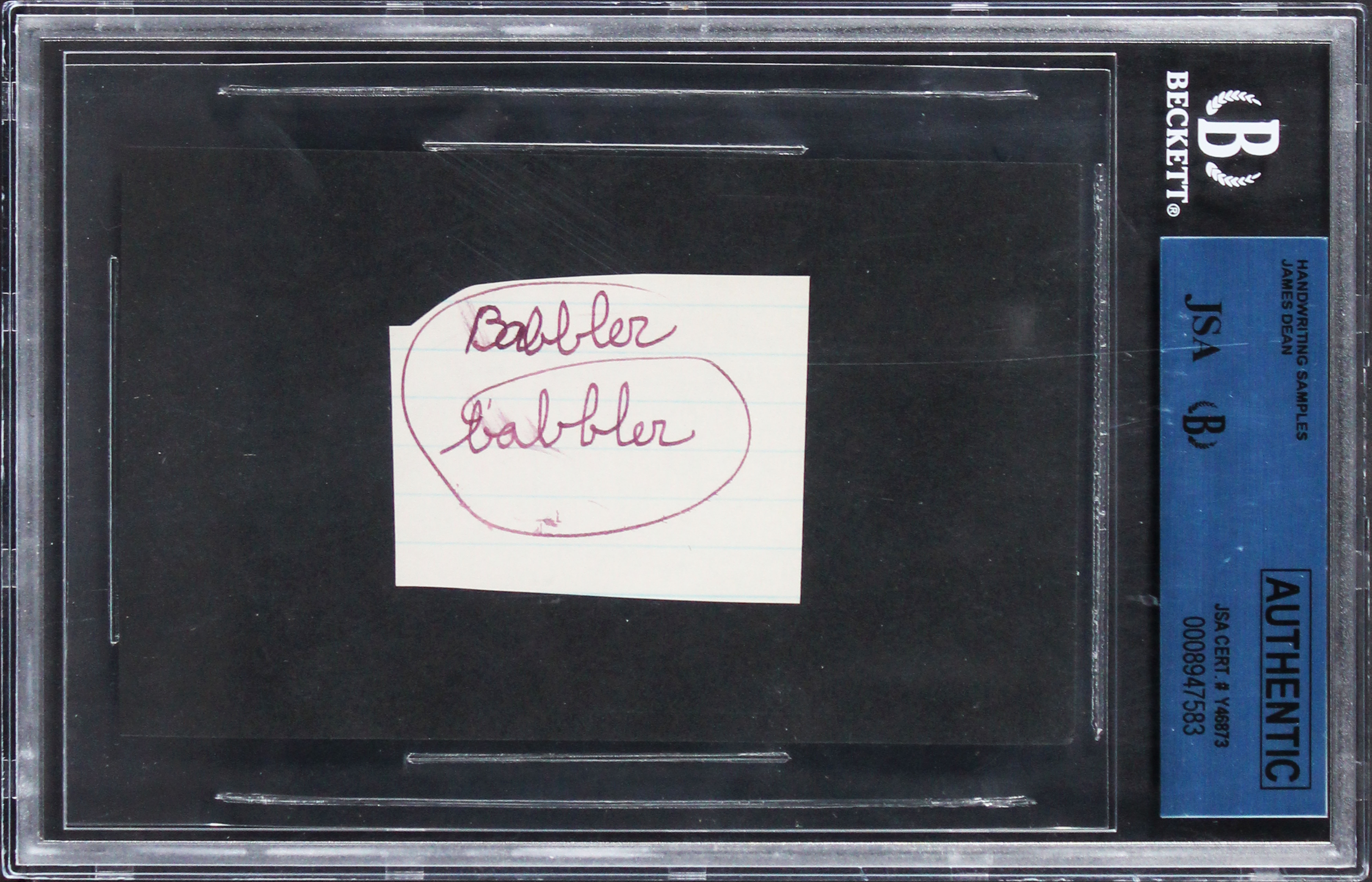This 1.75x2 Handwriting Sample From 5th Grade Notebook with the inscription of "Babbler Babbler" has been drawn by James Dean of Rebel Without a Cause. Offered here is an exceptional, one-of-a-kind relic from Hollywood legend James Dean���a handwritten page extracted from his 5th-grade notebook. This remarkable item is 100% authentic, penned by Dean himself during his school years, offering a rare glimpse into his early life before achieving superstardom. The page features a hand drawn sketch, showcasing the youthful creativity of the iconic actor.The item has been expertly authenticated by JSA (James Spence Authentication), with a copy of the original certified Letter of Authenticity included. Additionally, provenance is further supported by a statement from autograph expert John Reznikoff of University Archives, further assuring its legitimacy.