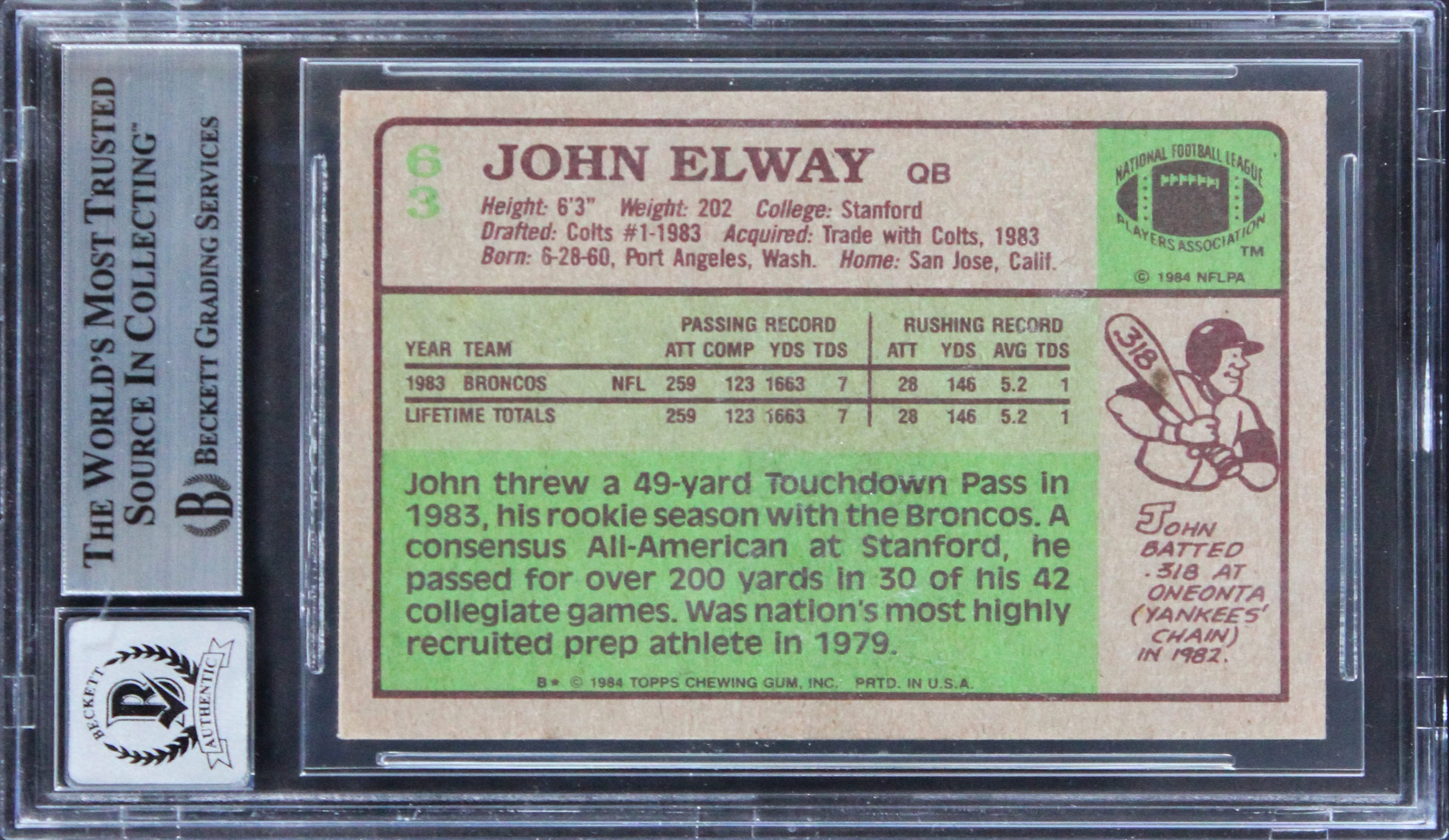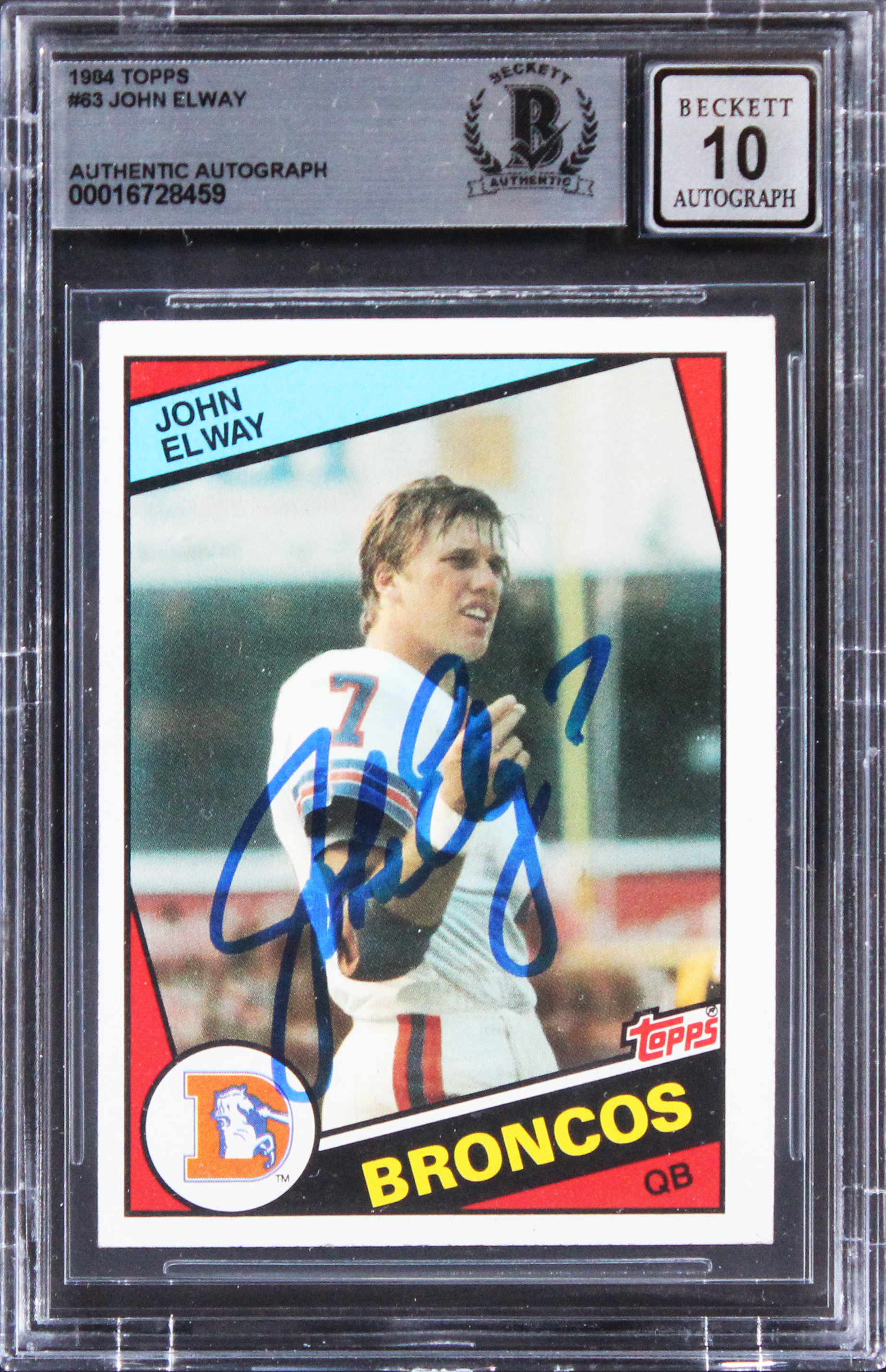 This Autographed Auto Graded Gem Mint 10! 1984 Topps #63 Rookie Card has been Personally Signed by John Elway of the Denver Broncos. This item is 100% Authentic, it comes slabbed and authenticated by Beckett Authentication Services. We have multiples of this same item. While the photographs are representative of this item, the size, placement and strength of the signature may vary. Each item is hand signed, therefore, each autograph is unique.