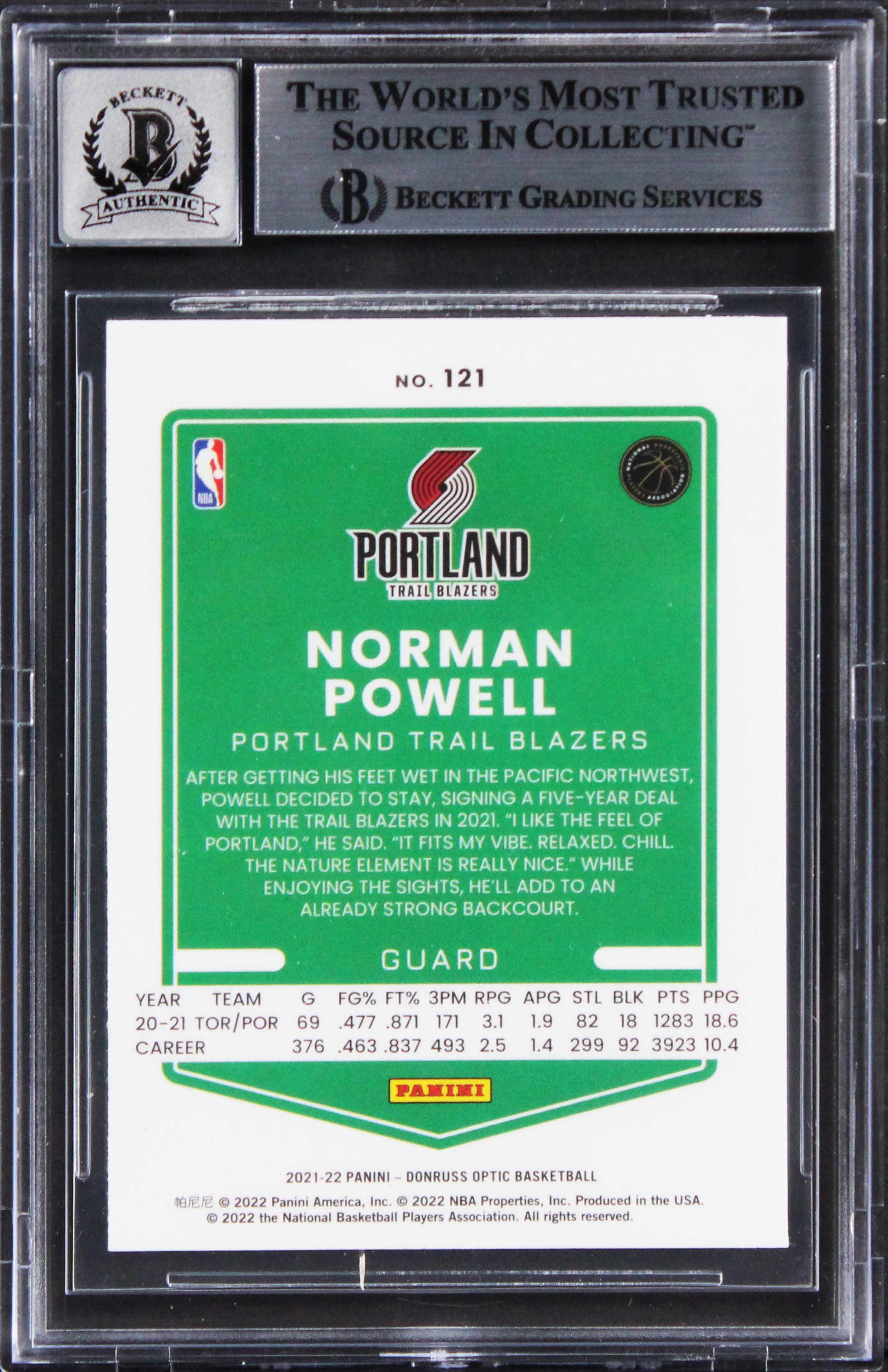 Blazers Norman Powell Signed 2021 Donruss Optic #121 Card Auto 10! BAS Slabbed