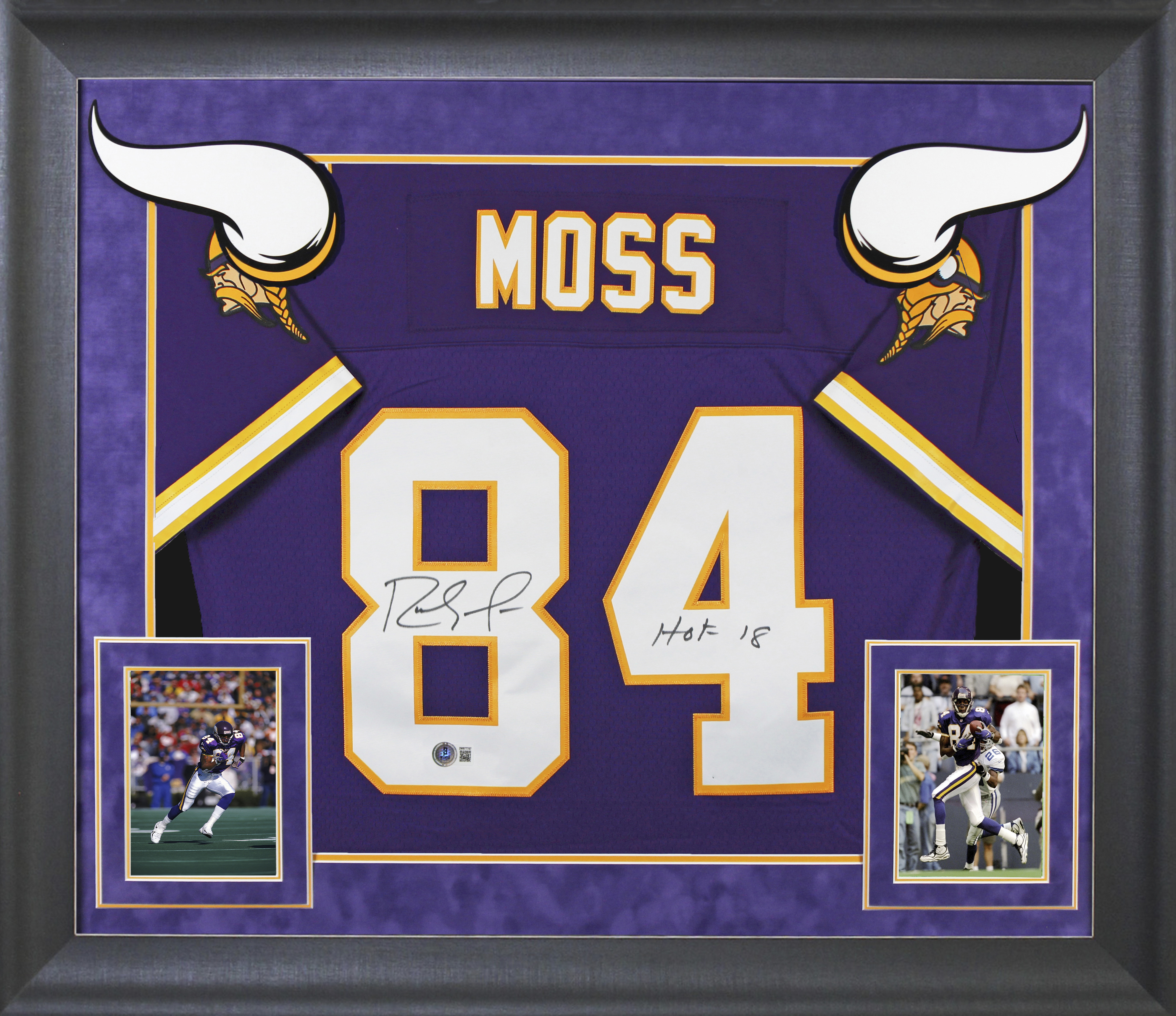 This Autographed Purple 1998 Mitchell & Ness Throwback Framed Jersey with the inscription of "HOF 18" has been Personally Signed by Randy Moss of the Minnesota Vikings. This item is 100% Authentic to include a hologram by Beckett Authentication Services. This item will come with an affixed Beckett Authentication Services (BAS) authentication sticker, which includes a scannable QR code to verify authenticity. Please note that Beckett no longer provides serial-numbered COA cards, and the attached BAS sticker will serve as the complete authentication for this item. This is a BAS Witnessed Protection Program item which means a Beckett Authentication Service representative was present when this item was being signed. We have multiples of this same item. While the photographs are representative of this item, the size, placement and strength of the signature may vary. Each item is hand signed, therefore, each autograph is unique. This item has been professionally framed to overall dimensions of approximately 32 x 37 inches. This is a X-Large sized Framed Jersey. This jersey will be framed to order, it will take 3-4 days from purchase date for it to ship.