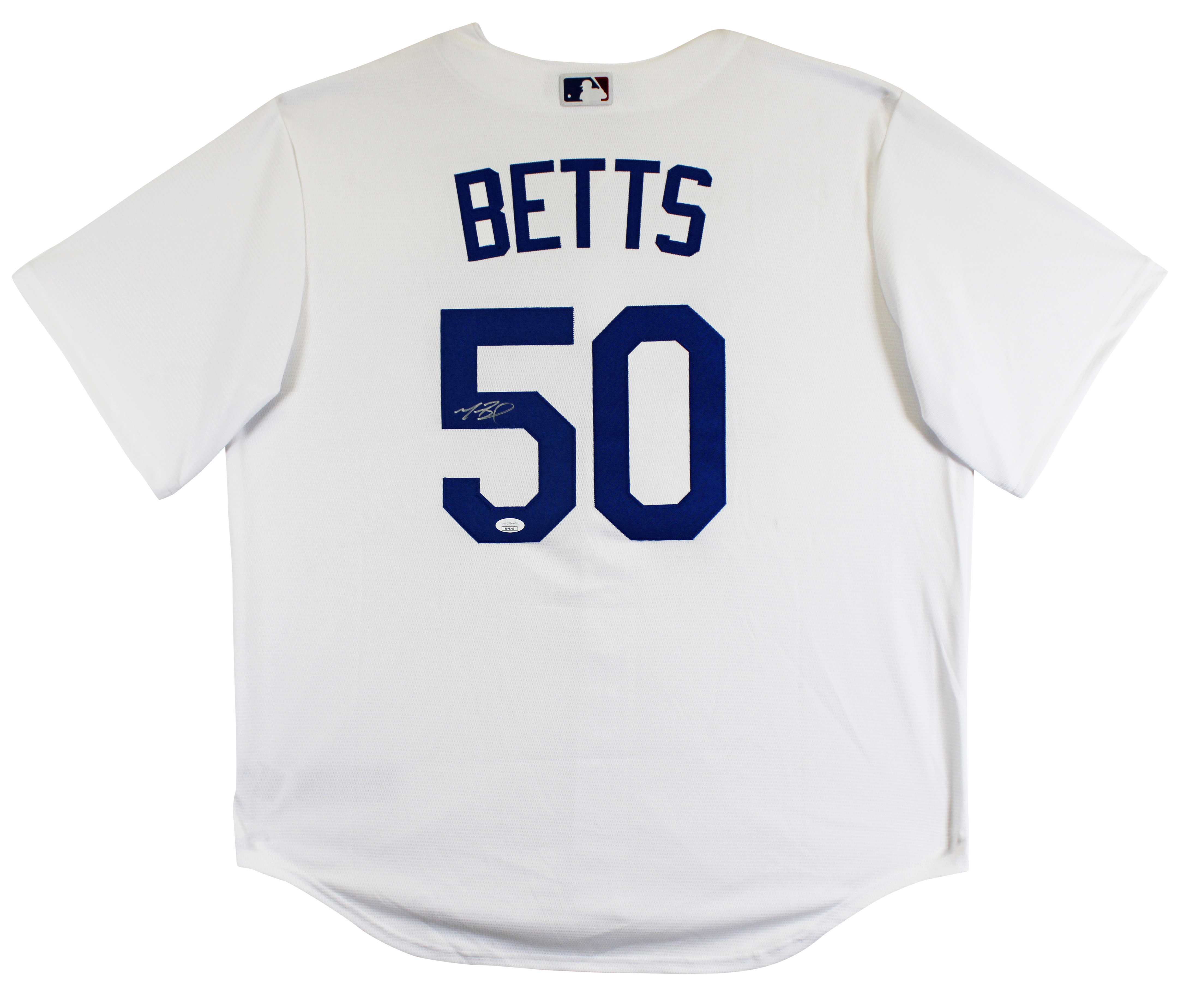 This Autographed White Nike Jersey has been Personally Signed by Mookie Betts of the Los Angeles Dodgers. This item is 100% Authentic to include a Certificate of Authenticity (COA) / hologram by JSA. We conducted an autograph signing with Mookie Betts where multiples of the same item were signed. While the photographs are representative of this item, the size, placement and strength of the signature may vary. Each item is hand signed, therefore, each autograph is unique. This item can be verified through JSA. This is a X-Large sized Jersey.