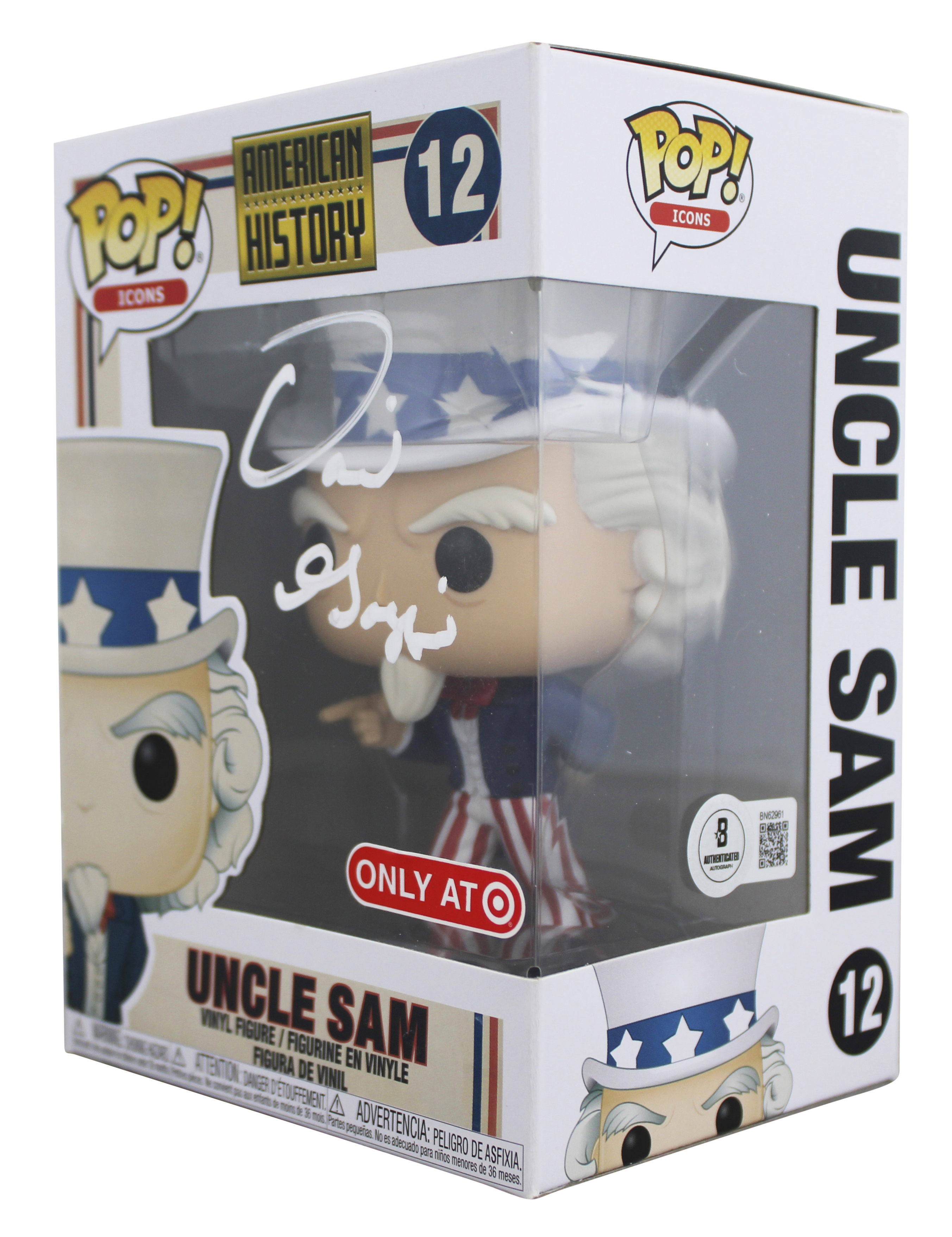 This Autographed w/ White Signature Uncle Sam #12 Funko Pop Vinyl Figure has been Personally Signed by David Goggins. This item is 100% Authentic to include a hologram by Beckett Authentication Services. This item will come with an affixed Beckett Authentication Services (BAS) authentication sticker, which includes a scannable QR code to verify authenticity. Please note that Beckett no longer provides serial-numbered COA cards, and the attached BAS sticker will serve as the complete authentication for this item. We have multiples of this same item. While the photographs are representative of this item, the size, placement and strength of the signature may vary. Each item is hand signed, therefore, each autograph is unique. This item will ship in a Pop! Protector, please refer to the photos for condition of the item prior to purchase, these are in good condition but would not be considered mint.