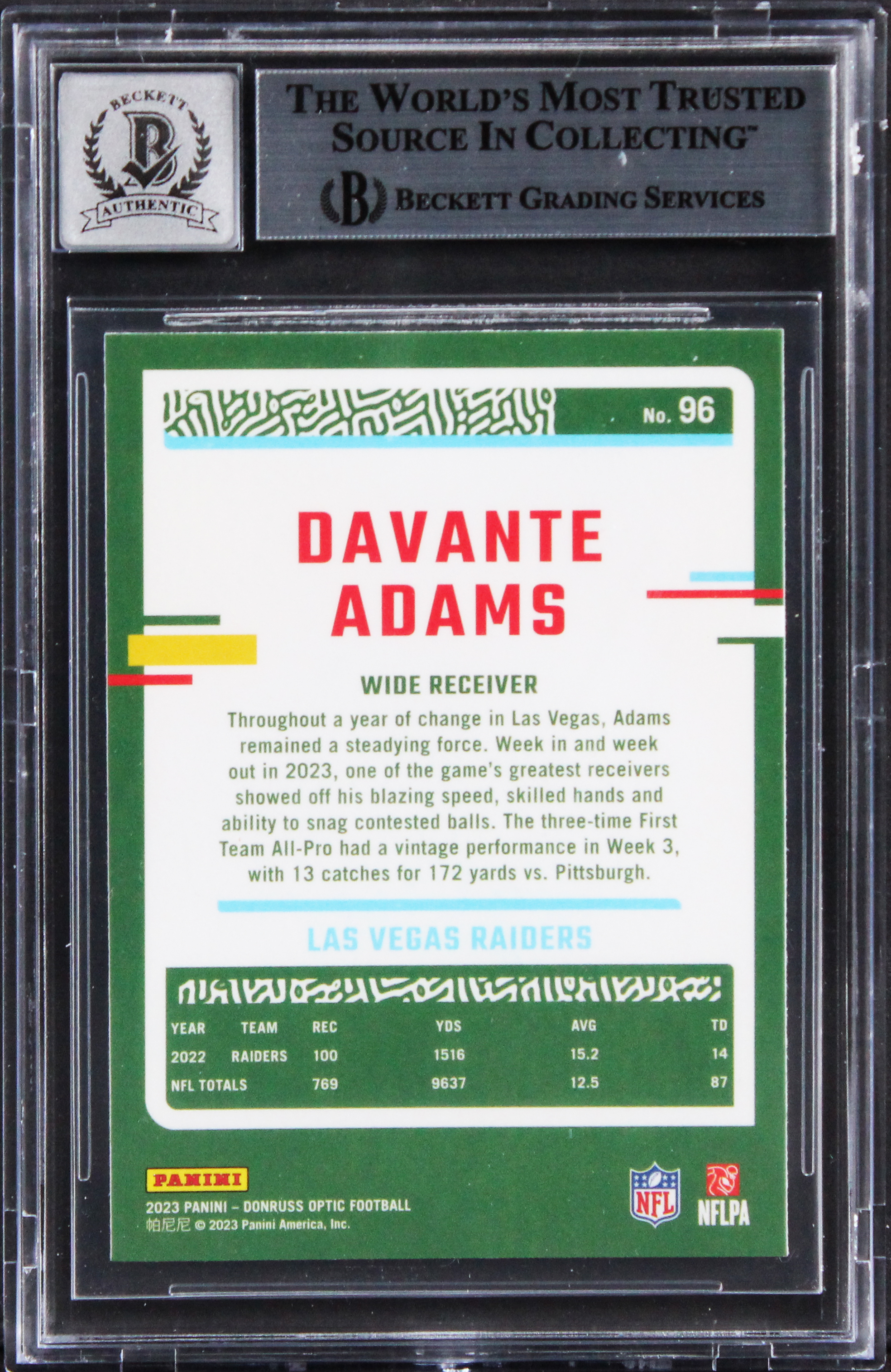 This Autographed Auto Graded Gem Mint 10! 2023 Donruss Optic #96 Card has been Personally Signed by Davante Adams of the Las Vegas Raiders. This item is 100% Authentic, it comes slabbed and authenticated by Beckett Authentication Services. The authenticity can be verified on Beckett Authentication Services website.