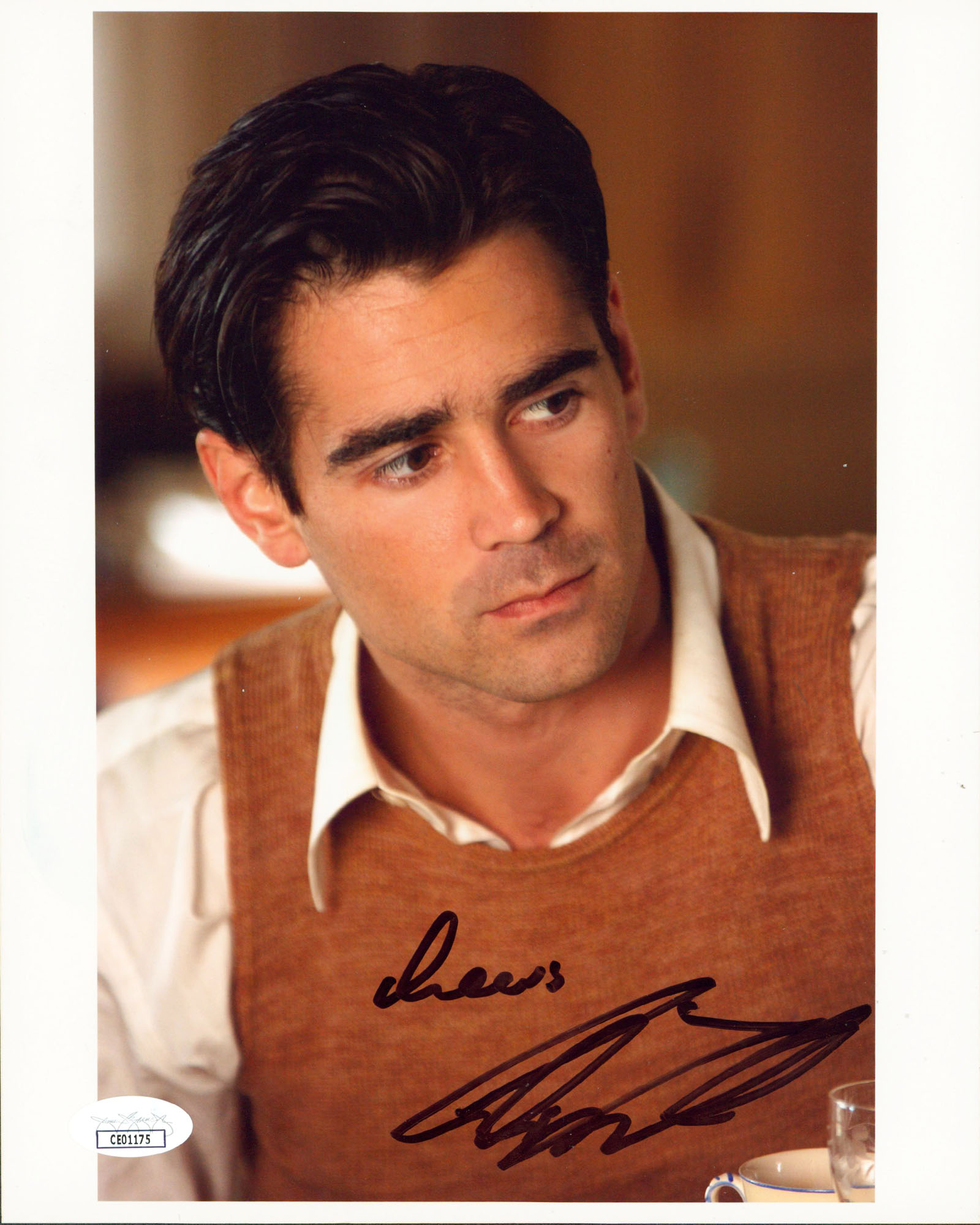 This Autographed Vertical 8x10 Photo with the inscription of "Cheers" has been Personally Signed by Colin Farrell of Tigerland. This item is 100% Authentic to include a Certificate of Authenticity (COA) / hologram by JSA. The authenticity can be verified on JSA website. This photo has handling wear and a damaged signature.
