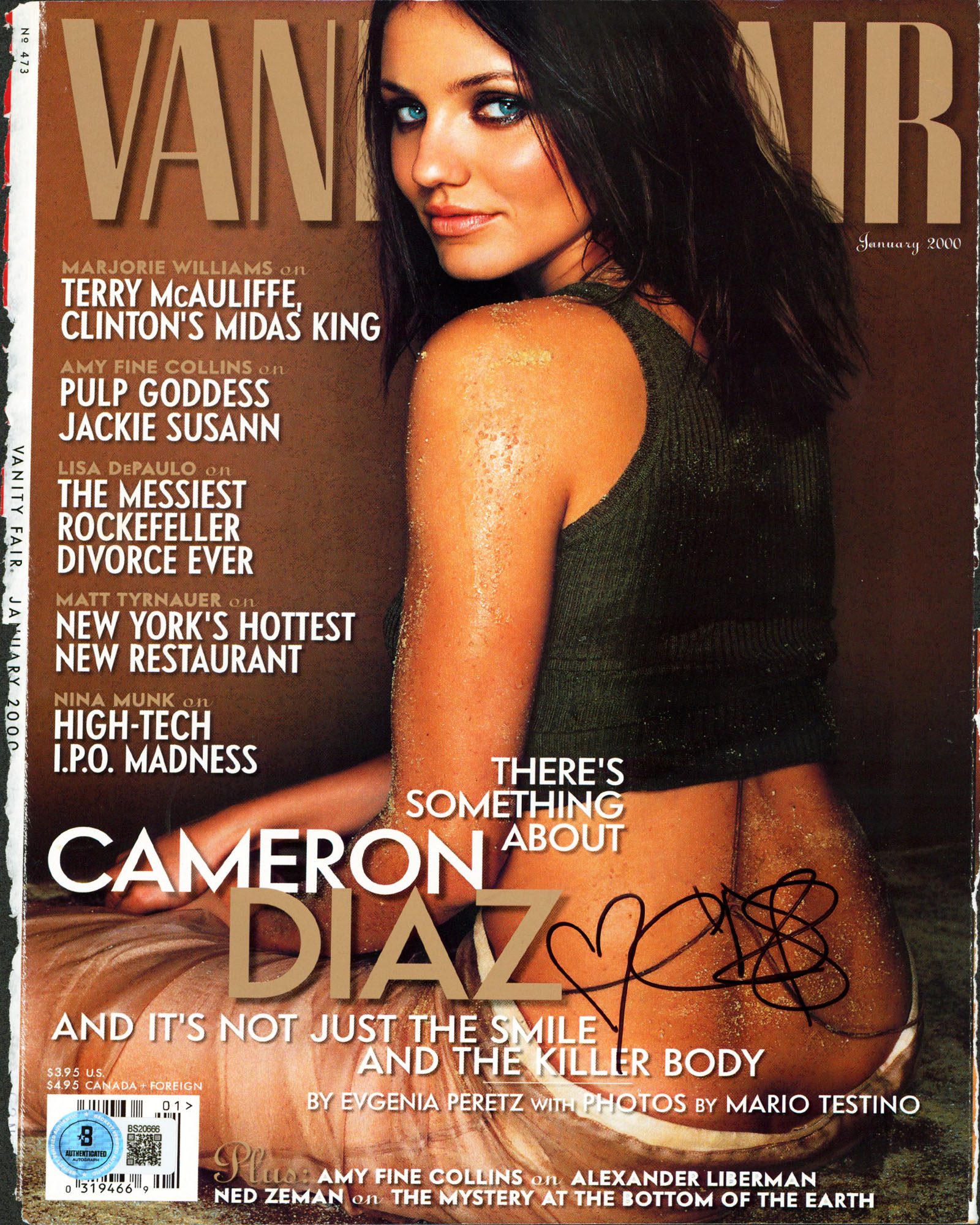 This Autographed January 2000 Vanity Fair Magazine Cover has been Personally Signed by Cameron Diaz. This item is 100% Authentic to include a hologram by Beckett Authentication Services. This item will come with an affixed Beckett Authentication Services (BAS) authentication sticker, which includes a scannable QR code to verify authenticity. Please note that Beckett no longer provides serial-numbered COA cards, and the attached BAS sticker will serve as the complete authentication for this item. The authenticity can be verified on Beckett Authentication Services website.