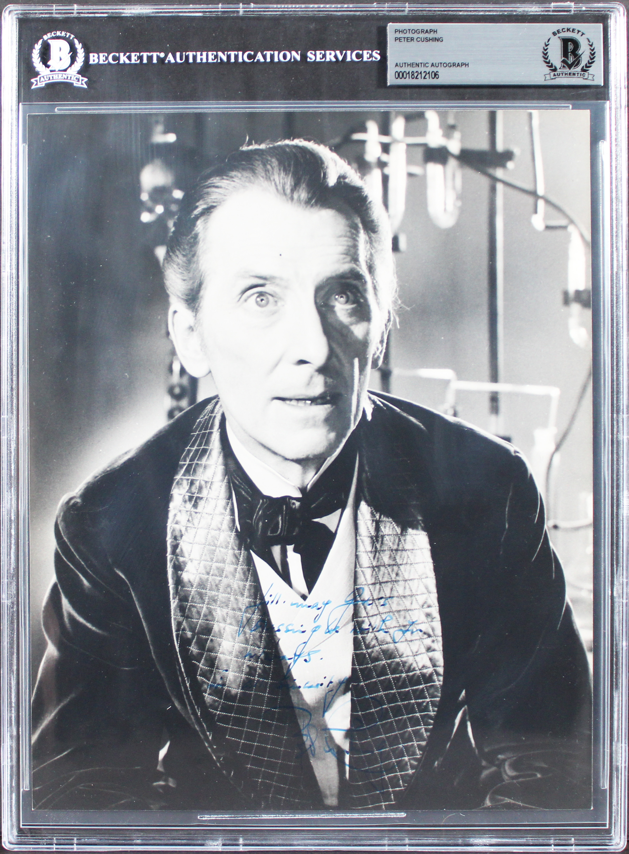 This Autographed 8x10 Photo with the inscription of "Jill, May God's Blessings Be With You Always, In All Sincerity" has been Personally Signed by Peter Cushing of Frankenstein. This item is 100% Authentic, it comes slabbed and authenticated by Beckett Authentication Services. The authenticity can be verified on Beckett Authentication Services website.