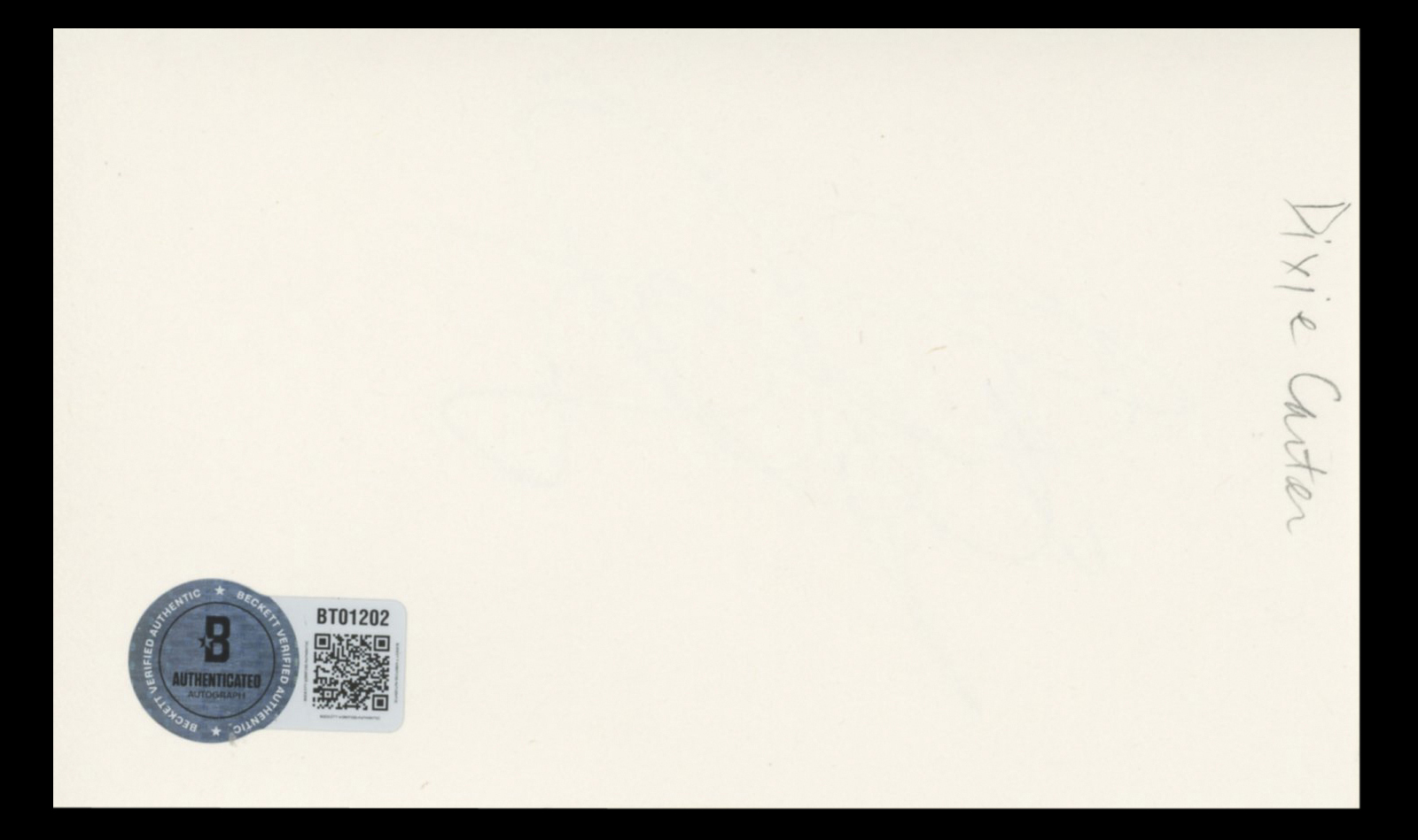 This Autographed 3x5 Index Card has been Personally Signed by Dixie Carter of Designing Women. This item is 100% Authentic to include a hologram by Beckett Authentication Services. This item will come with an affixed Beckett Authentication Services (BAS) authentication sticker, which includes a scannable QR code to verify authenticity. Please note that Beckett no longer provides serial-numbered COA cards, and the attached BAS sticker will serve as the complete authentication for this item. The authenticity can be verified on Beckett Authentication Services website.