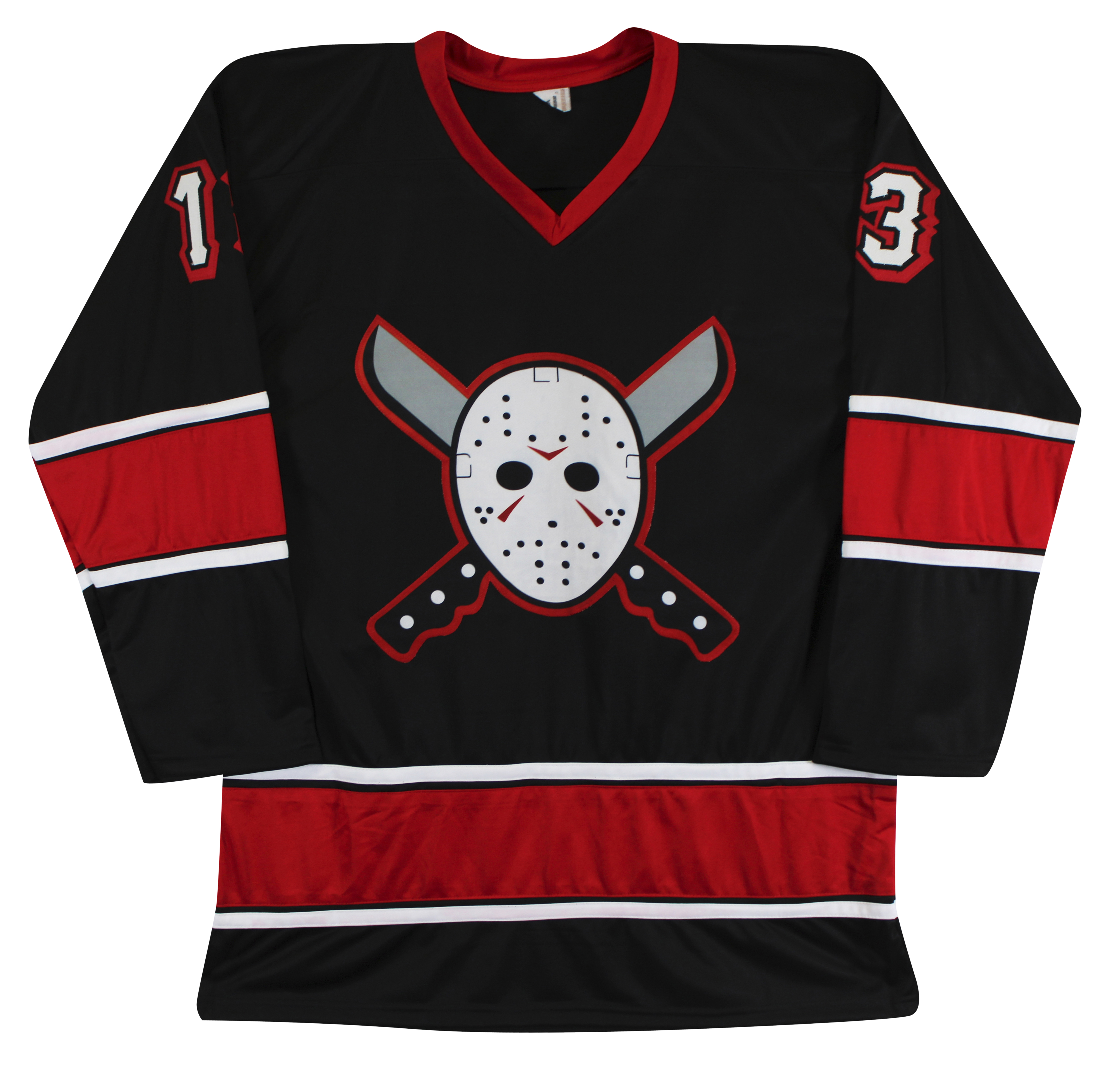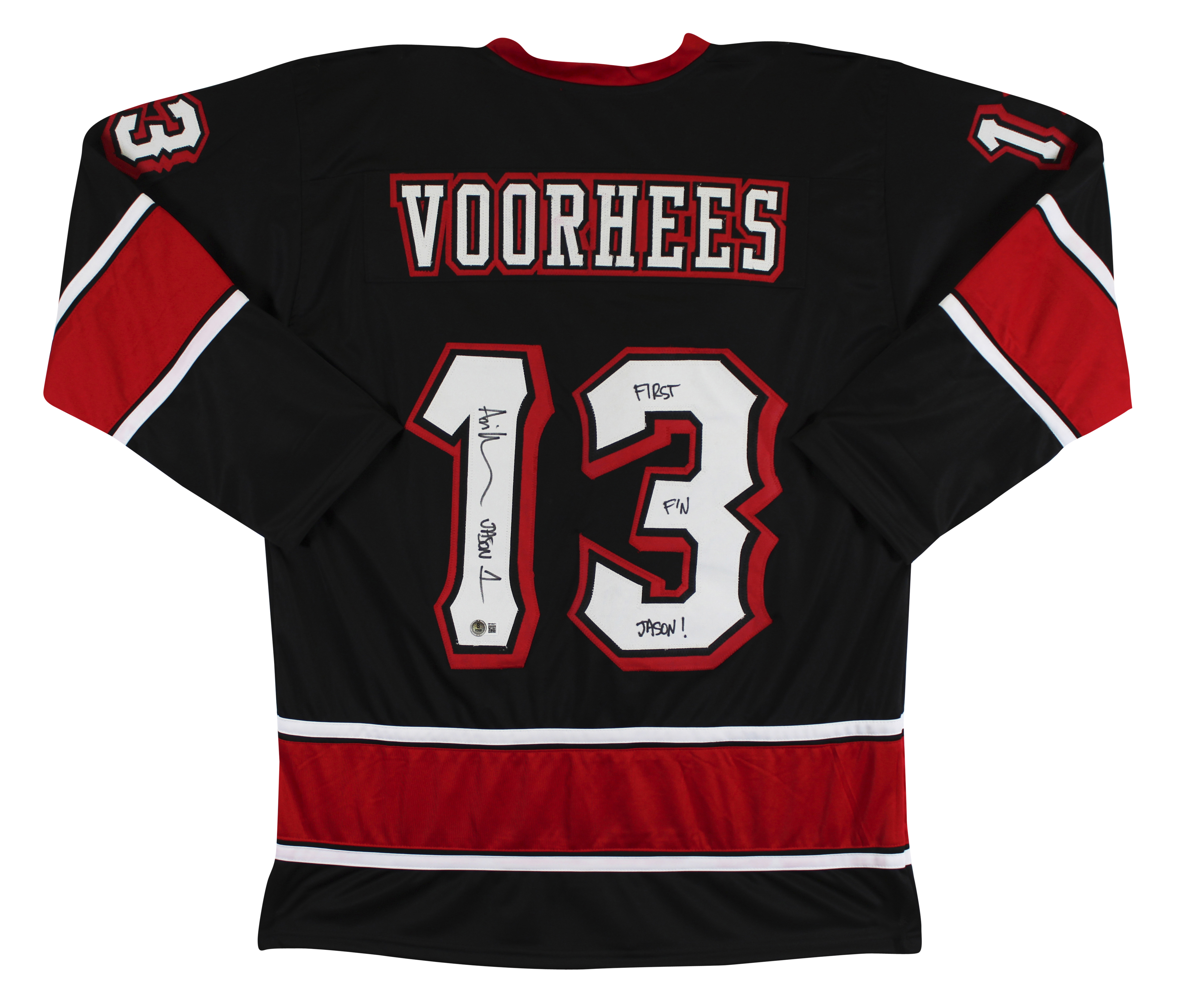 This Autographed Black Jason Voorhees Hockey Jersey with the inscription of "First F'N Jason" has been Personally Signed by Ari Lehman of Friday The 13th. This item is 100% Authentic to include a hologram by Beckett Authentication Services. This item will come with an affixed Beckett Authentication Services (BAS) authentication sticker, which includes a scannable QR code to verify authenticity. Please note that Beckett no longer provides serial-numbered COA cards, and the attached BAS sticker will serve as the complete authentication for this item. This is a BAS Witnessed Protection Program item which means a Beckett Authentication Service representative was present when this item was being signed. We conducted an autograph signing with Ari Lehman where multiples of the same item were signed. While the photographs are representative of this item, the size, placement and strength of the signature may vary. Each item is hand signed, therefore, each autograph is unique. This is a X-Large sized, non-branded, custom-stitched Jersey.