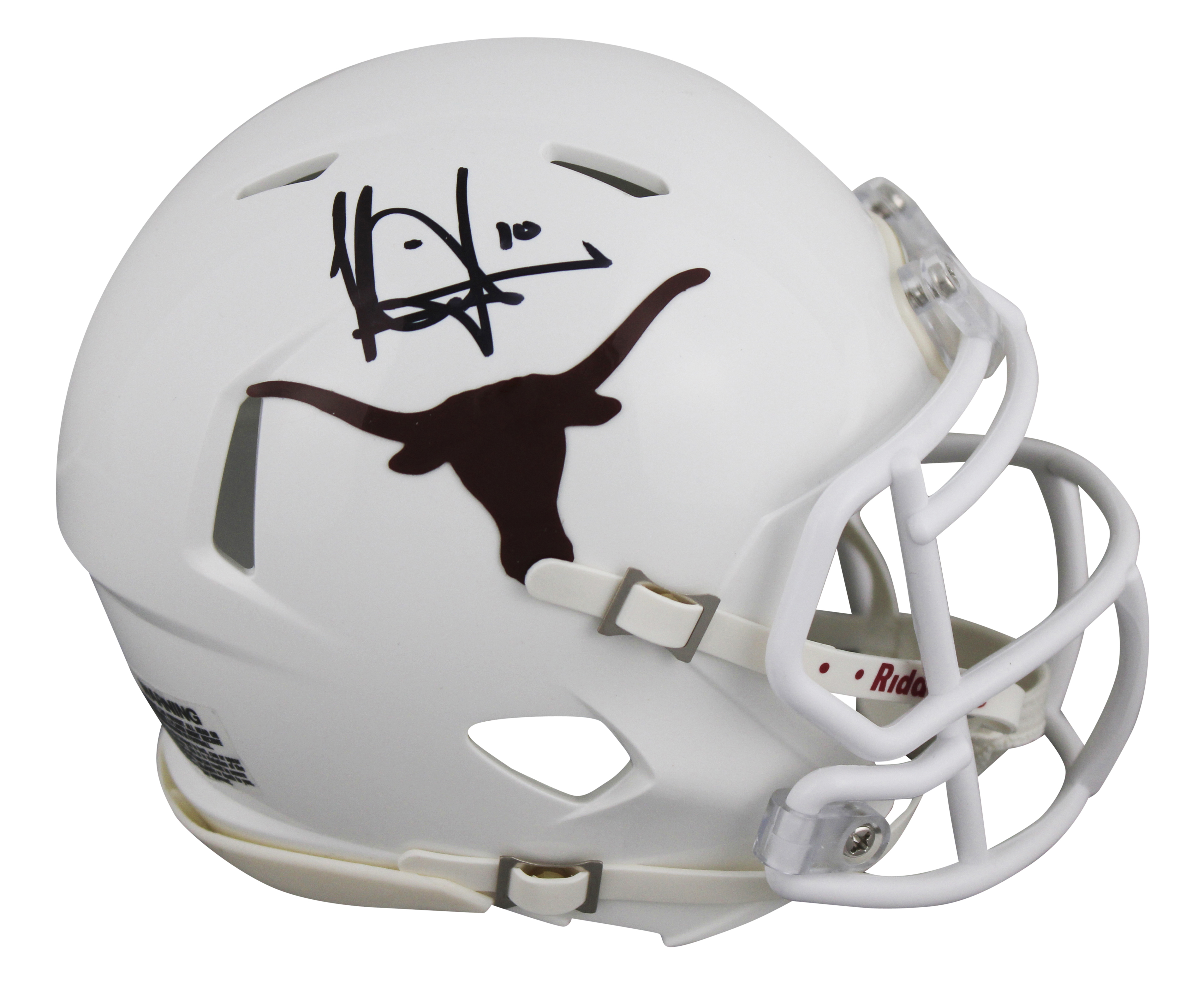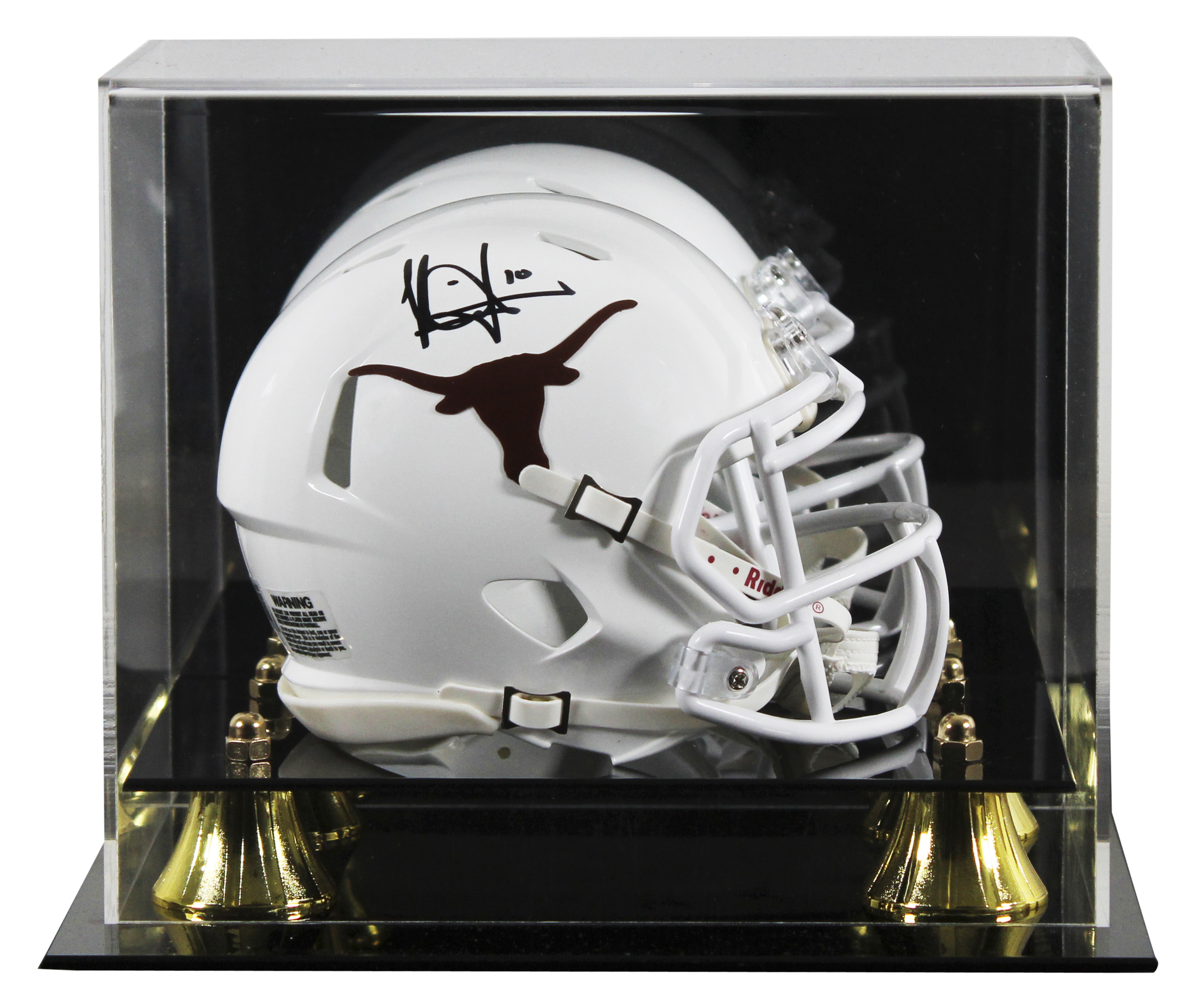 This Autographed Speed Mini Helmet W/ Uv Mirrored Back Acrylic Display Case has been Personally Signed by Vince Young of the Texas Longhorns. This item is 100% Authentic to include a hologram by Beckett Authentication Services. This item will come with an affixed Beckett Authentication Services (BAS) authentication sticker, which includes a scannable QR code to verify authenticity. Please note that Beckett no longer provides serial-numbered COA cards, and the attached BAS sticker will serve as the complete authentication for this item. This is a BAS Witnessed Protection Program item which means a Beckett Authentication Service representative was present when this item was being signed. We conducted an autograph signing with Vince Young where multiples of the same item were signed. While the photographs are representative of this item, the size, placement and strength of the signature may vary. Each item is hand signed, therefore, each autograph is unique. This item can be verified through BAS Witnessed.