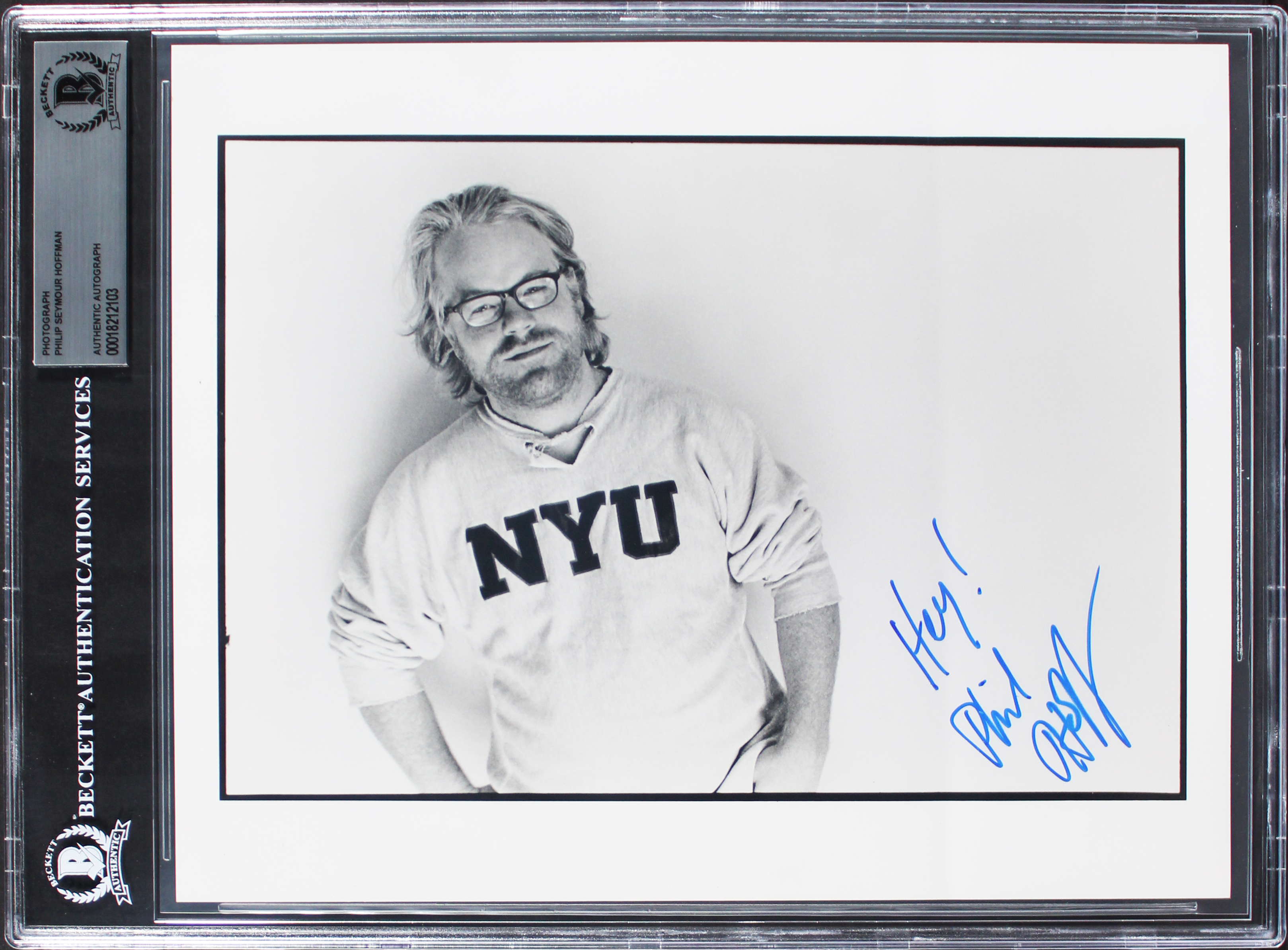 This Autographed 8x10 Photo with the inscription of "Hey!" has been Personally Signed by Philip Seymour Hoffman of Capote. This item is 100% Authentic, it comes slabbed and authenticated by Beckett Authentication Services. The authenticity can be verified on Beckett Authentication Services website.