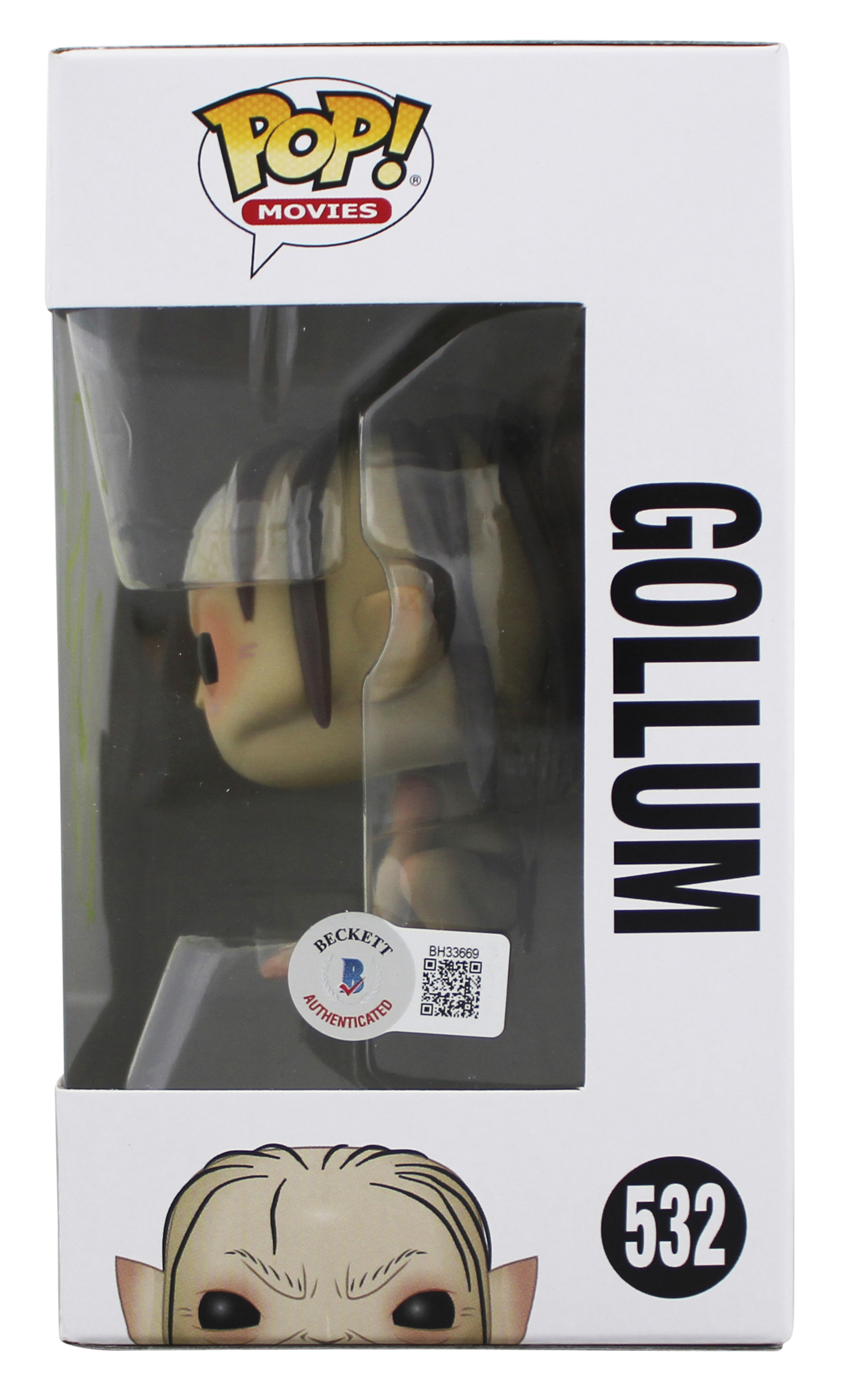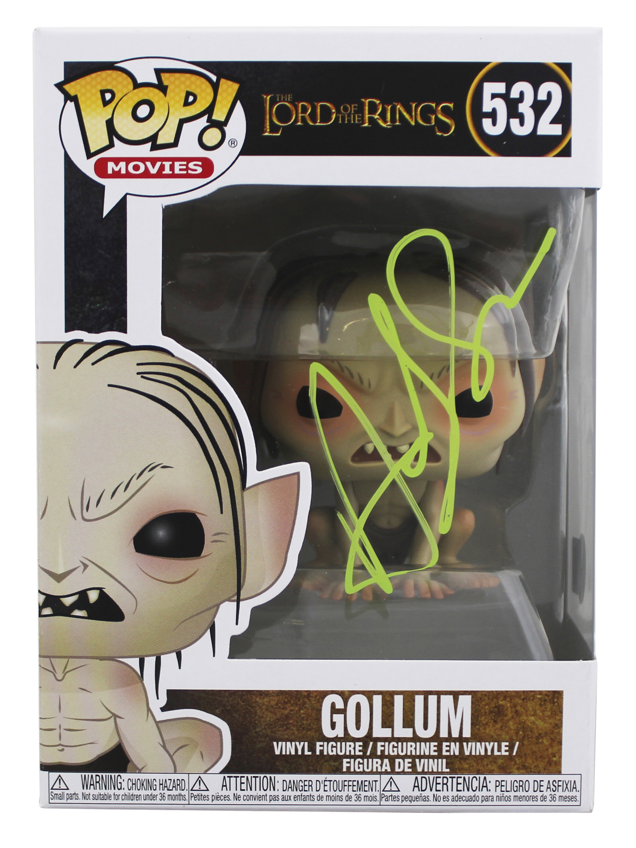 This Autographed w/ Green Signature Gollum #532 Funko Pop Vinyl Figure has been Personally Signed by Andy Serkis of Lord of the Rings. This item is 100% Authentic to include a hologram by Beckett Authentication Services. This item will come with an affixed Beckett Authentication Services (BAS) authentication sticker, which includes a scannable QR code to verify authenticity. Please note that Beckett no longer provides serial-numbered COA cards, and the attached BAS sticker will serve as the complete authentication for this item. We have multiples of this same item. While the photographs are representative of this item, the size, placement and strength of the signature may vary. Each item is hand signed, therefore, each autograph is unique. This item will ship in a Pop! Protector, please refer to the photos for condition of the item prior to purchase, these are in good condition but would not be considered mint.