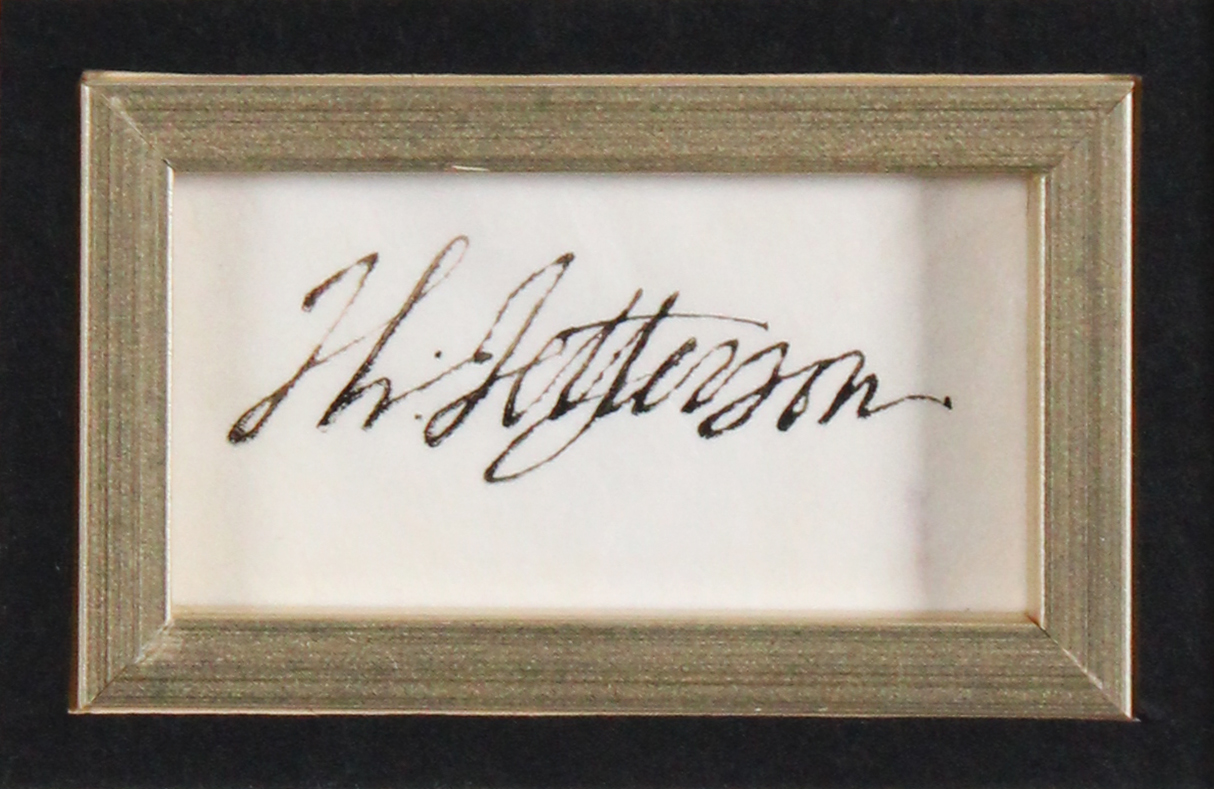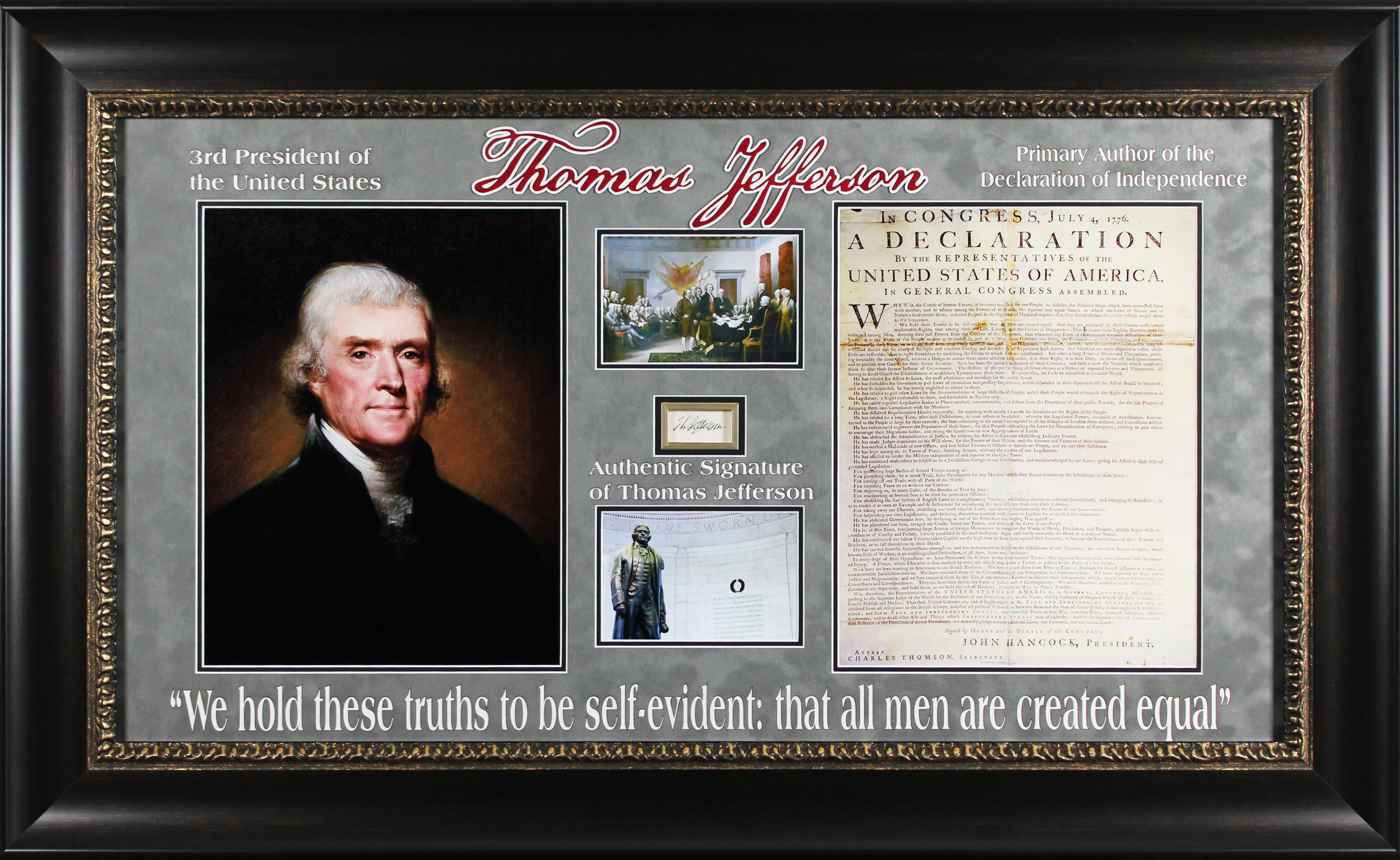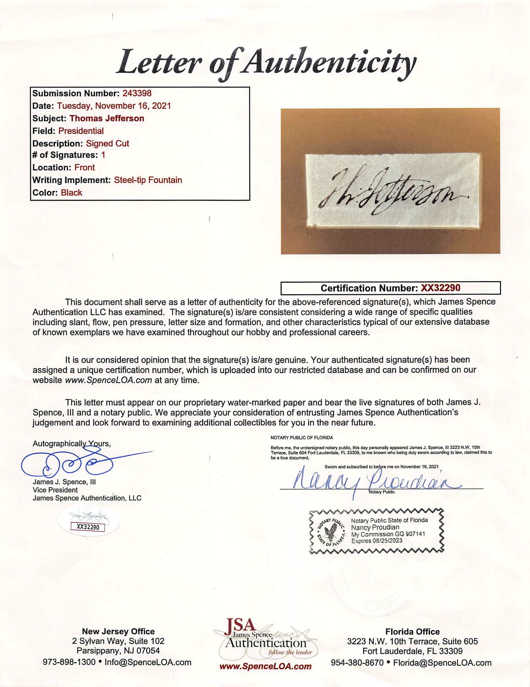 This Autographed & Framed 1.5x2 Cut Signature has been Personally Signed by Thomas Jefferson. This item is 100% Authentic to include a Certificate of Authenticity (COA) / hologram by JSA. The authenticity can be verified on JSA website. This item has been professionally framed to overall dimensions of approximately 25.5 x 41.5 inches.