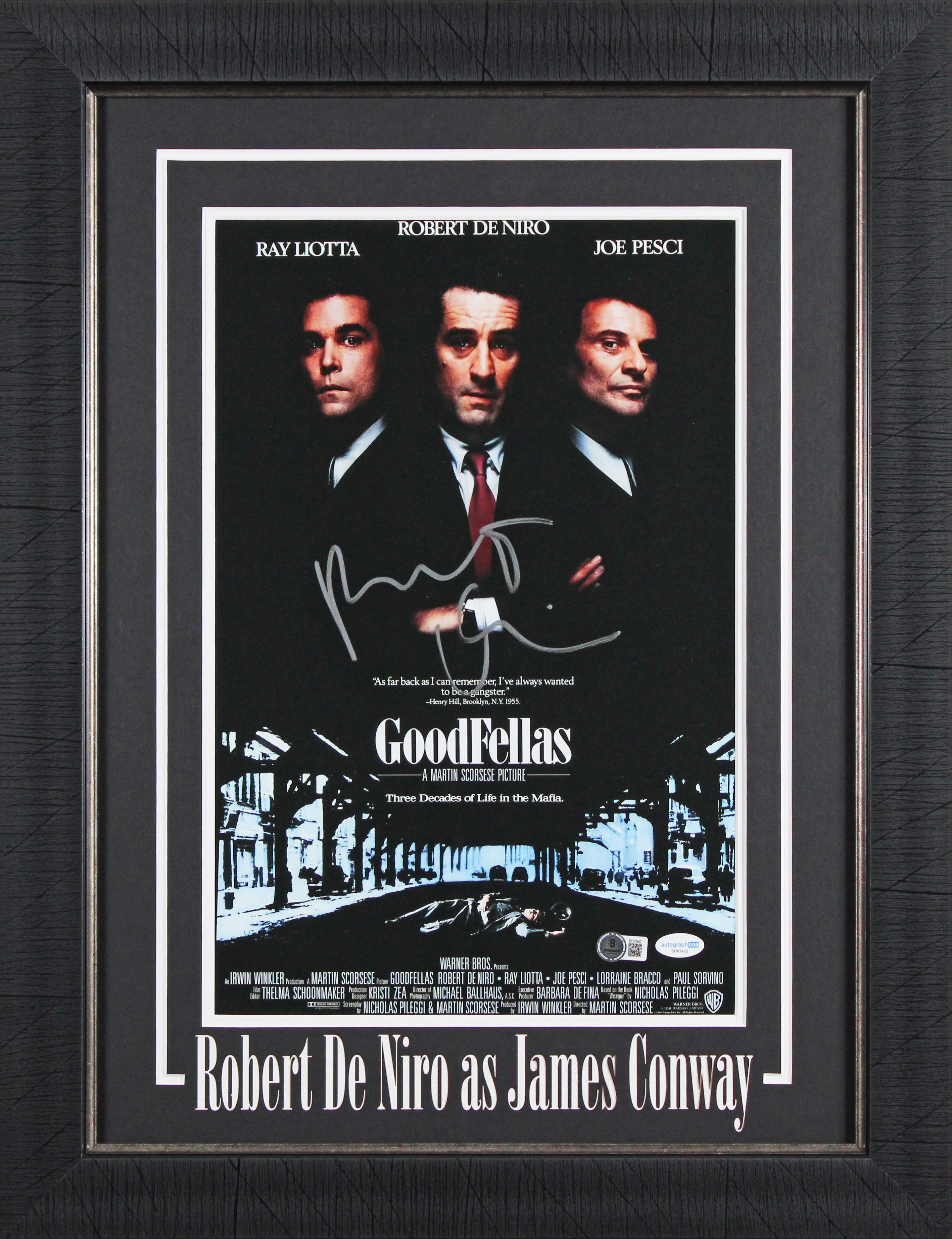 This Autographed 11x17 Mini Movie Poster Framed Photo has been Personally Signed by Robert DeNiro of Goodfellas. This item is 100% Authentic to include a hologram by Beckett Authentication Services. This item will come with an affixed Beckett Authentication Services (BAS) authentication sticker, which includes a scannable QR code to verify authenticity. Please note that Beckett no longer provides serial-numbered COA cards, and the attached BAS sticker will serve as the complete authentication for this item. The authenticity can be verified on Beckett Authentication Services website. This item has been professionally framed to overall dimensions of approximately 19.5 x 25.5 inches.