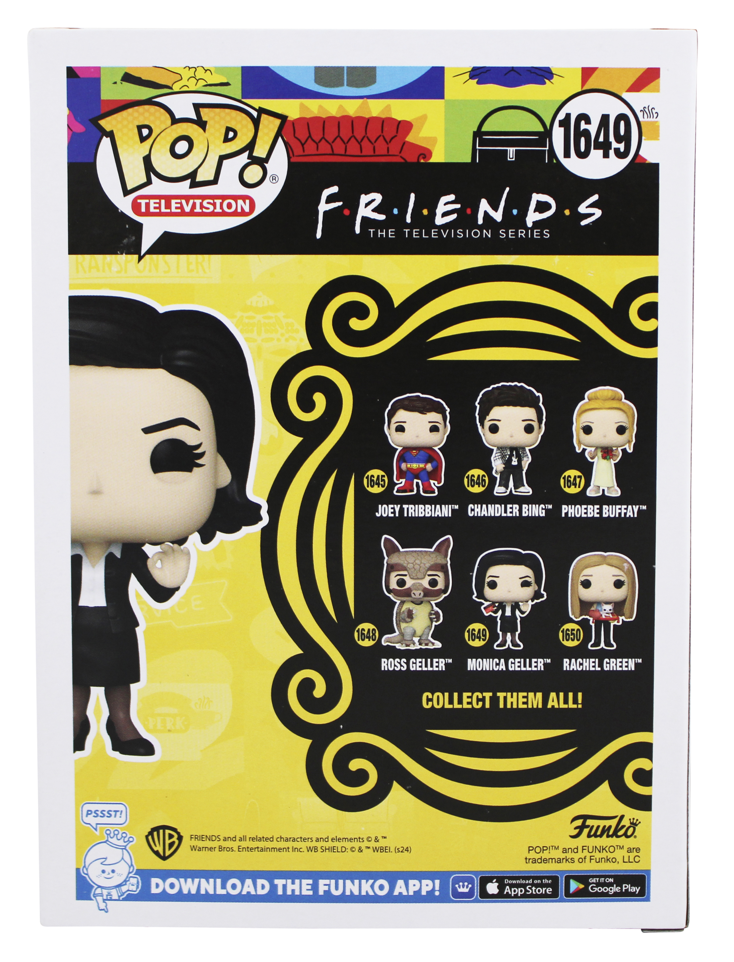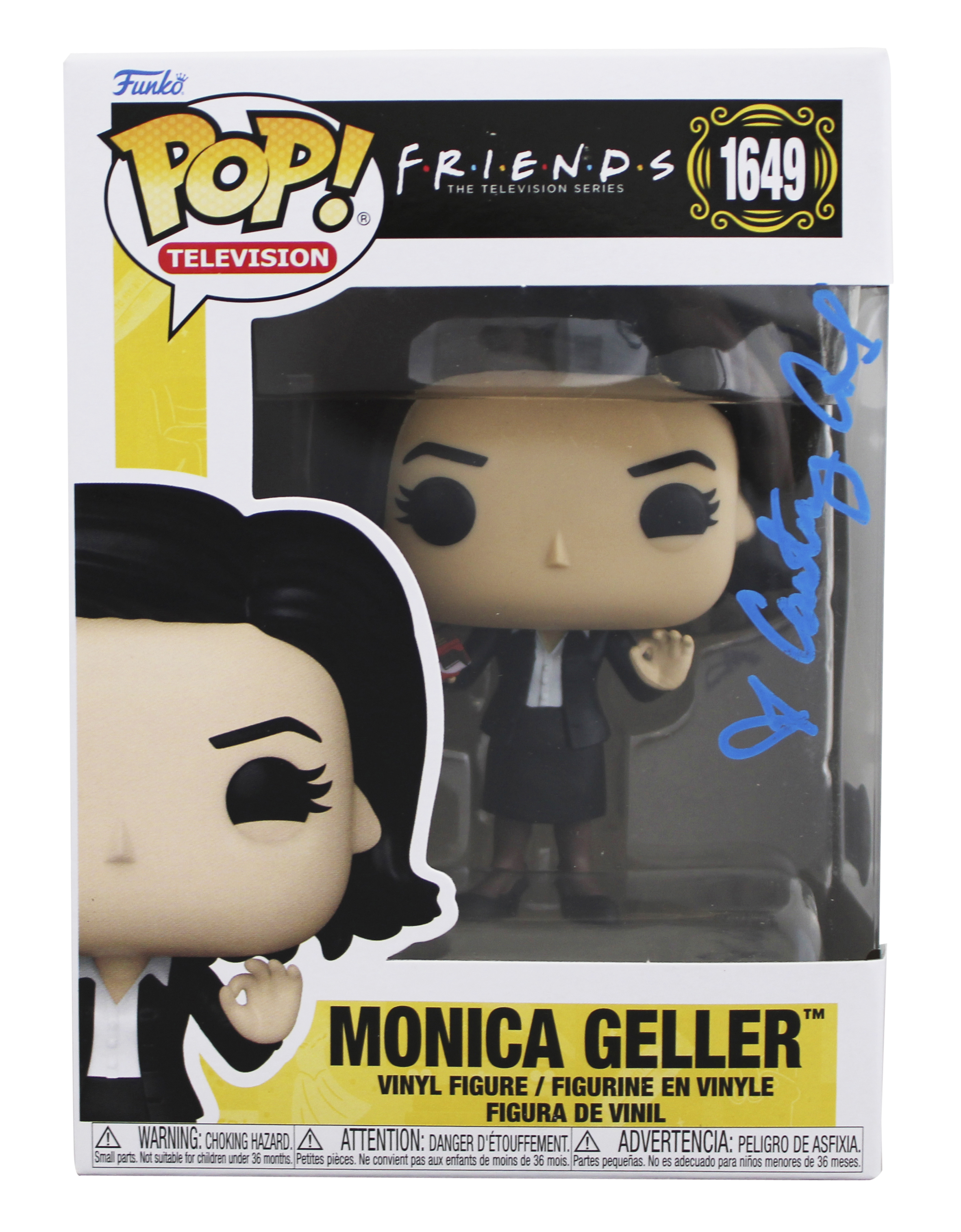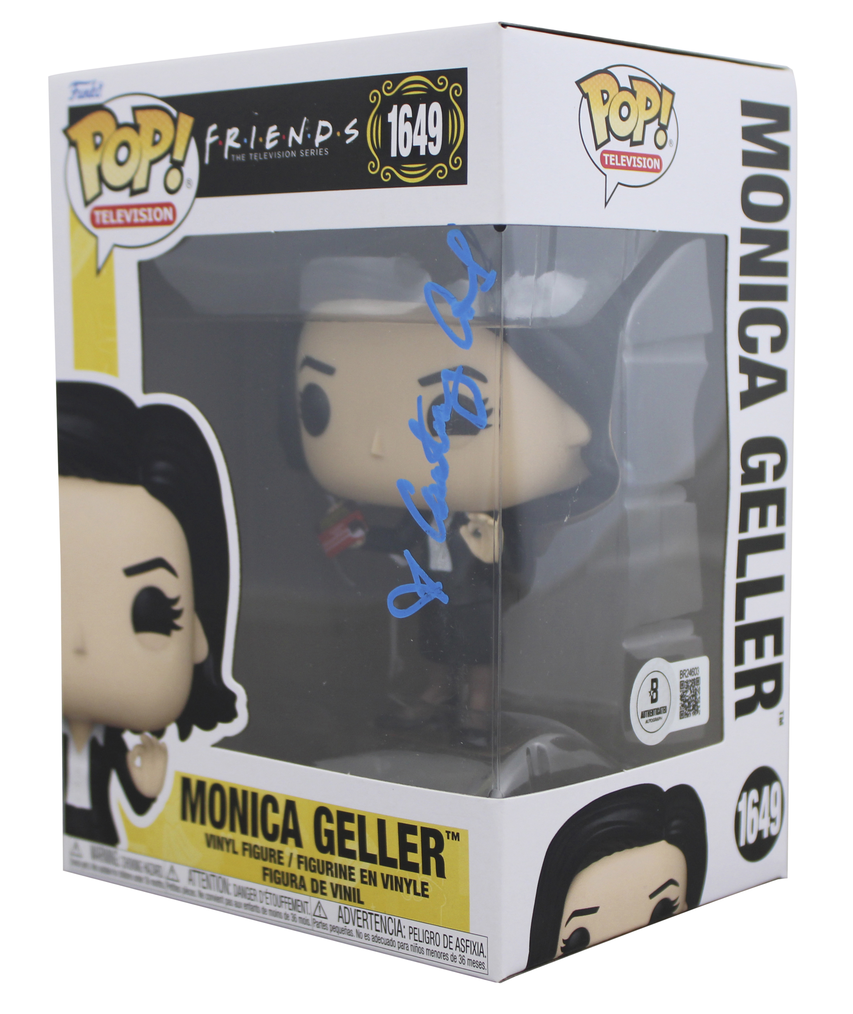 This Autographed Monica Geller #1649 Funko Pop Vinyl Figure has been Personally Signed by Courtney Cox of Friends. This item is 100% Authentic to include a hologram by Beckett Authentication Services. This item will come with an affixed Beckett Authentication Services (BAS) authentication sticker, which includes a scannable QR code to verify authenticity. Please note that Beckett no longer provides serial-numbered COA cards, and the attached BAS sticker will serve as the complete authentication for this item. The authenticity can be verified on Beckett Authentication Services website. This will be shipped in a Pop Protector. This Funko will have some handling wear from shipment to the signing and back. Please refer to pictures for item's condition prior to purchase.
