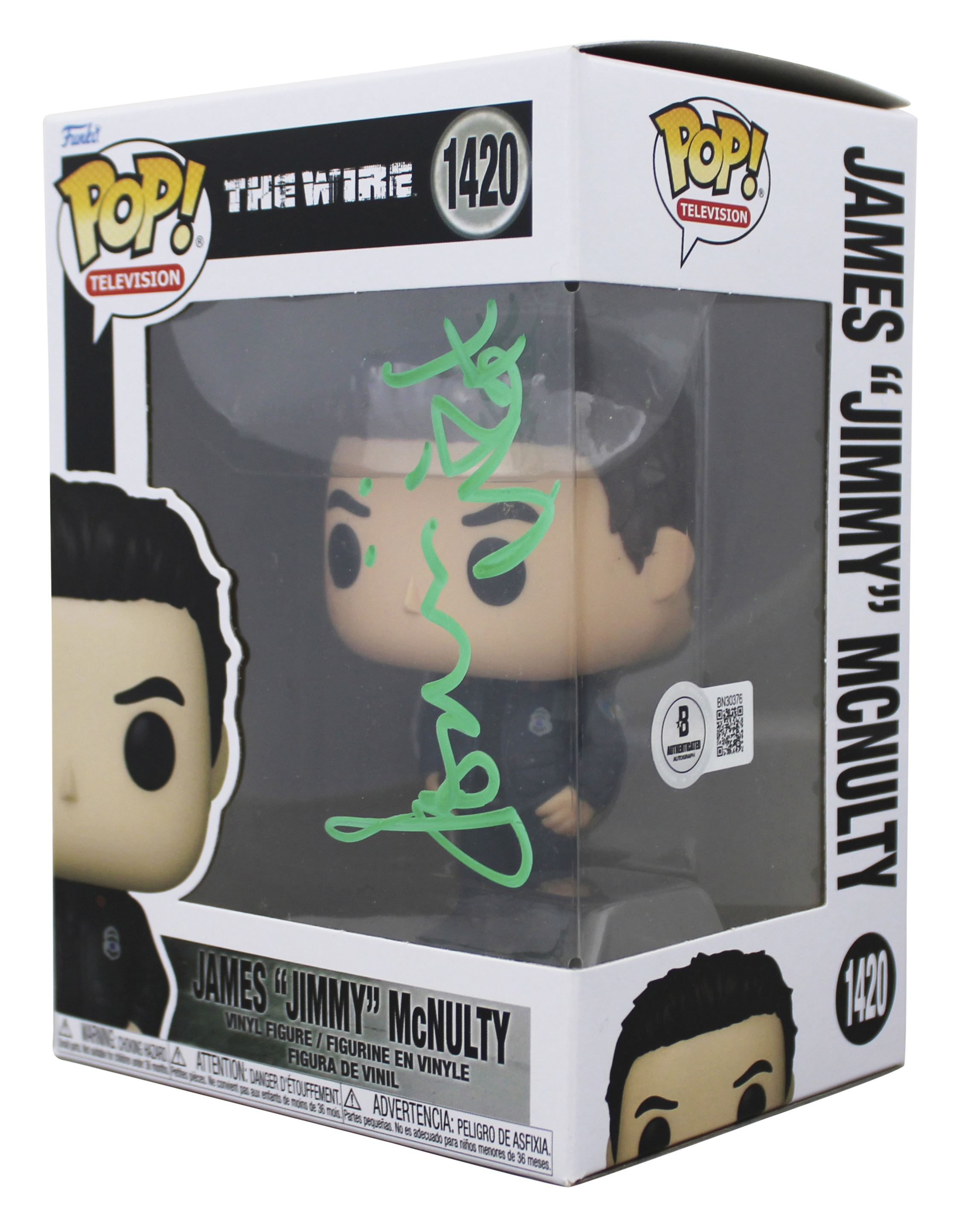This Autographed James "Jimmy" McNulty #1420 Funko Pop Vinyl Figure has been Personally Signed by Dominic West of The Wire. This item is 100% Authentic to include a hologram by Beckett Authentication Services. This item will come with an affixed Beckett Authentication Services (BAS) authentication sticker, which includes a scannable QR code to verify authenticity. Please note that Beckett no longer provides serial-numbered COA cards, and the attached BAS sticker will serve as the complete authentication for this item. The authenticity can be verified on Beckett Authentication Services website. This will be shipped in a Pop Protector. This Funko will have some handling wear from shipment to the signing and back. Please refer to pictures for item's condition prior to purchase.