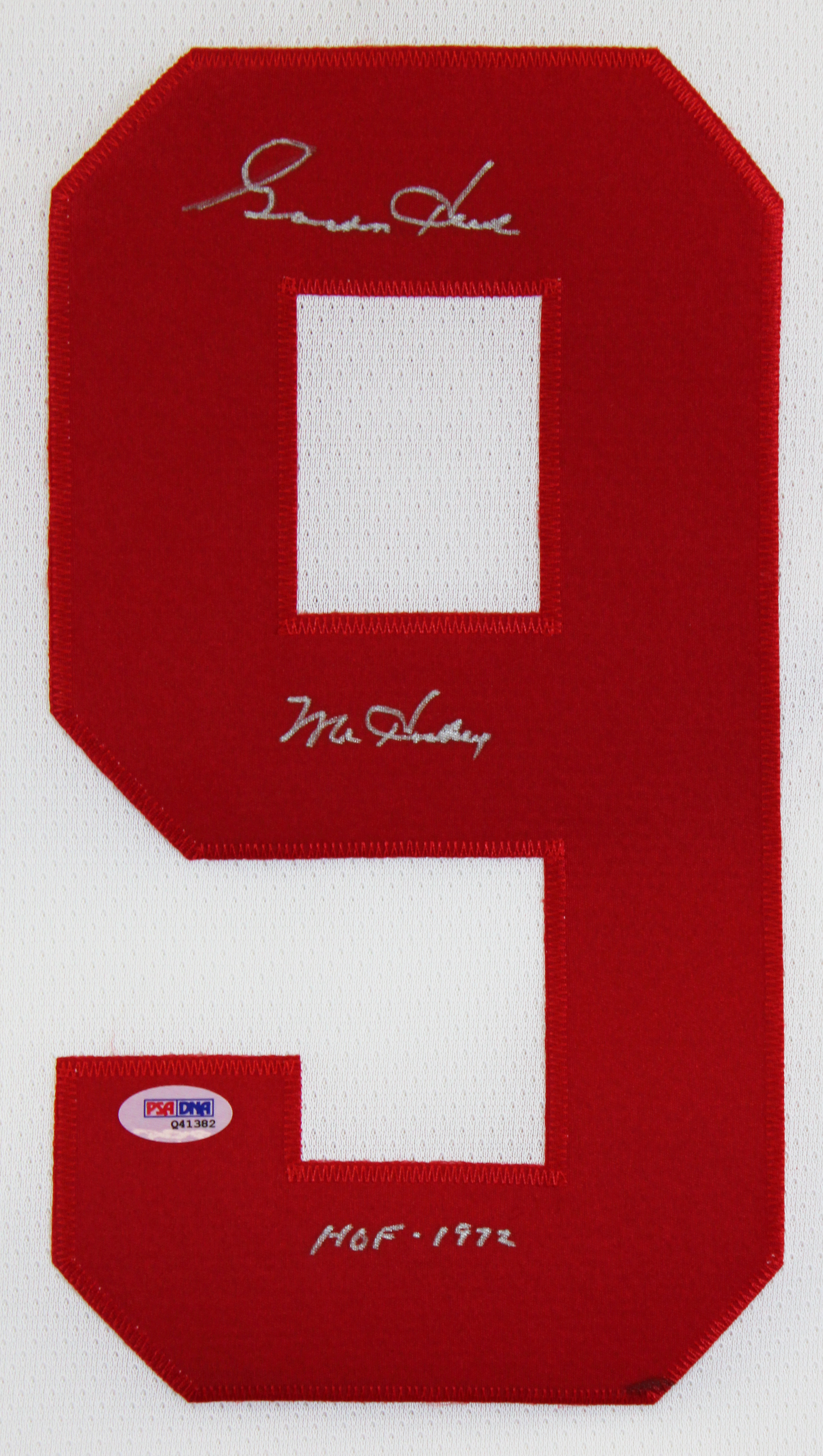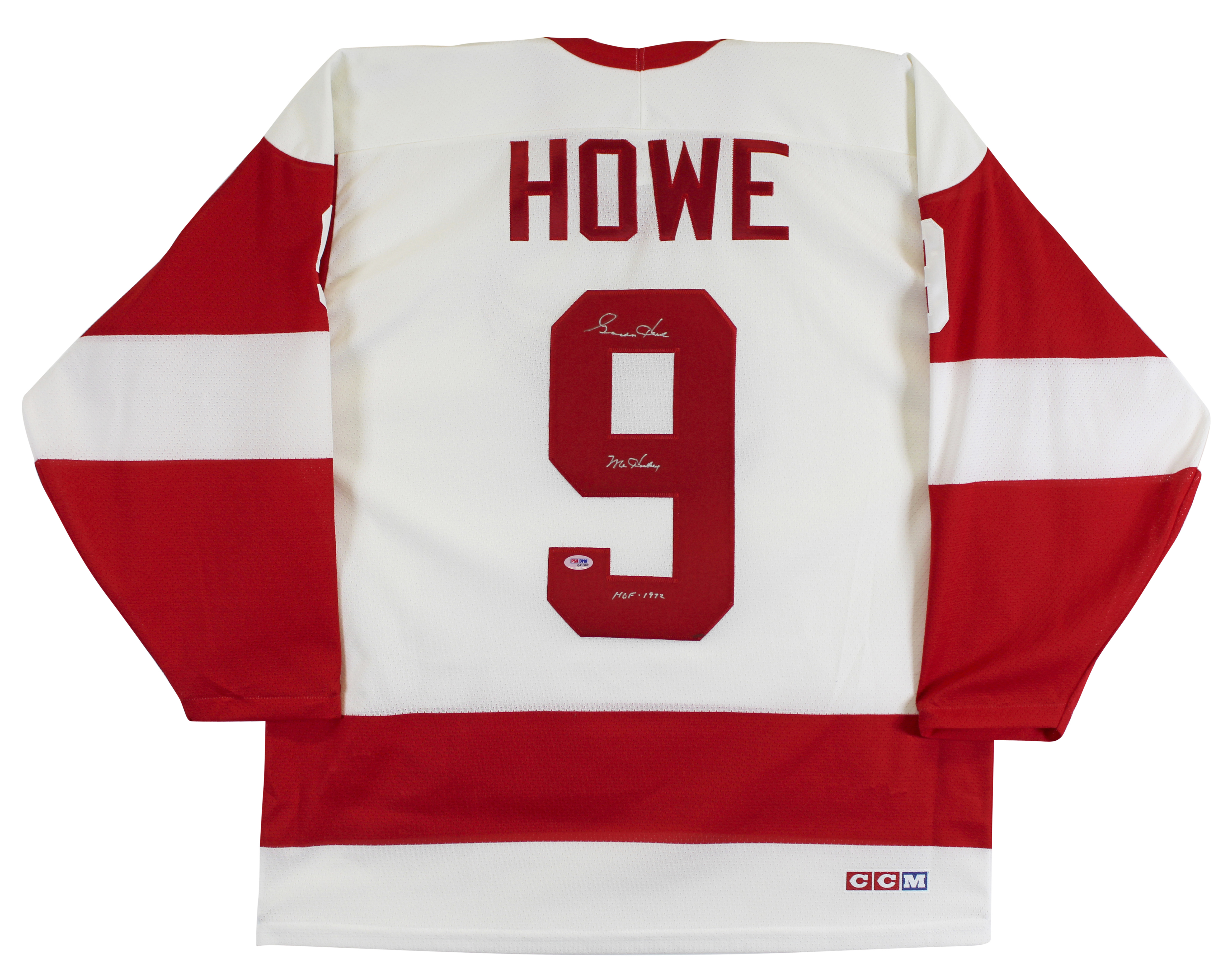 This Autographed White CCM Jersey with the inscription of "Mr. Hockey, HOF 1972" has been Personally Signed by Gordie Howe of the Detroit Red Wings. This item is 100% Authentic and comes with a PSA/DNA Certification Card and a matching numbered Hologram. The authenticity can be verified on Professional Sports Authenticator website. This is a Large sized Jersey.