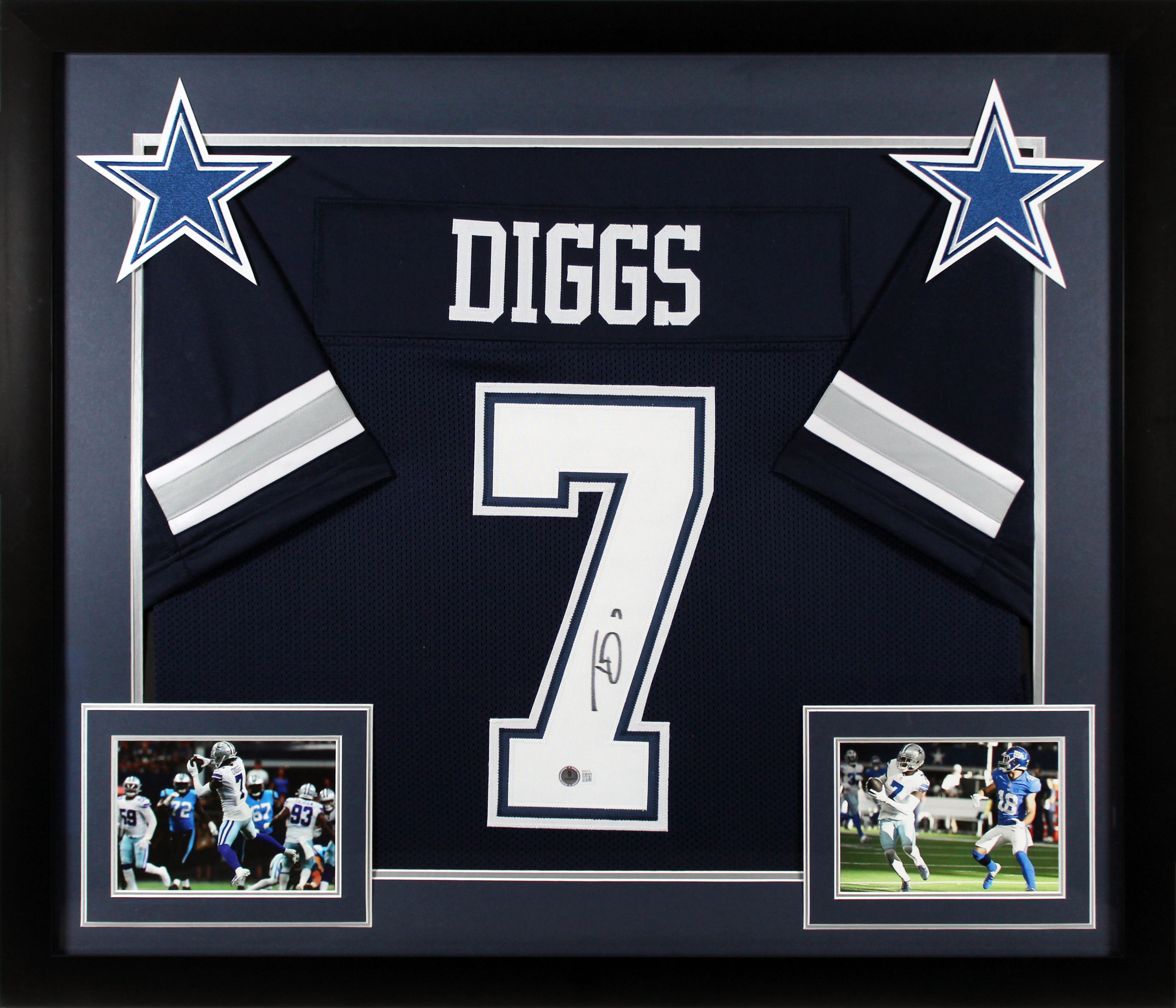 This Autographed Navy Pro Style Framed Jersey has been Personally Signed by Trevon Diggs of the Dallas Cowboys. This item is 100% Authentic to include a hologram by Beckett Authentication Services. This item will come with an affixed Beckett Authentication Services (BAS) authentication sticker, which includes a scannable QR code to verify authenticity. Please note that Beckett no longer provides serial-numbered COA cards, and the attached BAS sticker will serve as the complete authentication for this item. This is a BAS Witnessed Protection Program item which means a Beckett Authentication Service representative was present when this item was being signed. We conducted an autograph signing with Trevon Diggs where multiples of the same item were signed. While the photographs are representative of this item, the size, placement and strength of the signature may vary. Each item is hand signed, therefore, each autograph is unique. This item can be verified through BAS Witnessed. This item has been professionally framed to overall dimensions of approximately 32 x 37 inches. This is a X-Large sized, non-branded, custom-stitched Framed Jersey. This jersey will be framed to order, it will take approximately 3-4 business days from purchase date for it to ship.