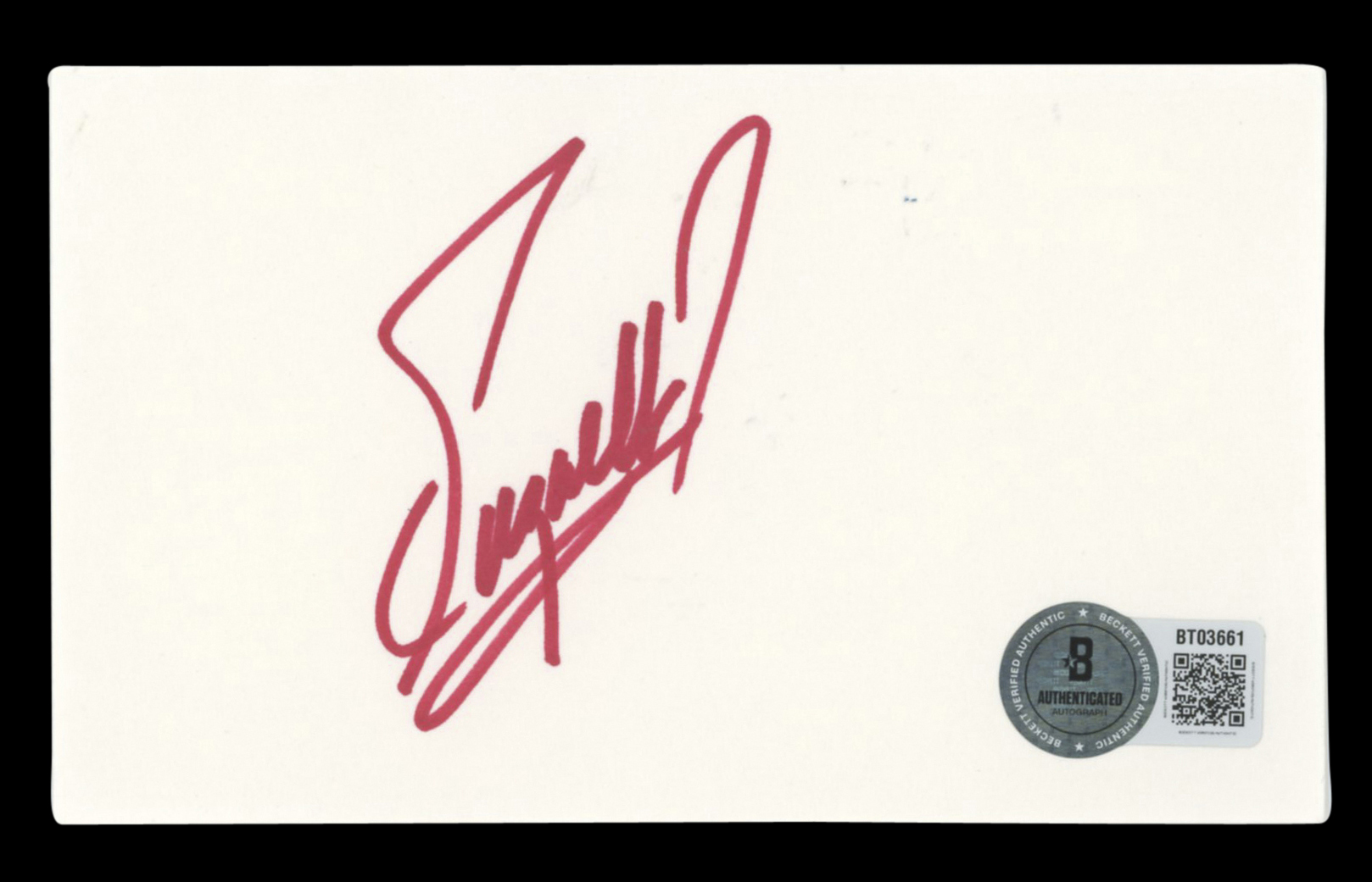 This Autographed 3x5 Index Card has been Personally Signed by Fuzzy Zoeller. This item is 100% Authentic to include a hologram by Beckett Authentication Services. This item will come with an affixed Beckett Authentication Services (BAS) authentication sticker, which includes a scannable QR code to verify authenticity. Please note that Beckett no longer provides serial-numbered COA cards, and the attached BAS sticker will serve as the complete authentication for this item. The authenticity can be verified on Beckett Authentication Services website.