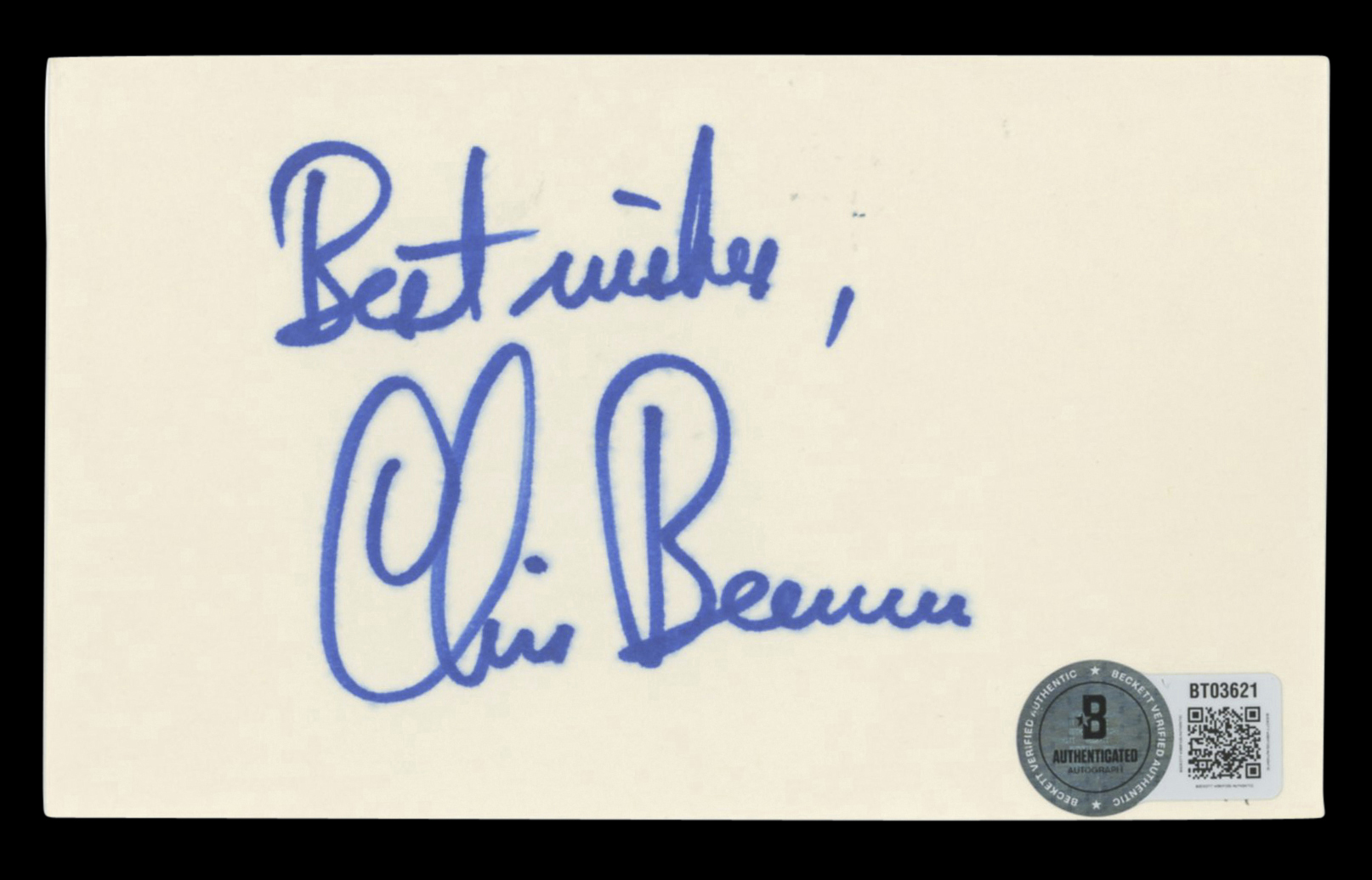 This Autographed 3x5 Index Card with the inscription of "Best Wishes" has been Personally Signed by Chris Berman. This item is 100% Authentic to include a hologram by Beckett Authentication Services. This item will come with an affixed Beckett Authentication Services (BAS) authentication sticker, which includes a scannable QR code to verify authenticity. Please note that Beckett no longer provides serial-numbered COA cards, and the attached BAS sticker will serve as the complete authentication for this item. The authenticity can be verified on Beckett Authentication Services website.
