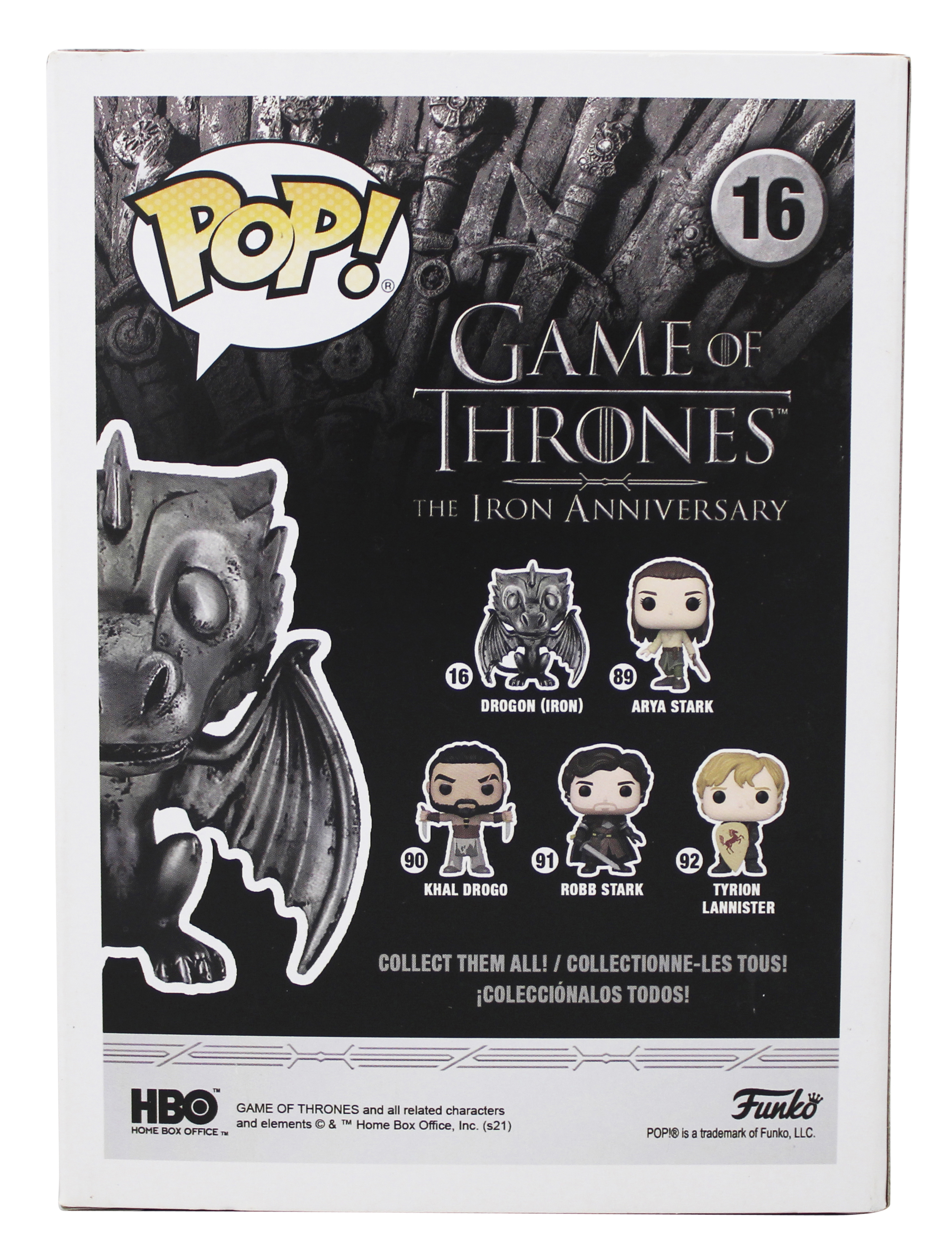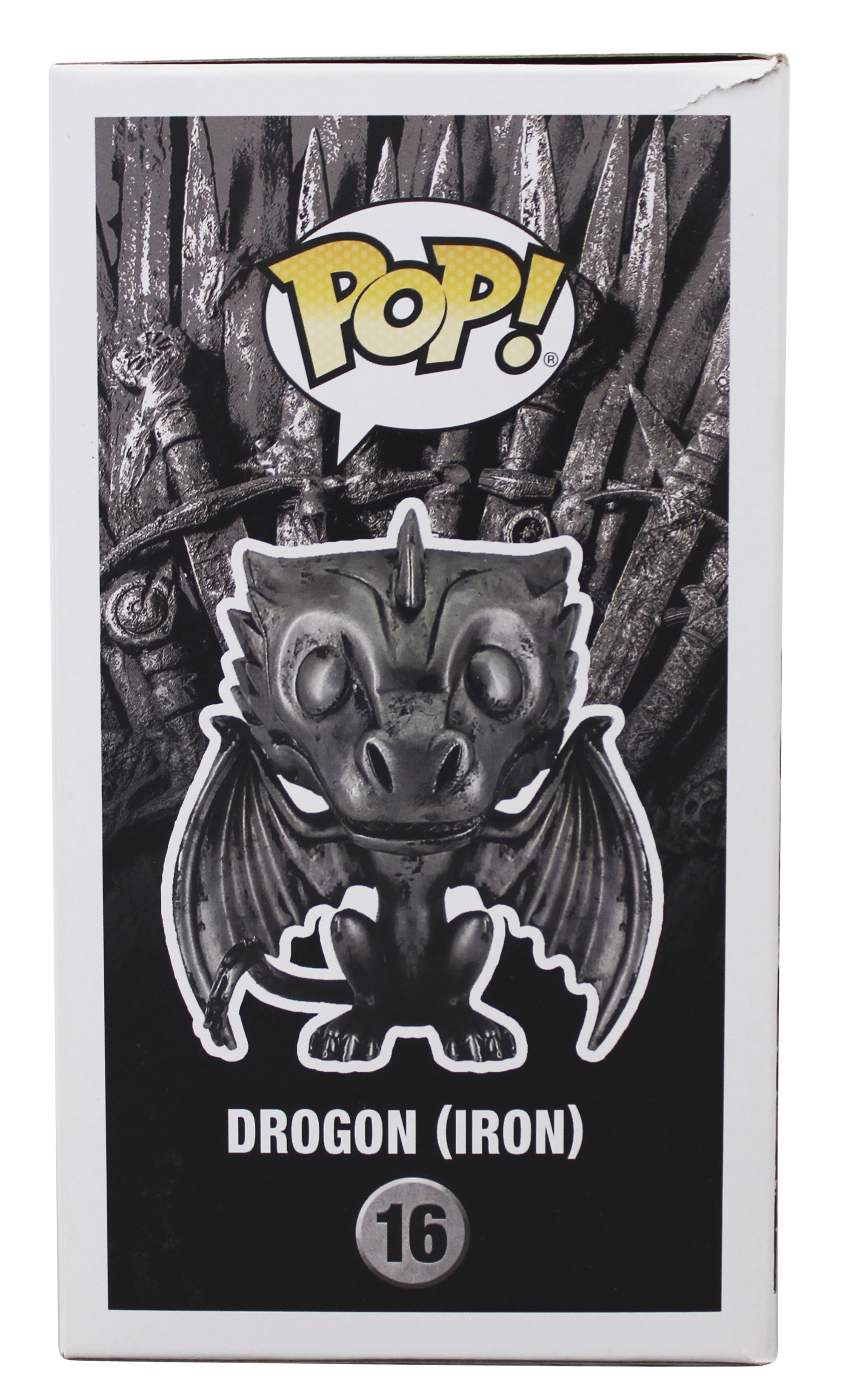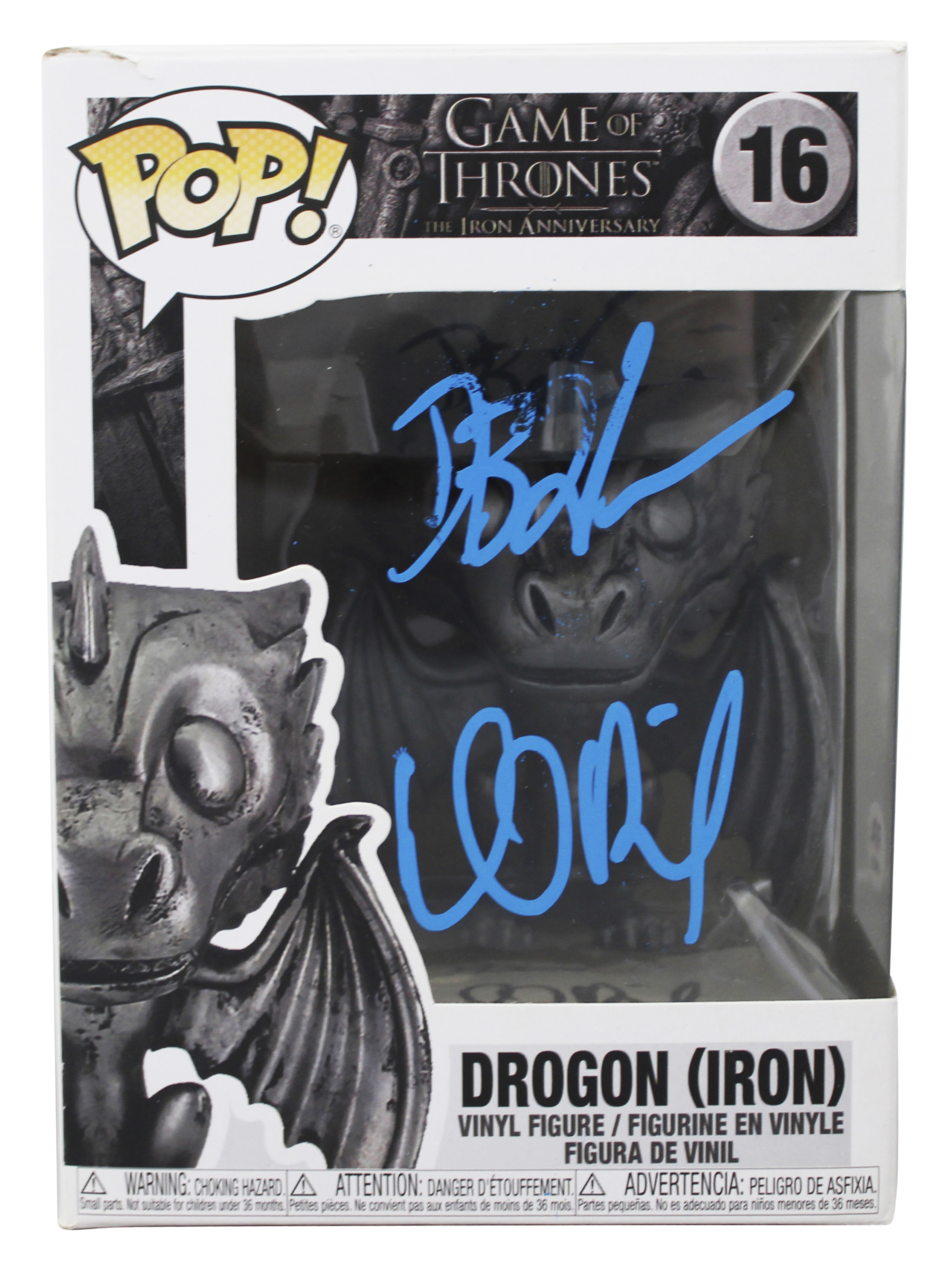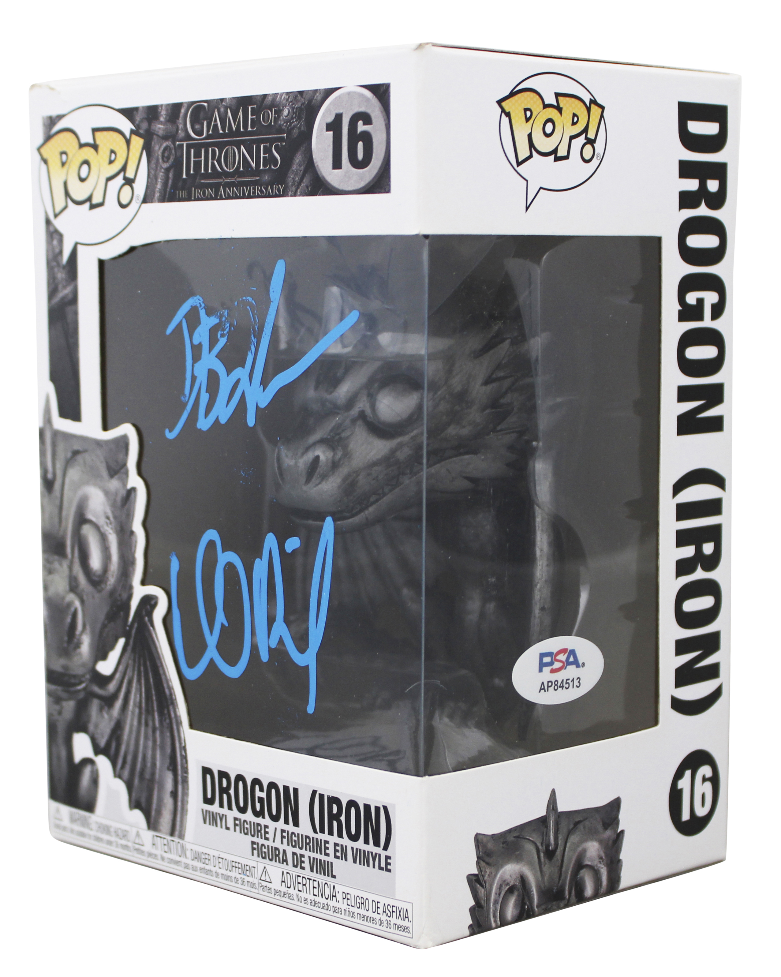 This Autographed Drogon (Iron) #16 Funko Pop Vinyl Figure has been Personally Signed by David Benioff & D.B. Weiss of Game of Thrones. This item is 100% Authentic and comes with a PSA/DNA Certification numbered Hologram. Please note that PSA/DNA no longer provides serial-numbered COA cards, and the attached PSA/DNA sticker will serve as the complete authentication for this item. The authenticity can be verified on Professional Sports Authenticators website. This will be shipped in a Pop Protector, each will have some handling wear from shipment to the signing and back. These would not be considered mint. There are some tears on the box of this Funko. Please refer to photos for item's condition prior to purchase.