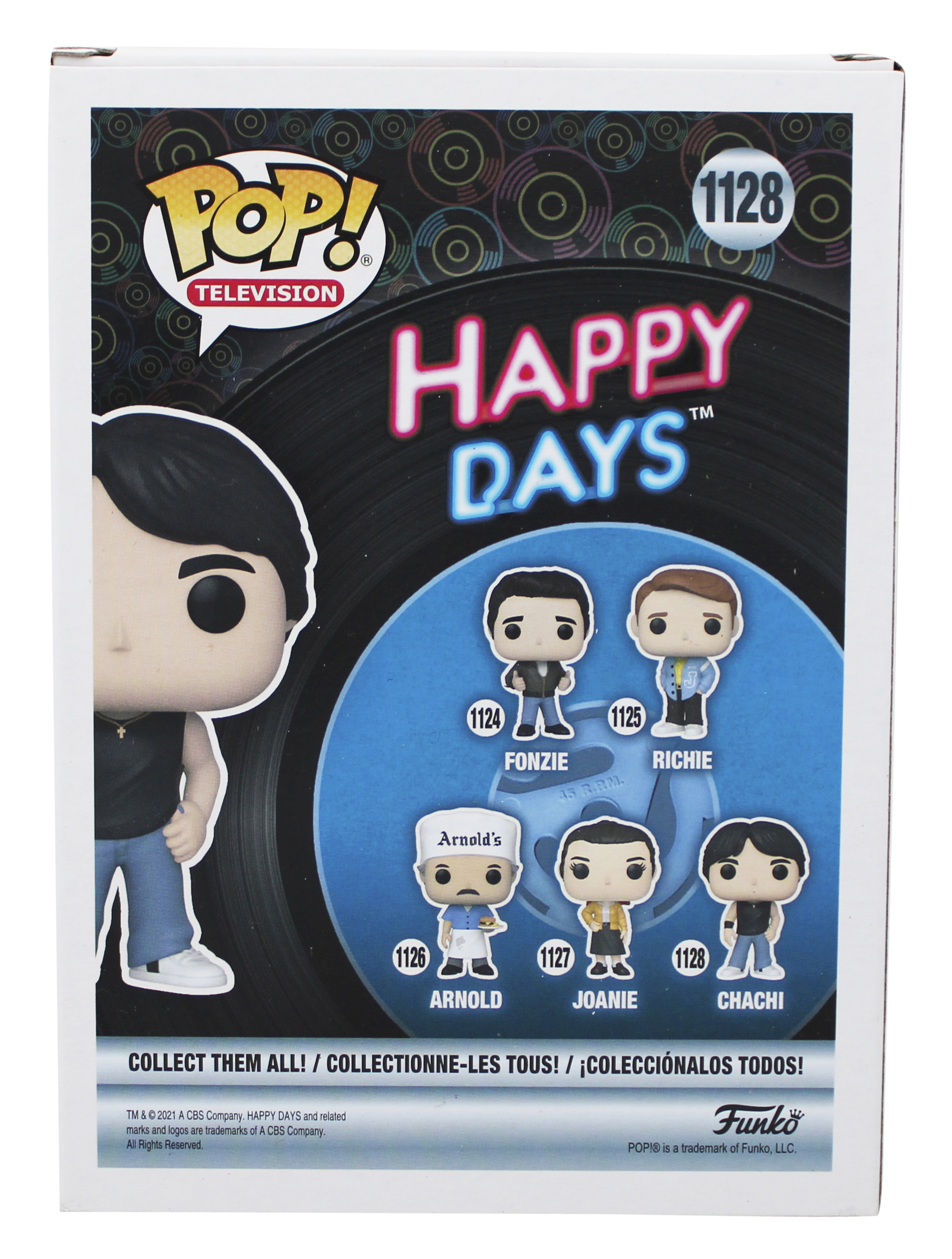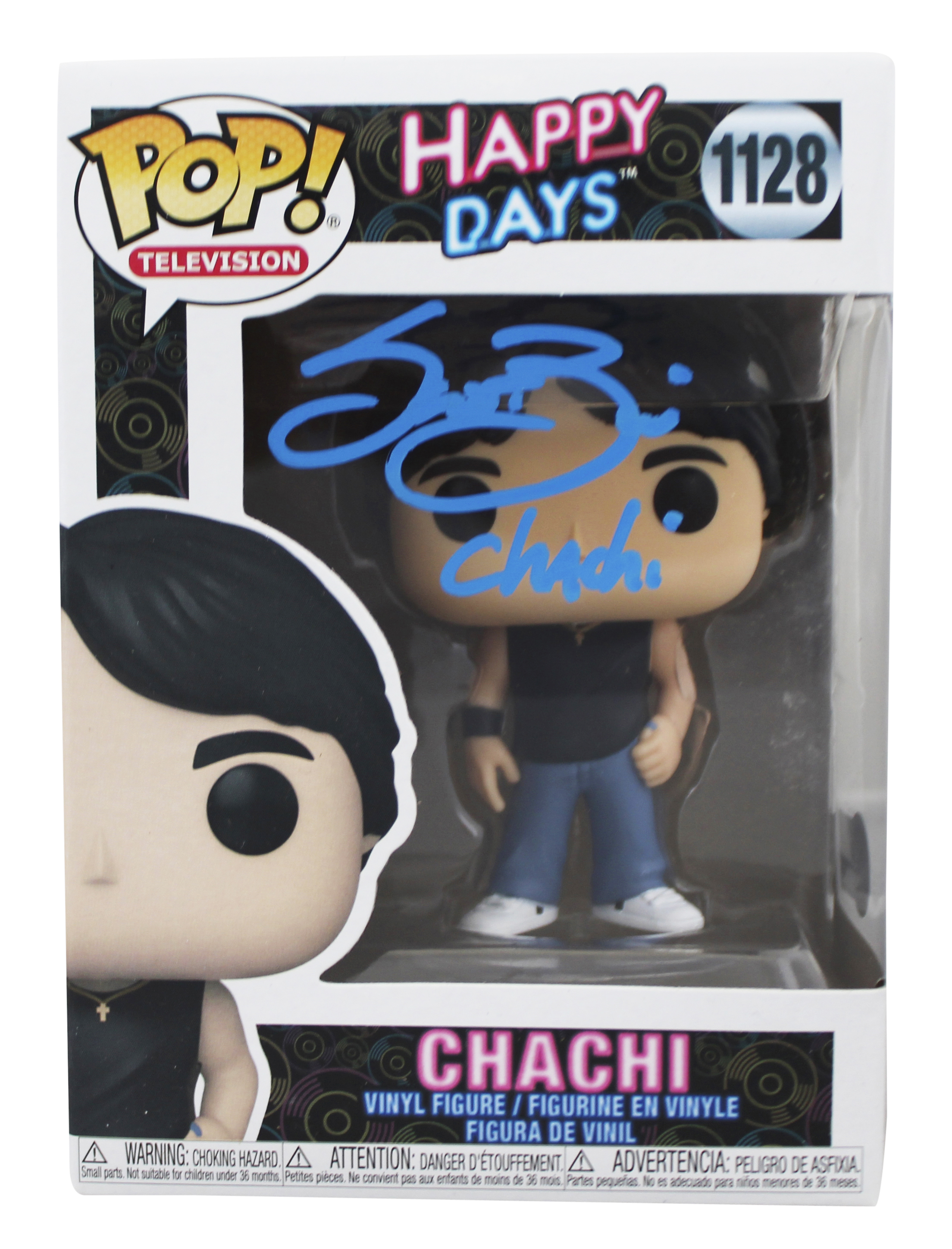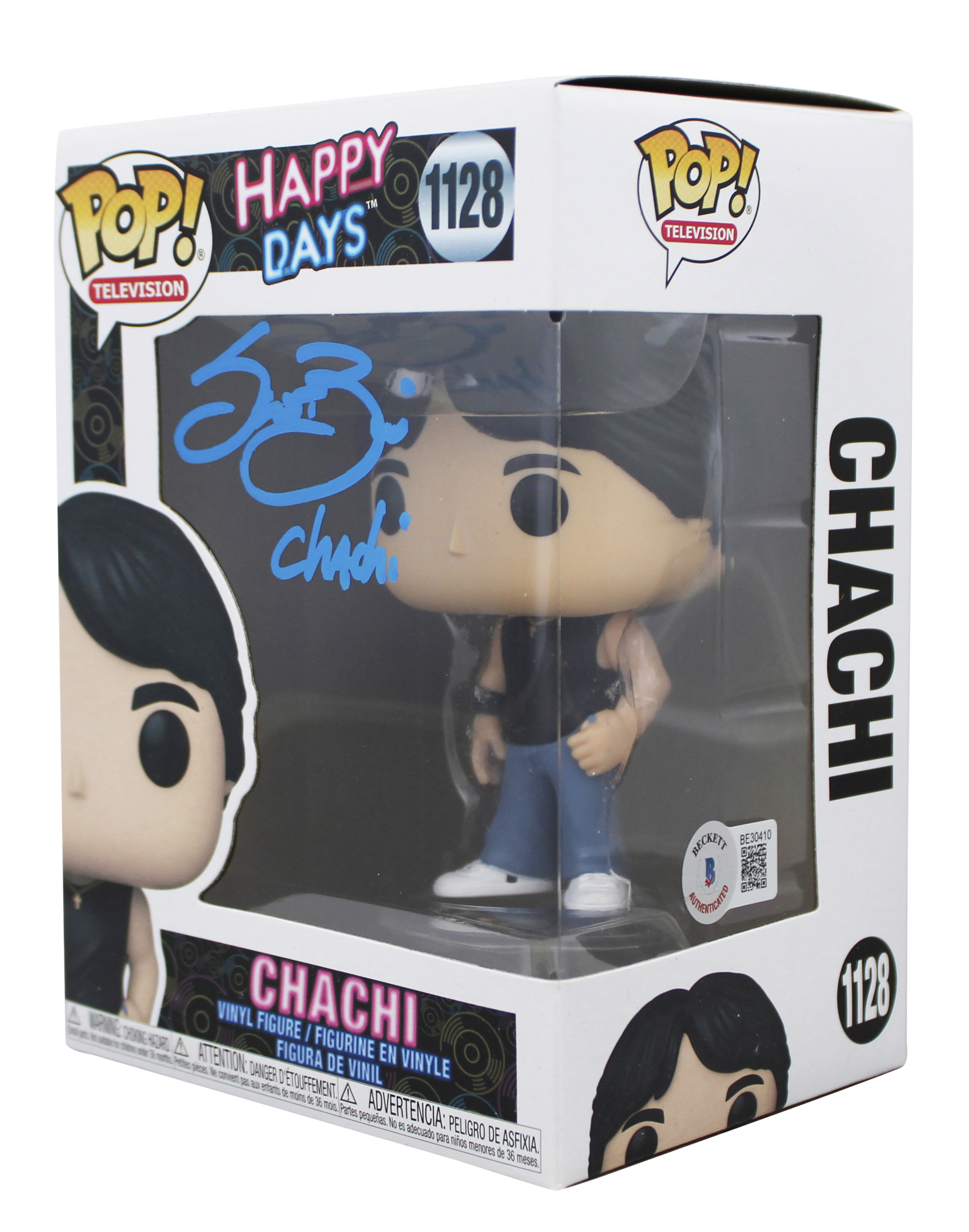 This Autographed Chachi #1128 Funko Pop Vinyl Figure with the inscription of "Chachi " has been Personally Signed by Scott Baio of Happy Days. This item is 100% Authentic to include a hologram by Beckett Authentication Services. This item will come with an affixed Beckett Authentication Services (BAS) authentication sticker, which includes a scannable QR code to verify authenticity. Please note that Beckett no longer provides serial-numbered COA cards, and the attached BAS sticker will serve as the complete authentication for this item. The authenticity can be verified on Beckett Authentication Services website. This item will ship in a Pop! Protector, please refer to the photos for condition of the item prior to purchase. This Funko is in good condition, but it would not be considered mint.