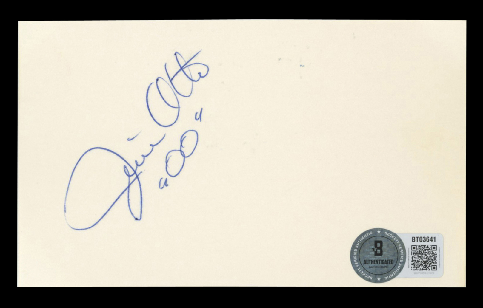 This Autographed 3x5 Index Card with the inscription of "00" has been Personally Signed by Jim Otto of the Oakland Raiders. This item is 100% Authentic to include a hologram by Beckett Authentication Services. This item will come with an affixed Beckett Authentication Services (BAS) authentication sticker, which includes a scannable QR code to verify authenticity. Please note that Beckett no longer provides serial-numbered COA cards, and the attached BAS sticker will serve as the complete authentication for this item. The authenticity can be verified on Beckett Authentication Services website.