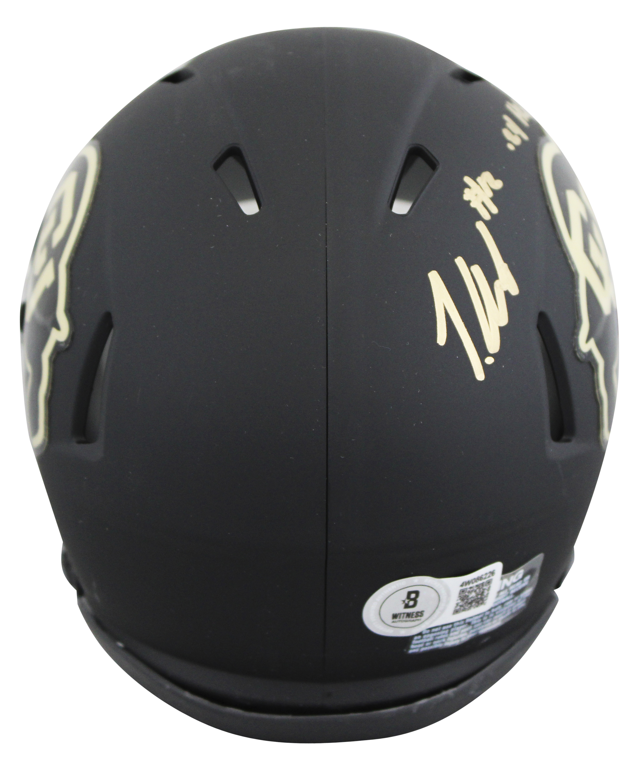 This Autographed Black Speed Mini Helmet with the inscription of "24 Heisman" has been Personally Signed by Travis Hunter of the Colorado Buffaloes. This item is 100% Authentic to include a hologram by Beckett Authentication Services. This item will come with an affixed Beckett Authentication Services (BAS) authentication sticker, which includes a scannable QR code to verify authenticity. Please note that Beckett no longer provides serial-numbered COA cards, and the attached BAS sticker will serve as the complete authentication for this item. This is a BAS Witnessed Protection Program item which means a Beckett Authentication Service representative was present when this item was being signed. We conducted an autograph signing with Travis Hunter where multiples of the same item were signed. While the photographs are representative of this item, the size, placement and strength of the signature may vary. Each item is hand signed, therefore, each autograph is unique. This item can be verified through BAS Witnessed.