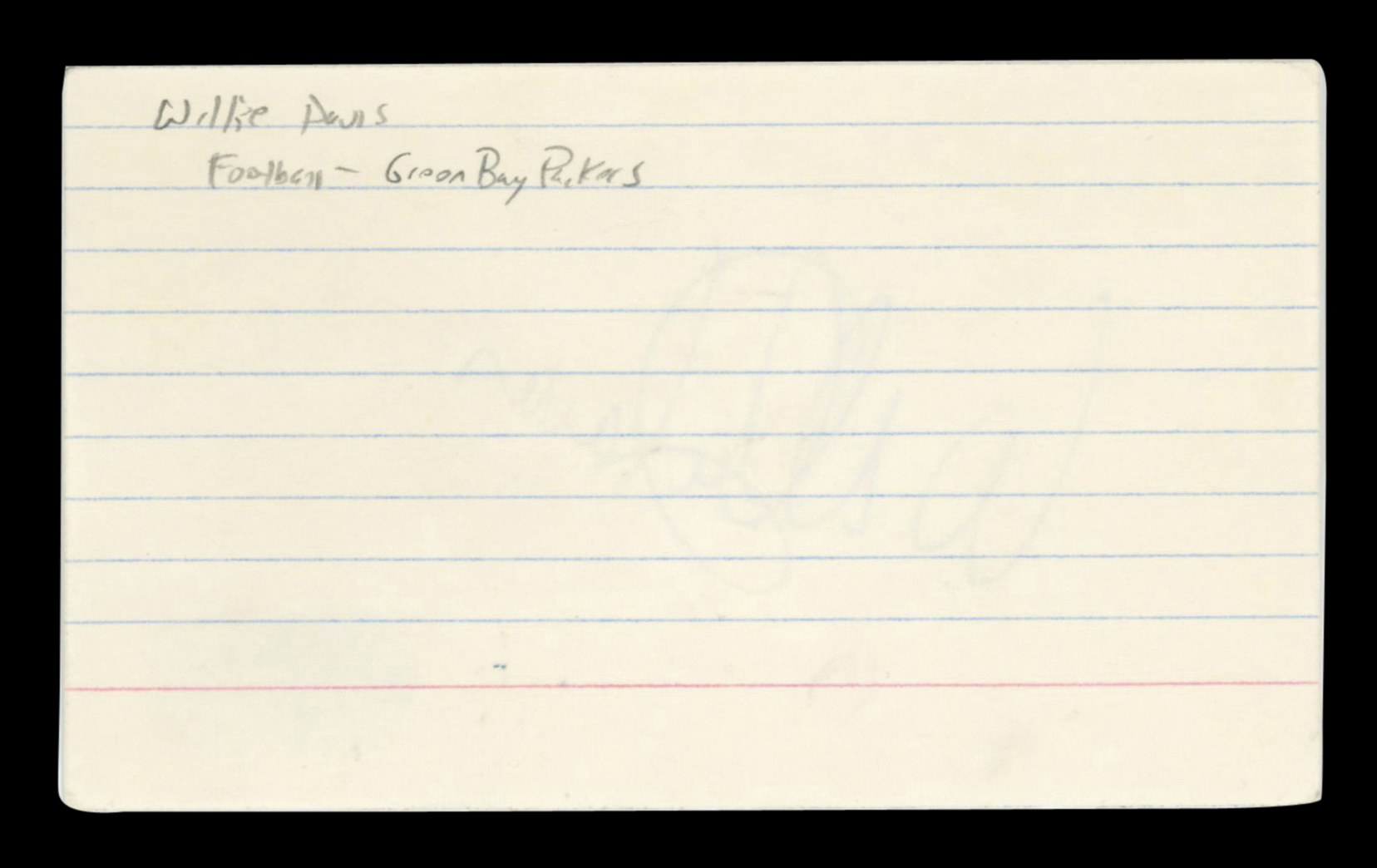 This Autographed 3x5 Index Card has been Personally Signed by Willie Davis of the Green Bay Packers. This item is 100% Authentic to include a hologram by Beckett Authentication Services. This item will come with an affixed Beckett Authentication Services (BAS) authentication sticker, which includes a scannable QR code to verify authenticity. Please note that Beckett no longer provides serial-numbered COA cards, and the attached BAS sticker will serve as the complete authentication for this item. The authenticity can be verified on Beckett Authentication Services website.