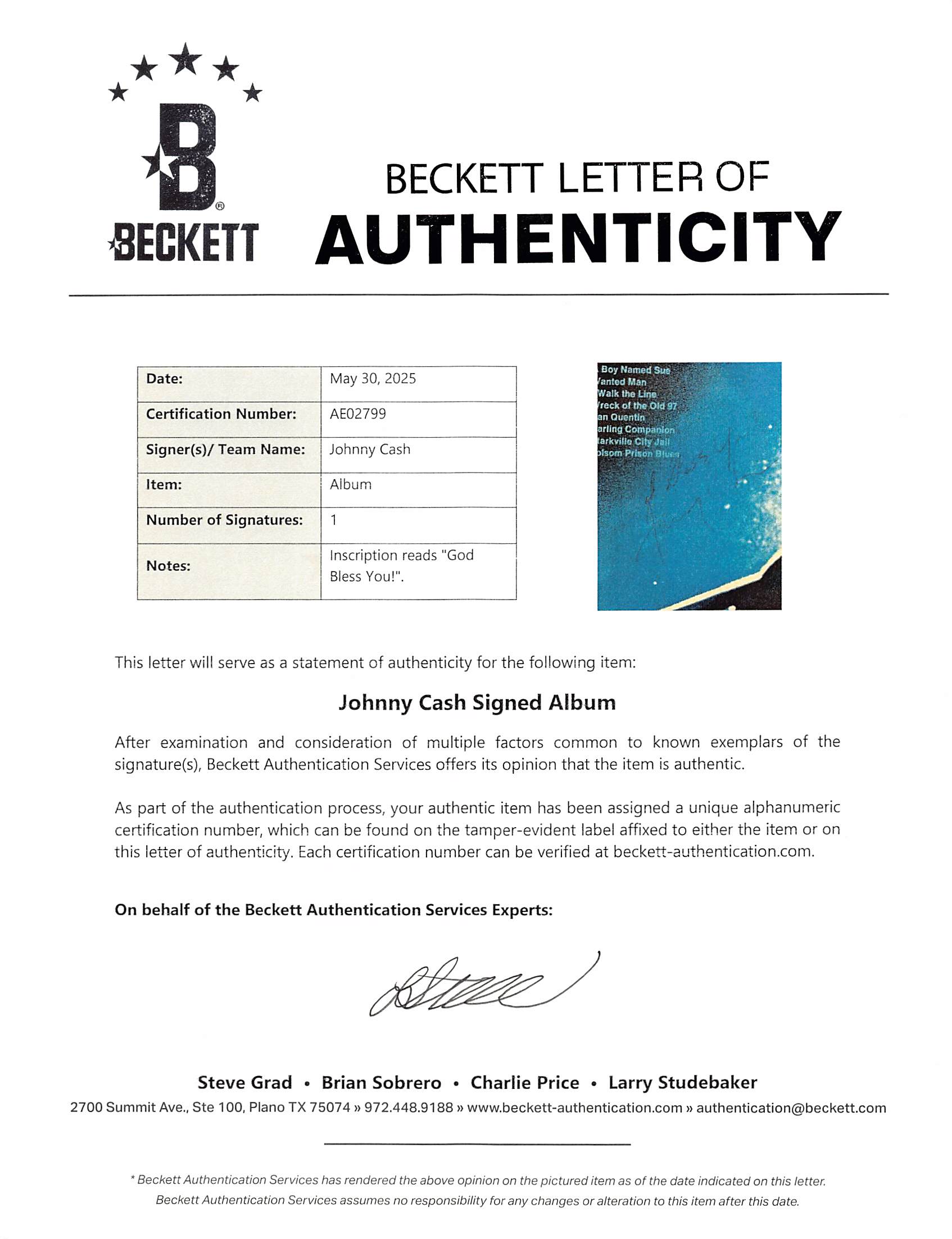 This Autographed Johnny Cash At San Quentin album cover w/ vinyl with the inscription of "God Bless You!" has been Personally Signed by Johnny Cash. This item is 100% Authentic to include a Certificate of Authenticity (COA) / hologram by Beckett Authentication Services.