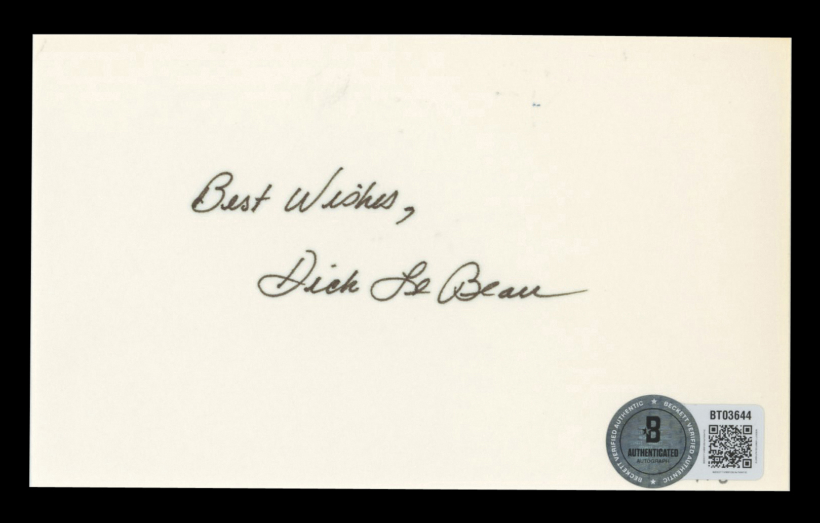 This Autographed 3x5 Index Card with the inscription of "Best Wishes" has been Personally Signed by Dick LeBeau of the Detroit Lions. This item is 100% Authentic to include a hologram by Beckett Authentication Services. This item will come with an affixed Beckett Authentication Services (BAS) authentication sticker, which includes a scannable QR code to verify authenticity. Please note that Beckett no longer provides serial-numbered COA cards, and the attached BAS sticker will serve as the complete authentication for this item. The authenticity can be verified on Beckett Authentication Services website.