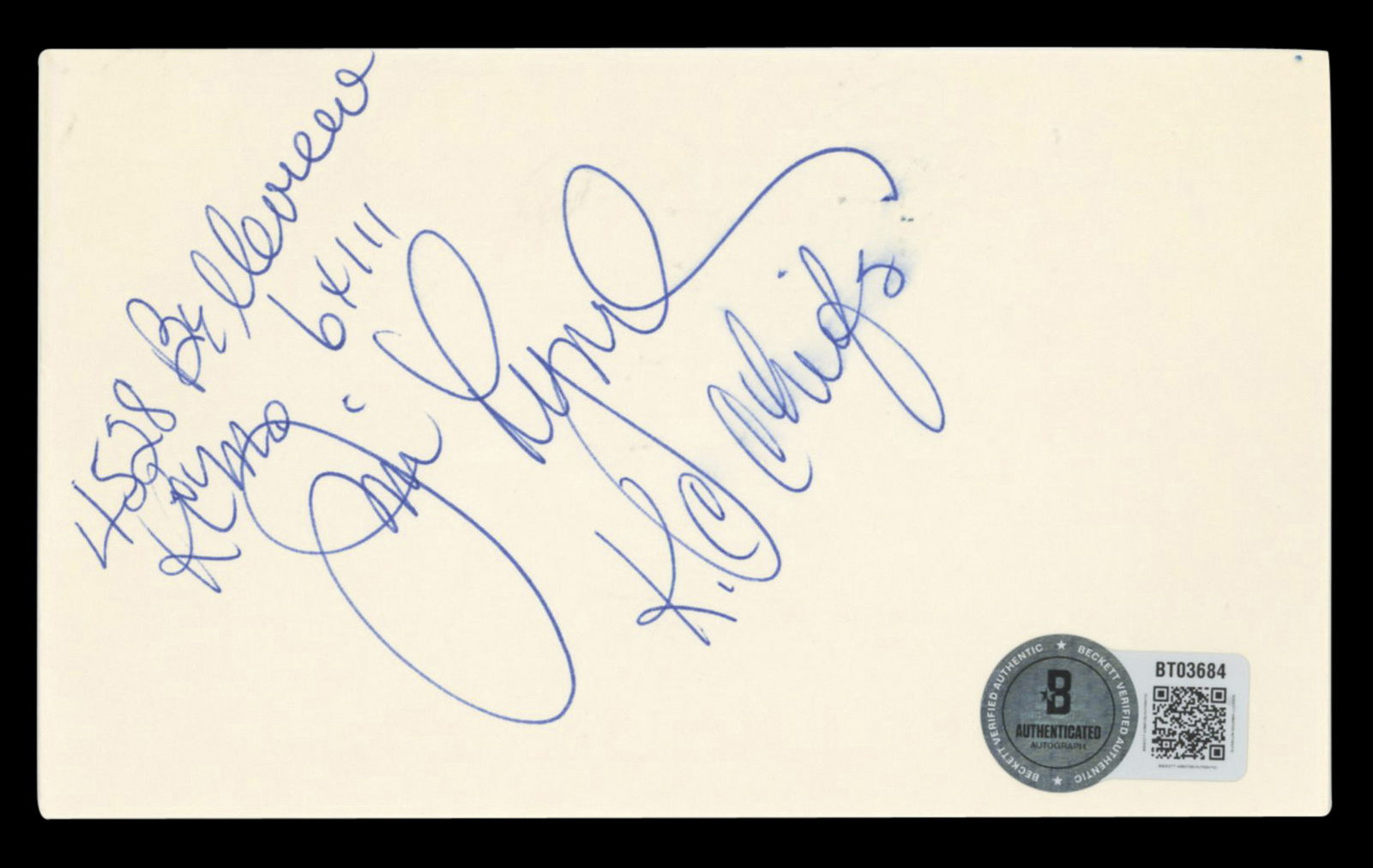 This Autographed 3x5 Index Card with the inscription of "KC Chiefs" has been Personally Signed by Jim Lynch of the Kansas City Chiefs. This item is 100% Authentic to include a hologram by Beckett Authentication Services. This item will come with an affixed Beckett Authentication Services (BAS) authentication sticker, which includes a scannable QR code to verify authenticity. Please note that Beckett no longer provides serial-numbered COA cards, and the attached BAS sticker will serve as the complete authentication for this item. The authenticity can be verified on Beckett Authentication Services website.