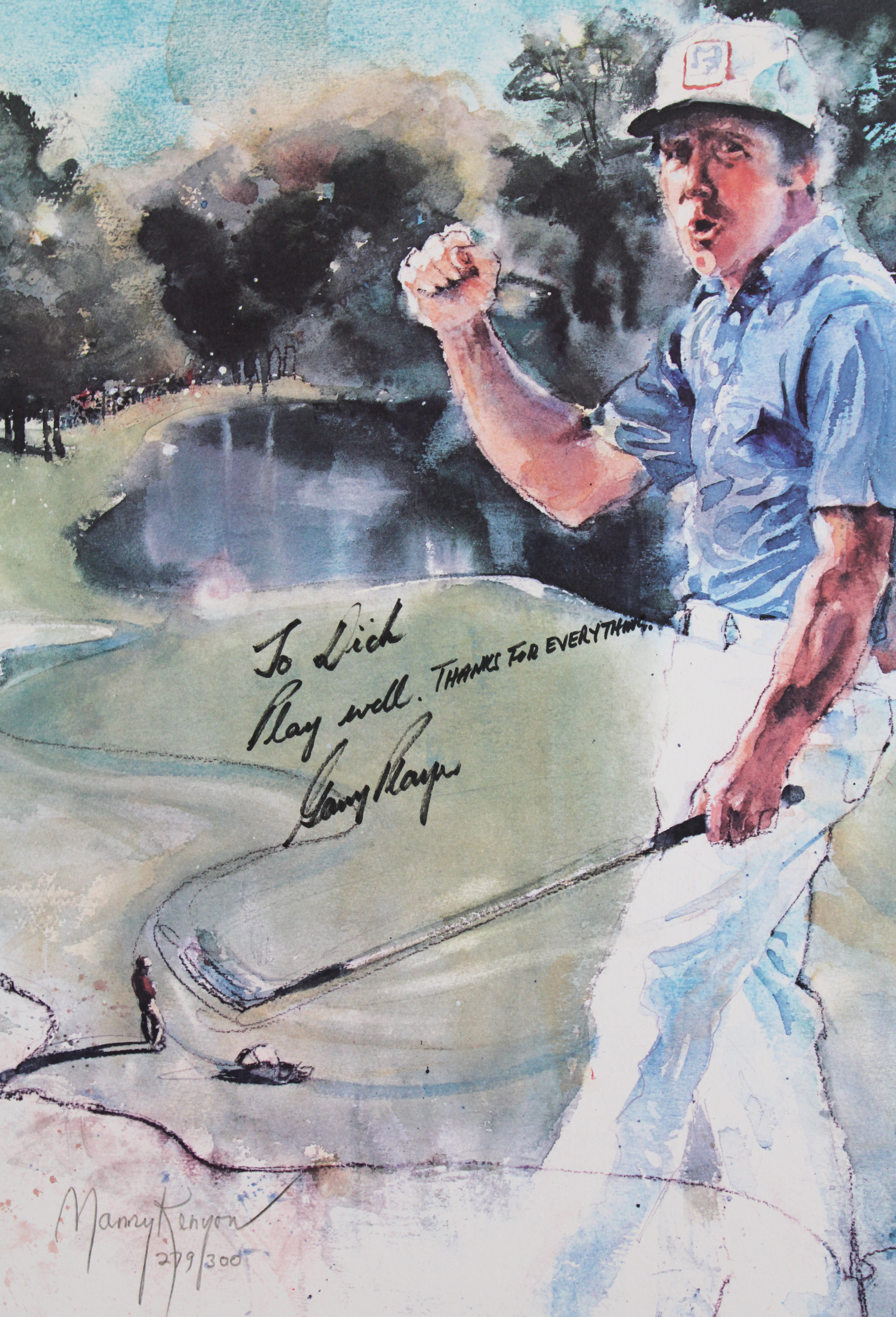 This Autographed 18x22 Lithograph with the inscription of "To Dick, Play Well. Thanks For Everything (Player)" has been Personally Signed by Gary Player & Ann Manry Kenyon. This item is 100% Authentic to include a Certificate of Authenticity (COA) / hologram by Beckett Authentication Services. The authenticity can be verified on Beckett Authentication Services website. There is wear throughout and some light moisture damage along the edges. Please refer to photos for condition prior to purchase.