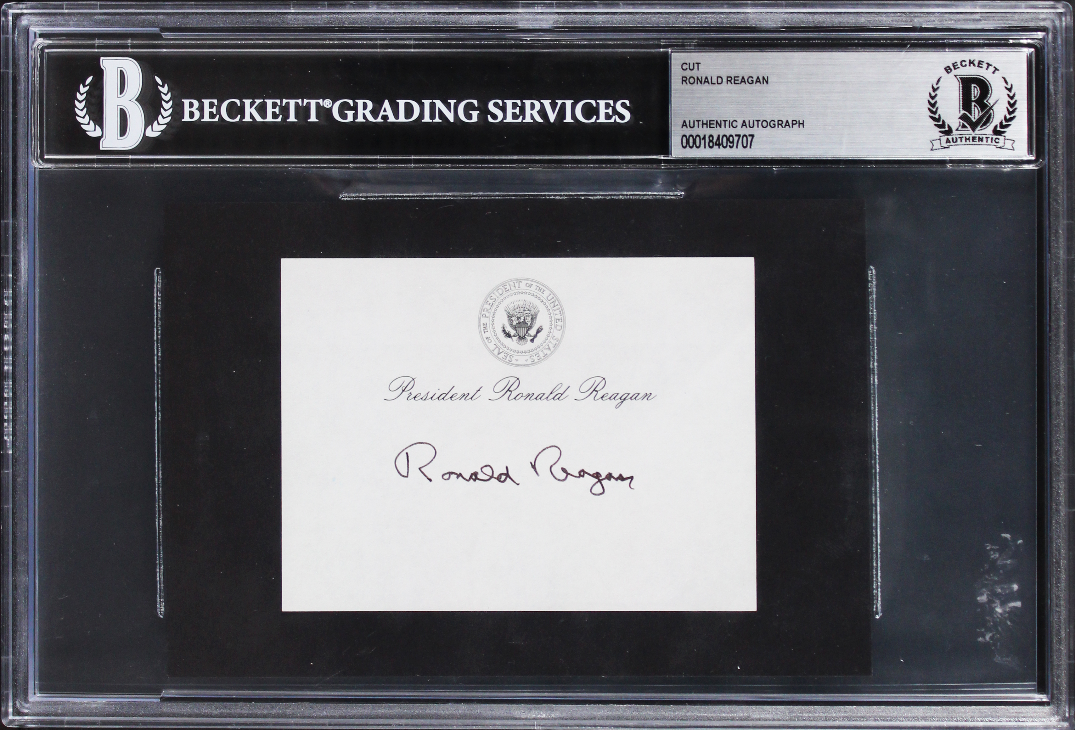 This Autographed 3x4 Cut Signature has been Personally Signed by Ronald Reagan. This item is 100% Authentic, it comes slabbed and authenticated by Beckett Authentication Services. The authenticity can be verified on Beckett Authentication Services website.