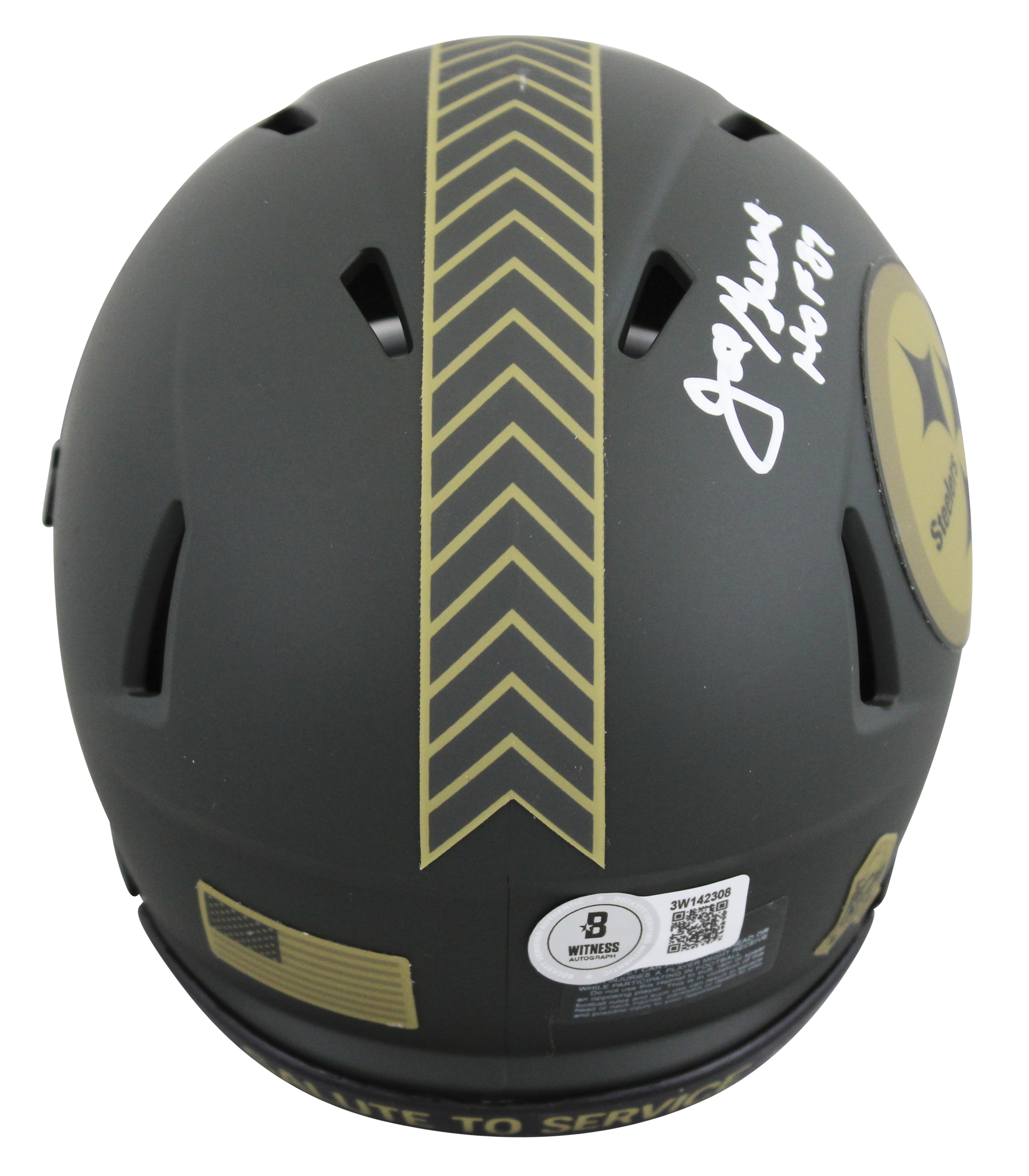 This Autographed Alternate 2025 Salute to Service IV Speed Mini Helmet W/ Uv Mirrored Back Acrylic Display Case with the inscription of "HOF 87" has been Personally Signed by Joe Greene of the Pittsburgh Steelers. This item is 100% Authentic to include a hologram by Beckett Authentication Services. This item will come with an affixed Beckett Authentication Services (BAS) authentication sticker, which includes a scannable QR code to verify authenticity. Please note that Beckett no longer provides serial-numbered COA cards, and the attached BAS sticker will serve as the complete authentication for this item. This is a BAS Witnessed Protection Program item which means a Beckett Authentication Service representative was present when this item was being signed. We conducted an autograph signing with Joe Greene where multiples of the same item were signed. While the photographs are representative of this item, the size, placement and strength of the signature may vary. Each item is hand signed, therefore, each autograph is unique. This item can be verified through BAS Witnessed.
