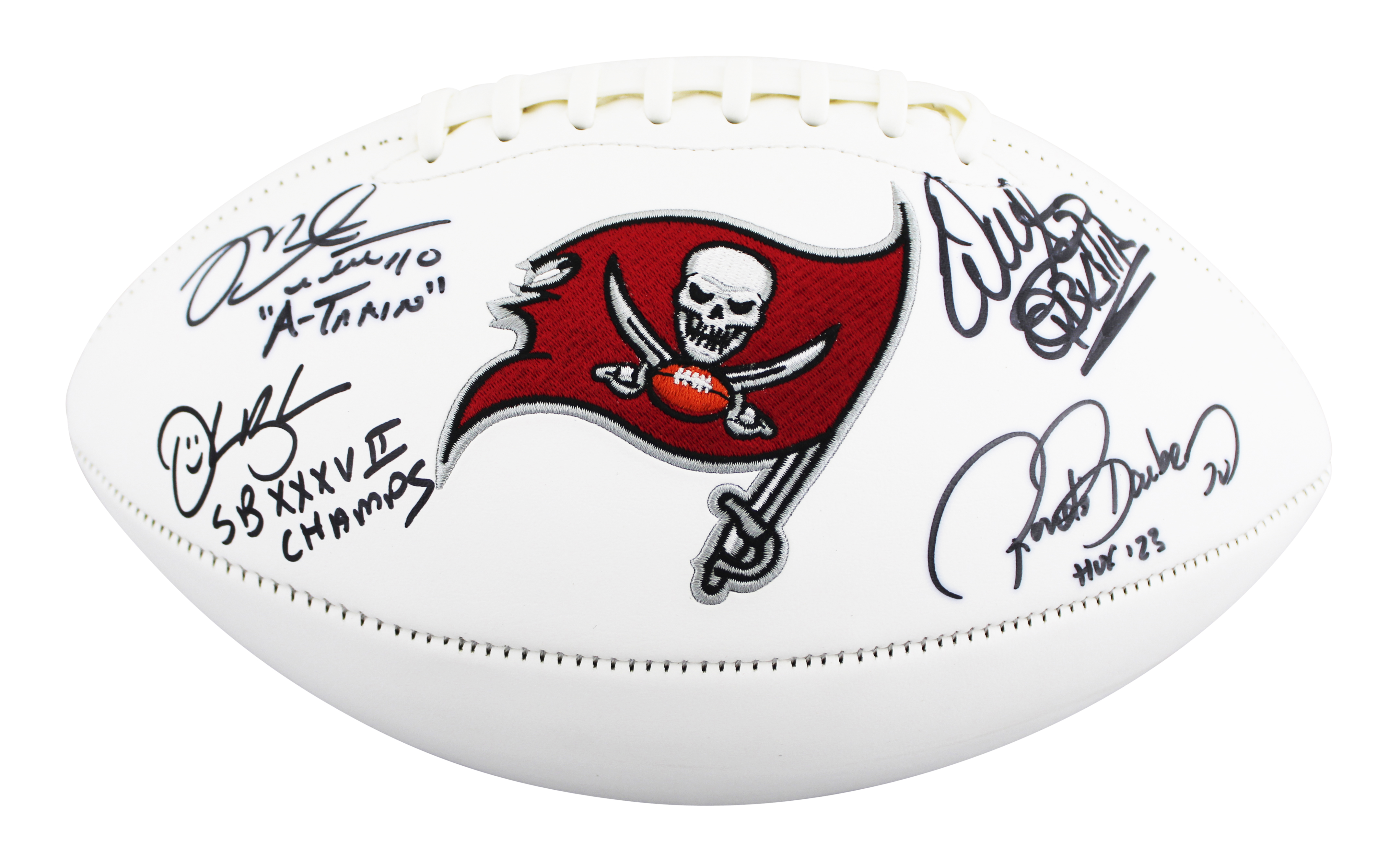 This Autographed Wilson White Panel Logo Football with the inscription of "QB Killa (Sapp), HOF 23 (Barber), A-Train (Alstott), SB XXXVII Champs (Brooks)" has been Personally Signed by Warren Sapp, Ronde Barber, Mike Alstott & Derrick Brooks of the Tampa Bay Buccaneers. This item is 100% Authentic to include a hologram by Beckett Authentication Services. This item will come with an affixed Beckett Authentication Services (BAS) authentication sticker, which includes a scannable QR code to verify authenticity. Please note that Beckett no longer provides serial-numbered COA cards, and the attached BAS sticker will serve as the complete authentication for this item. This is a BAS Witnessed Protection Program item which means a Beckett Authentication Service representative was present when this item was being signed. We conducted an autograph signing with Warren Sapp, Ronde Barber, Mike Alstott & Derrick Brooks where multiples of the same item were signed. While the photographs are representative of this item, the size, placement and strength of the signature may vary. Each item is hand signed, therefore, each autograph is unique. This item can be verified through BAS Witnessed.