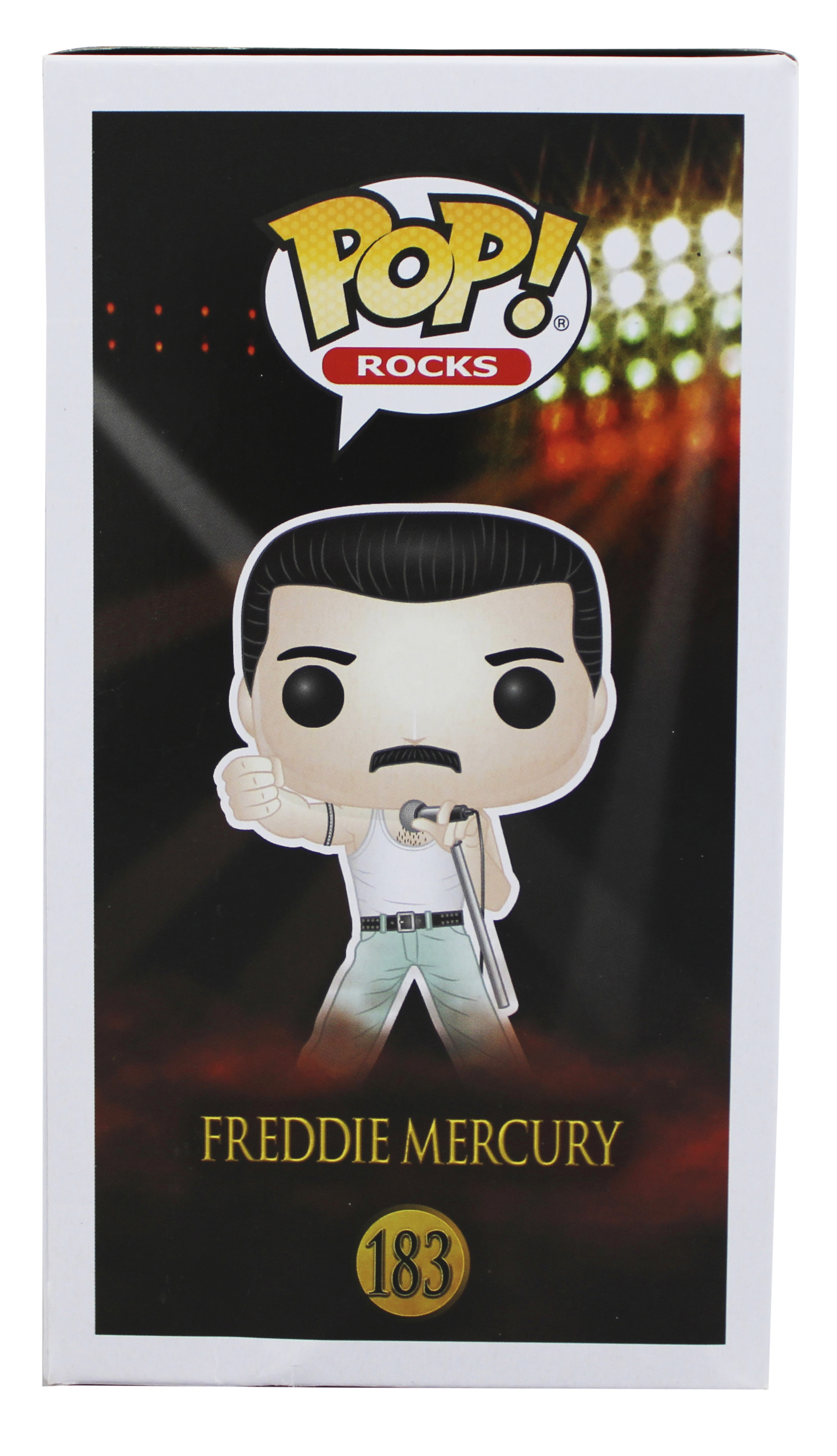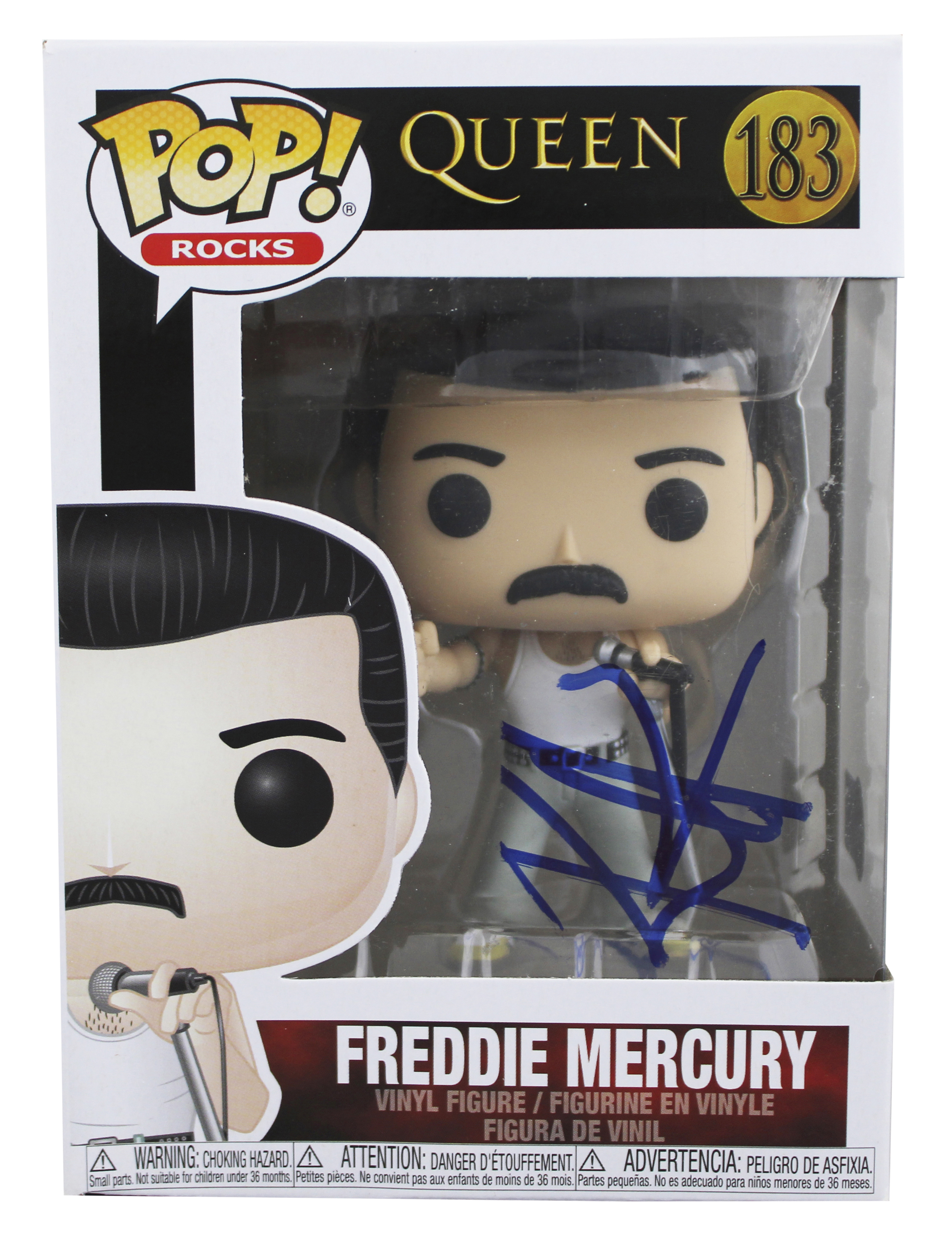 This Autographed Freddie Mercury #183 Funko Pop Vinyl Figure has been Personally Signed by Rami Malek of Bohemian Rhapsody. This item is 100% Authentic to include a hologram by Beckett Authentication Services. This item will come with an affixed Beckett Authentication Services (BAS) authentication sticker, which includes a scannable QR code to verify authenticity. Please note that Beckett no longer provides serial-numbered COA cards, and the attached BAS sticker will serve as the complete authentication for this item. The authenticity can be verified on Beckett Authentication Services website. This item will ship in a Pop! Protector, please refer to the photos for condition of the item prior to purchase. The back panel has some creasing and tears.