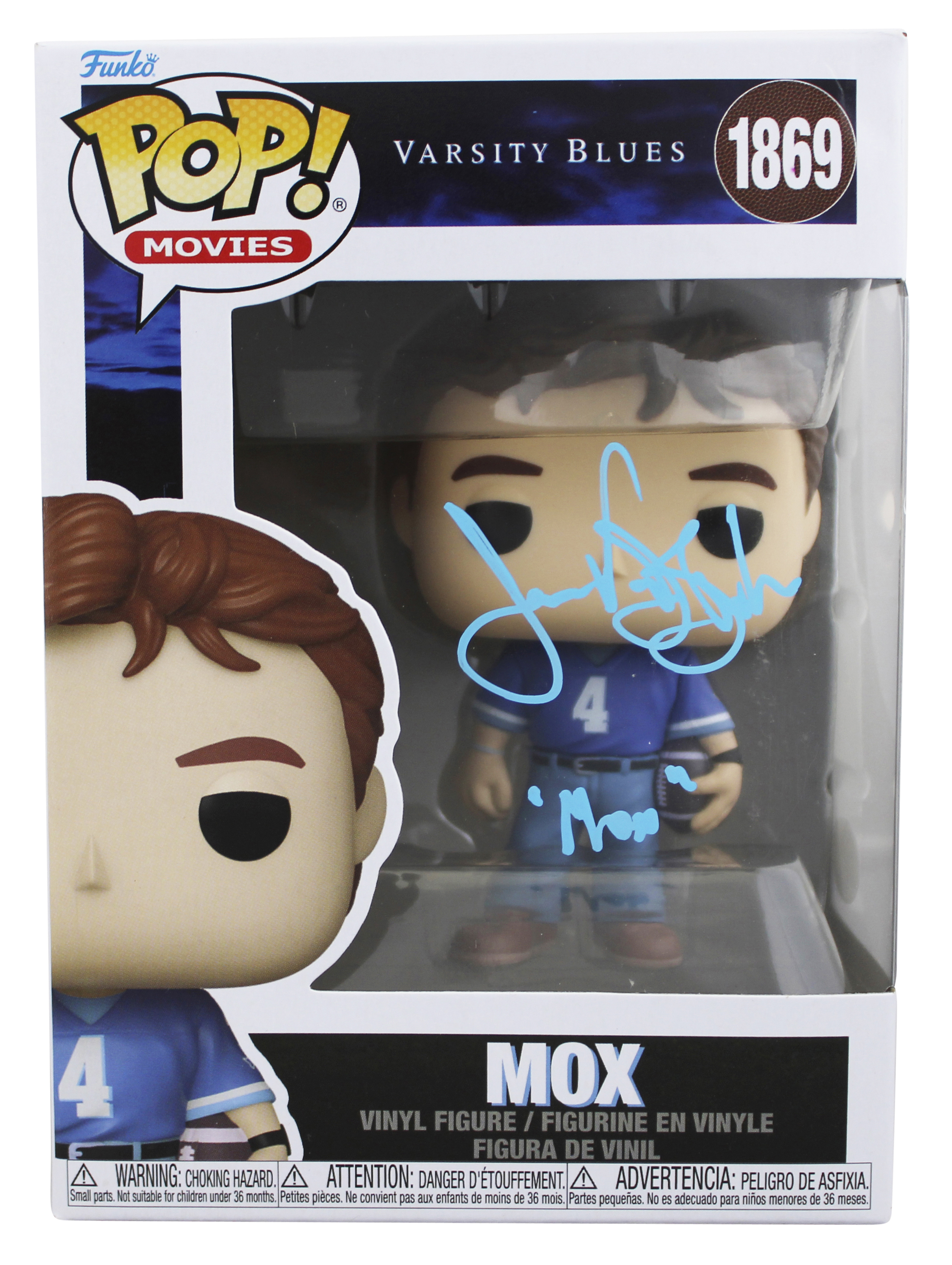 This Autographed Mox #1869 Funko Pop Vinyl Figure with the inscription of "Mox" has been Personally Signed by James Van Der Beek of Varsity Blues. This item is 100% Authentic to include a Certificate of Authenticity (COA) / hologram by JSA. The authenticity can be verified on JSA website. This will be shipped in a Pop Protector, each will have some handling wear from shipment to the signing and back. These would not be considered mint. Please refer to photos for item's condition prior to purchase.