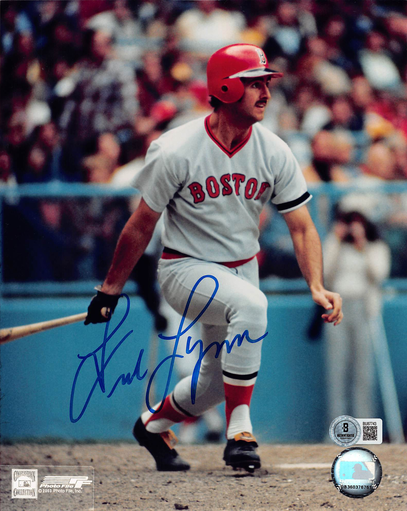 This Autographed Vertical 8x10 Photo has been Personally Signed by Fred Lynn of the Boston Red Sox. This item is 100% Authentic to include a hologram by Beckett Authentication Services. This item will come with an affixed Beckett Authentication Services (BAS) authentication sticker, which includes a scannable QR code to verify authenticity. Please note that Beckett no longer provides serial-numbered COA cards, and the attached BAS sticker will serve as the complete authentication for this item. We have multiples of this same item. While the photographs are representative of this item, the size, placement and strength of the signature may vary. Each item is hand signed, therefore, each autograph is unique.